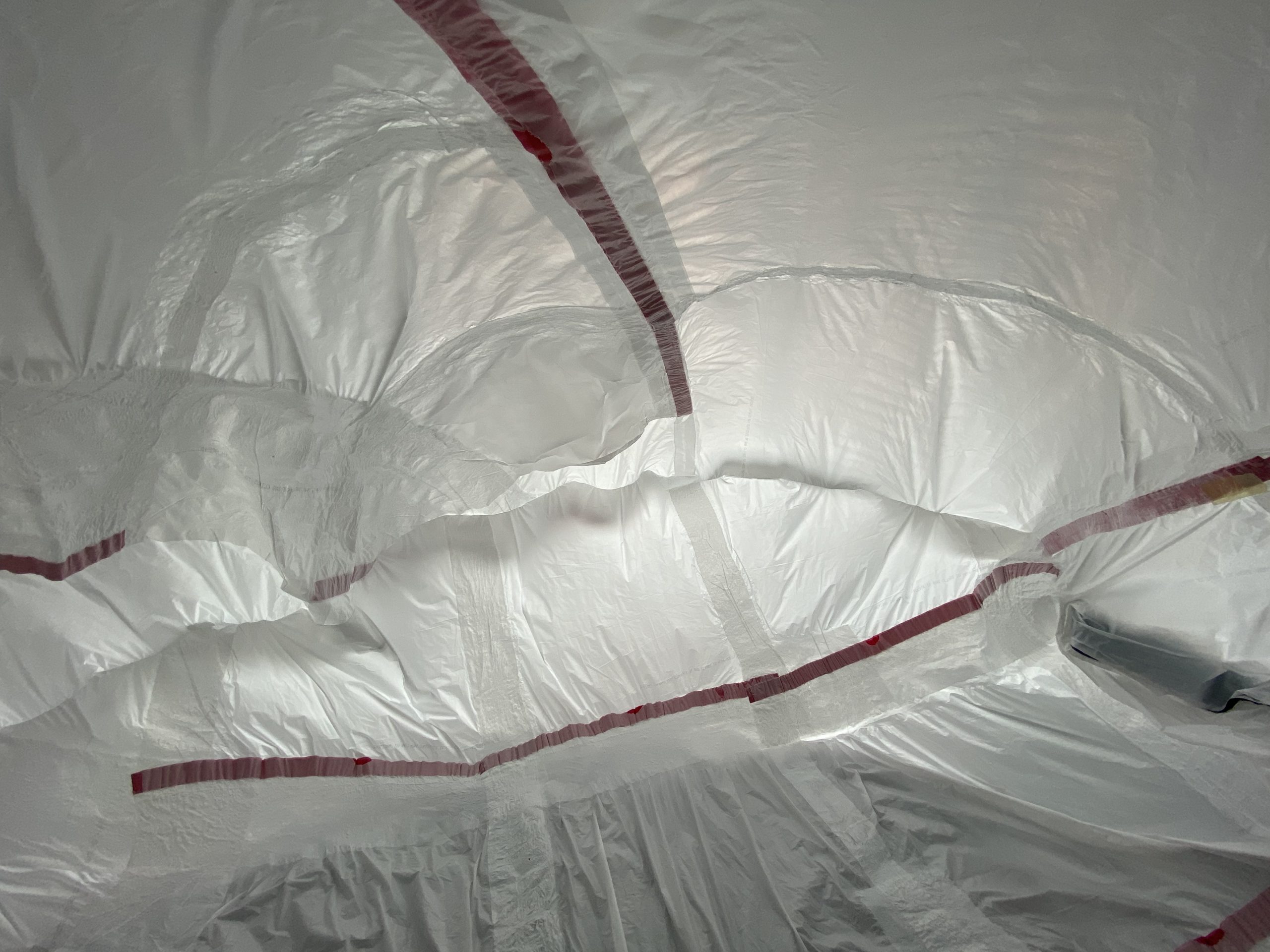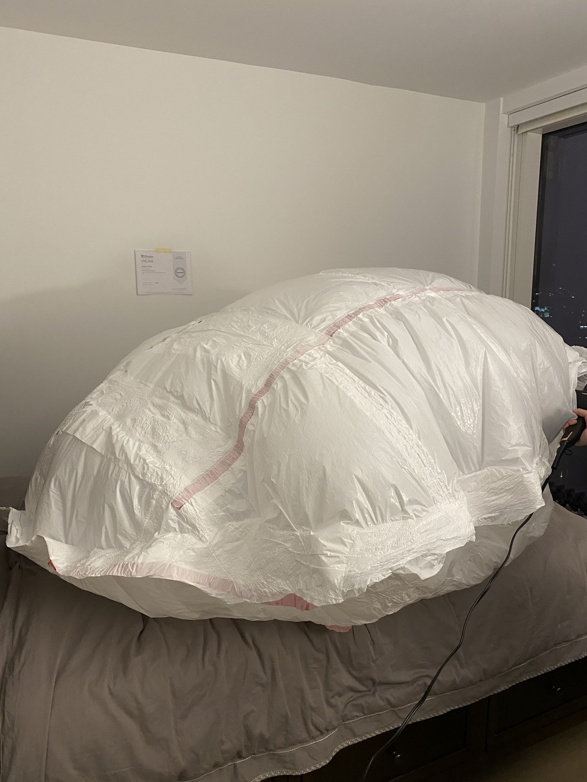 Professor Hickman especially emphasized concepts of being able to live in and portability. After the professor showed us how did previous students do for this project, I was inspired by their perspective and the sense of narrative. Additionally, the word membrane sparkled to me. Therefore, I decided to take an inflatable approach, and the idea was to create a sense of being trapped in the air-tide and isolating structure, a structure left me with no other connection to the outside world but a tube which feeds me oxygen. A metaphoric piece that I thought would be a great analogy of the current social-distancing situation. Bearing the narrative in my mind, I also wrote two mini-paragraph expressing my feeling, one written when I spent 20 minutes inside the structure and the other one at 40 minutes.