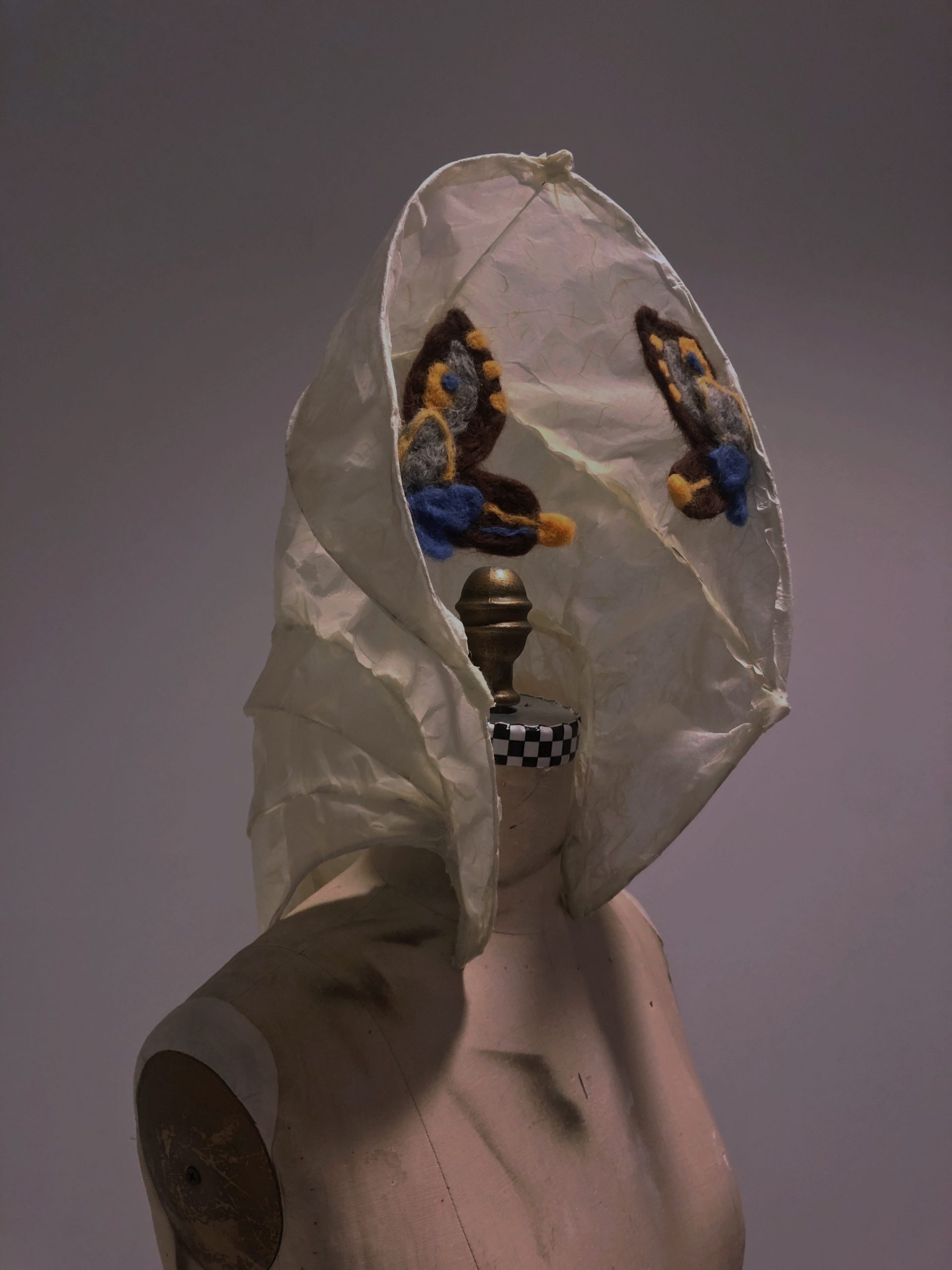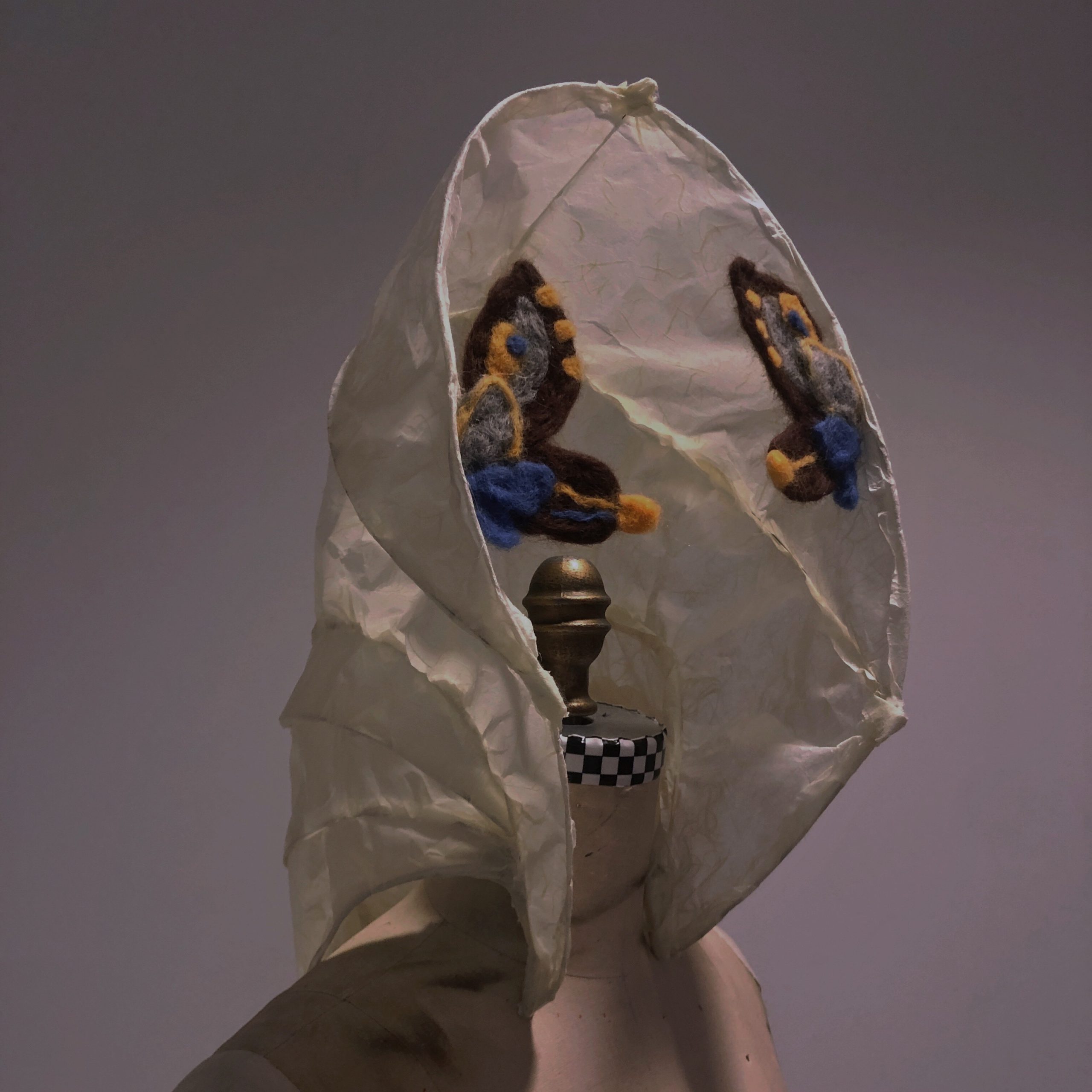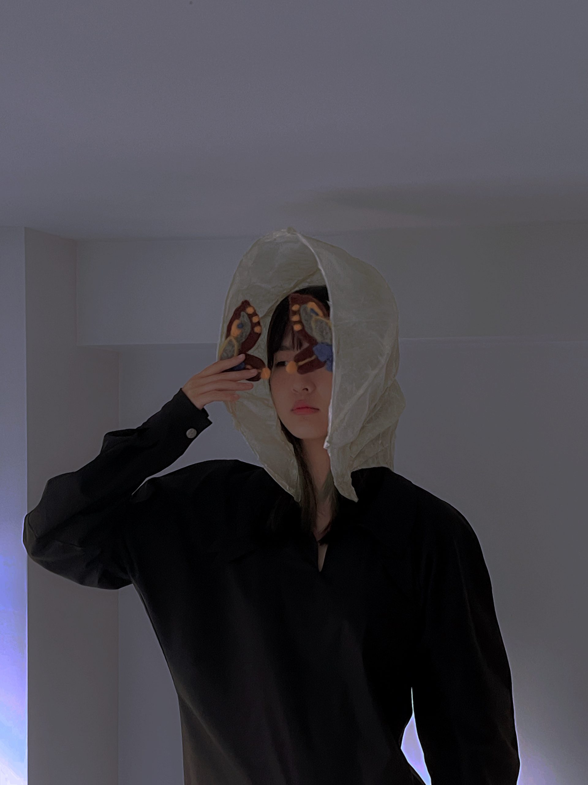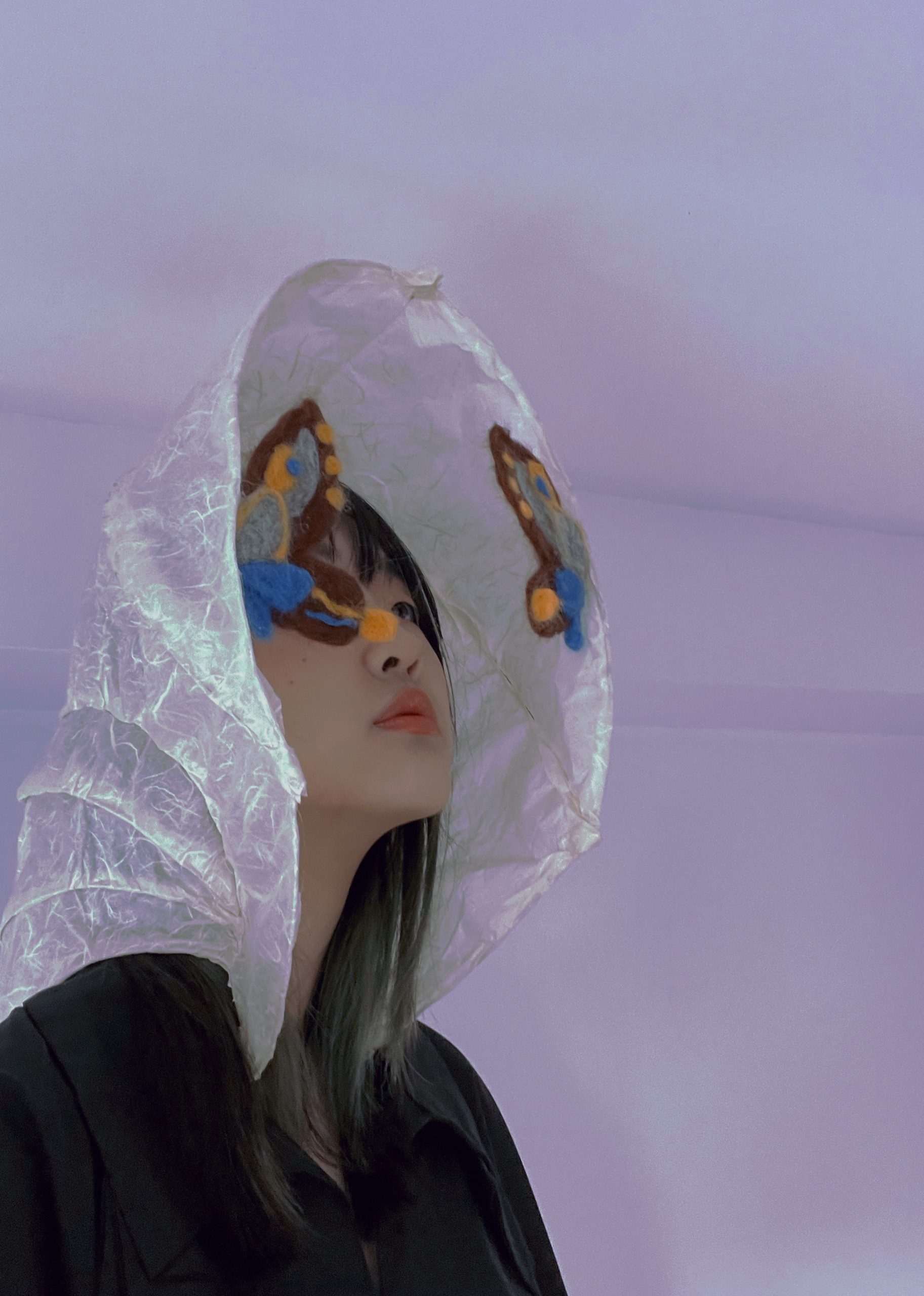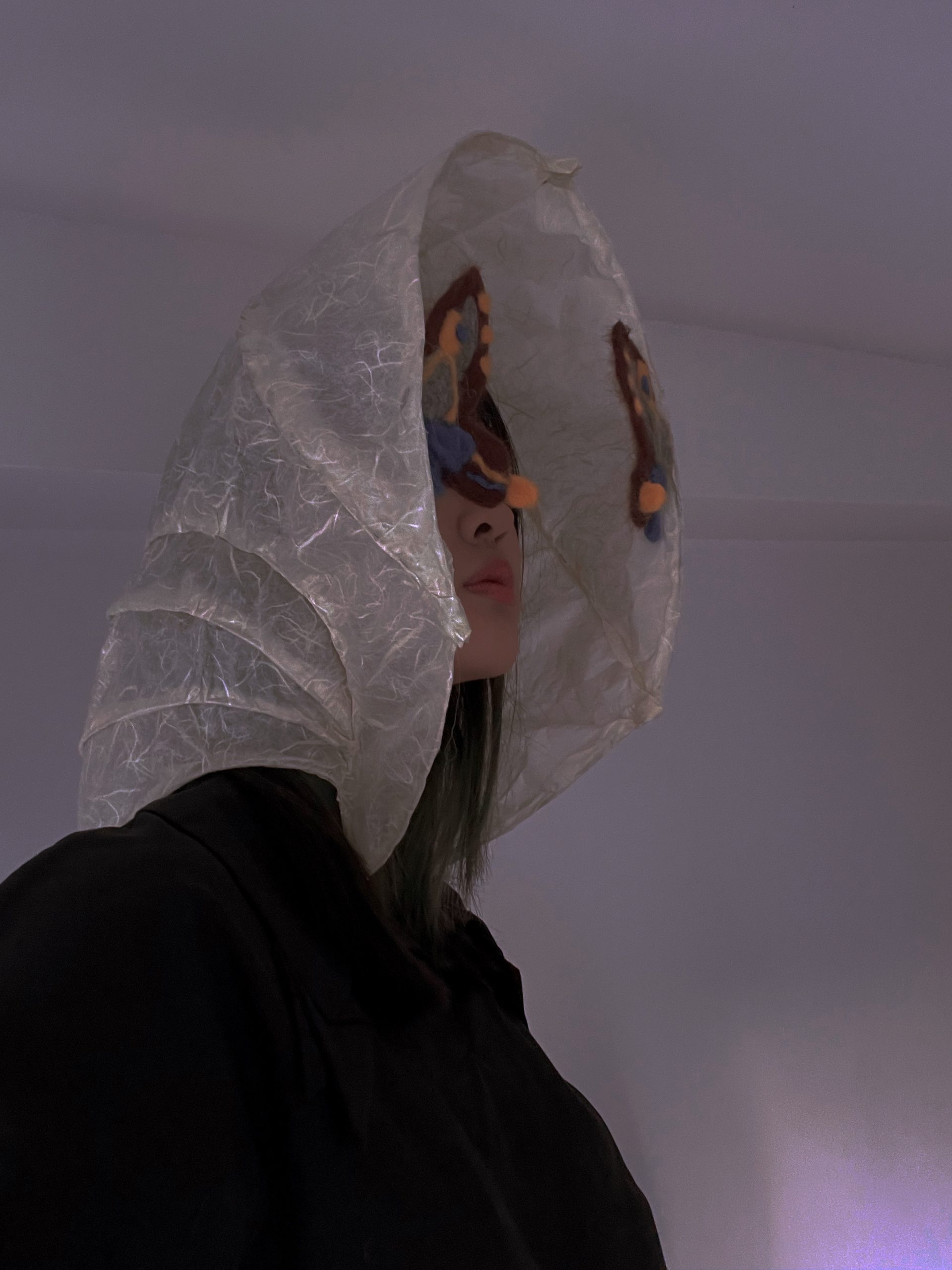 The fear of the partner I interviewed is aging, insects, and crowded places. And his fascination is psychology and the unknown future. I also learned from the interview that he was an introvert who liked to be quiet with headphones. Thus, I chose “Renascence, metamorphosis (insect)” as my theme. I decided to design a wearable that can inspire my partner to look at his fears from a different perspective. Specifically, instead of warning him not to be immersed in a pessimistic view and lament the shortness of life, I wish my wearable can bring encouragement to him, and inspire him to look forward to the excitement and brilliance that a limited life can be. In a way, a positive attitude will strengthen his confidence and composure in the face of difficulties and his fears. The basic concept for this project is to integrate the ideas of “butterfly’s beauty and its short life cycle”, “human’s consciousness and mental development”, and “introvert’s private space and self-recovery”. It’s designed as a semi-open hood, and a headcover. It not only serves as a defense to keep out the vulgarity and hostility from the crowded society but also leaves you a private space of tranquility for self-recovery. Just as life transforms into cocoons, preparing for the moment of glamorous, under appearances, our inner selves are also evolving through constant self-reflection.