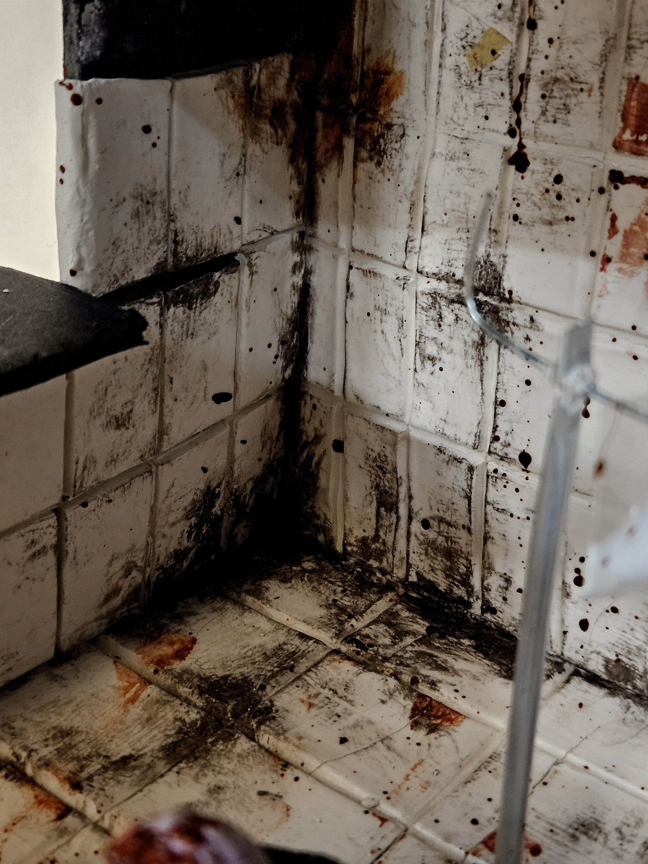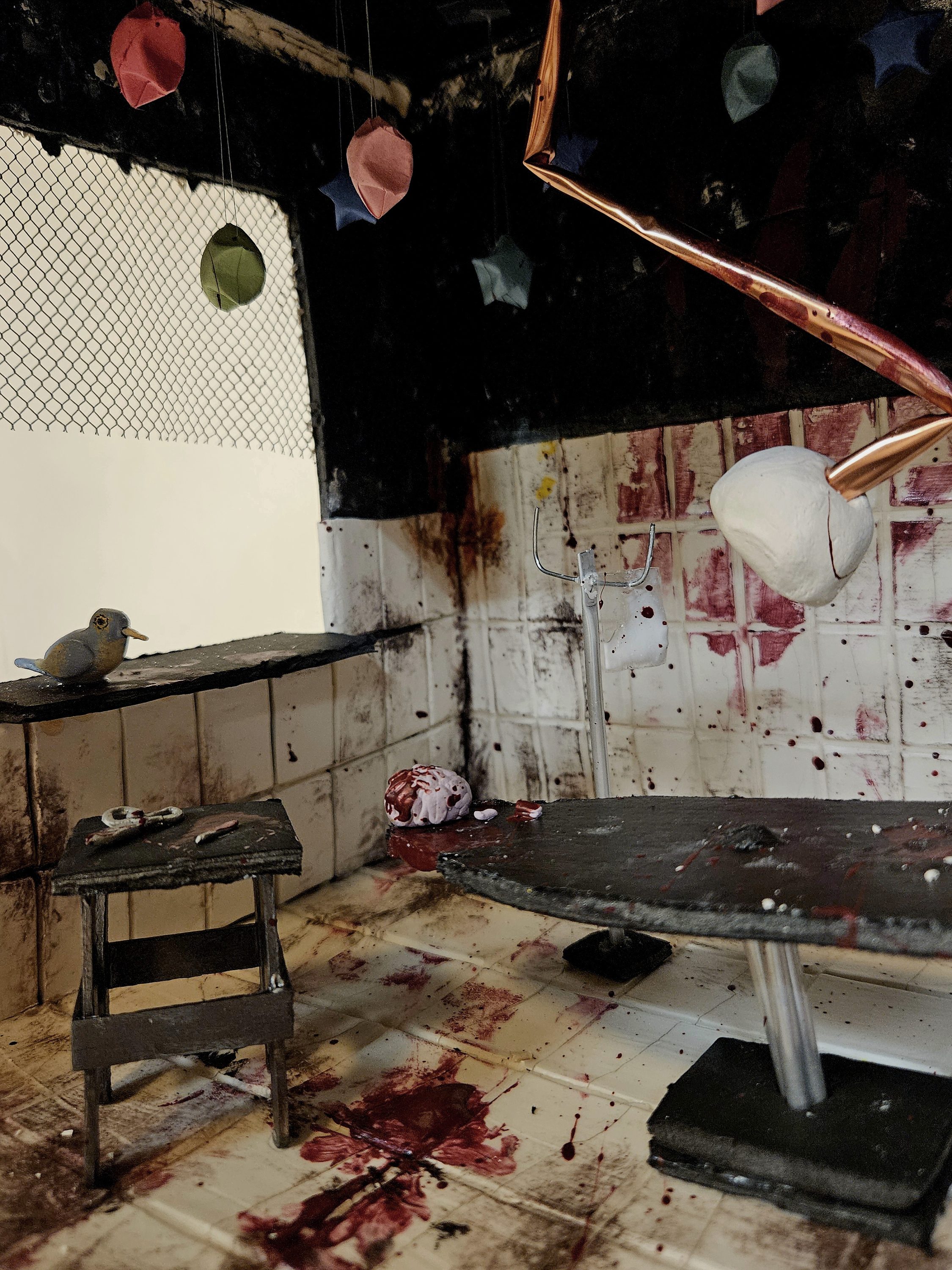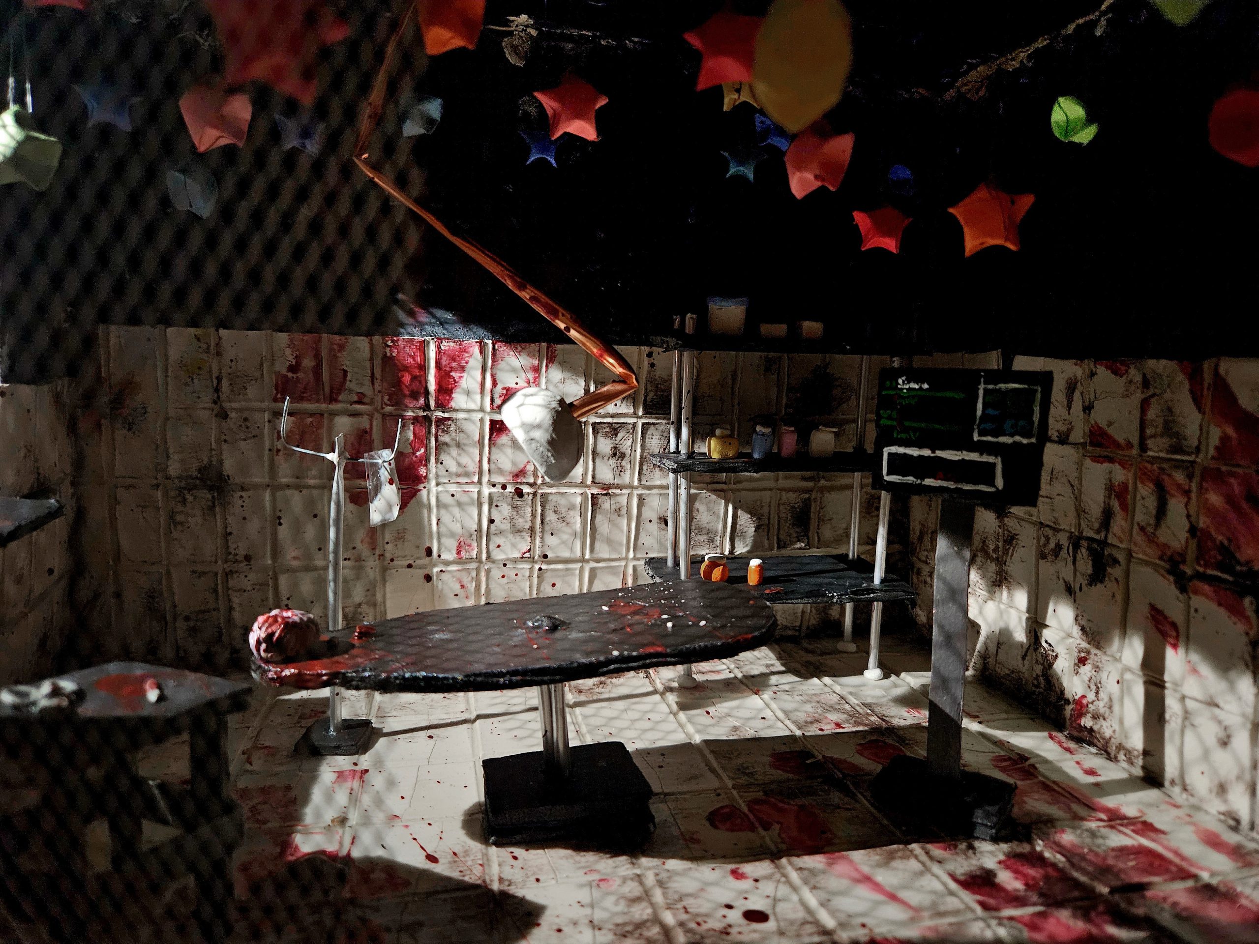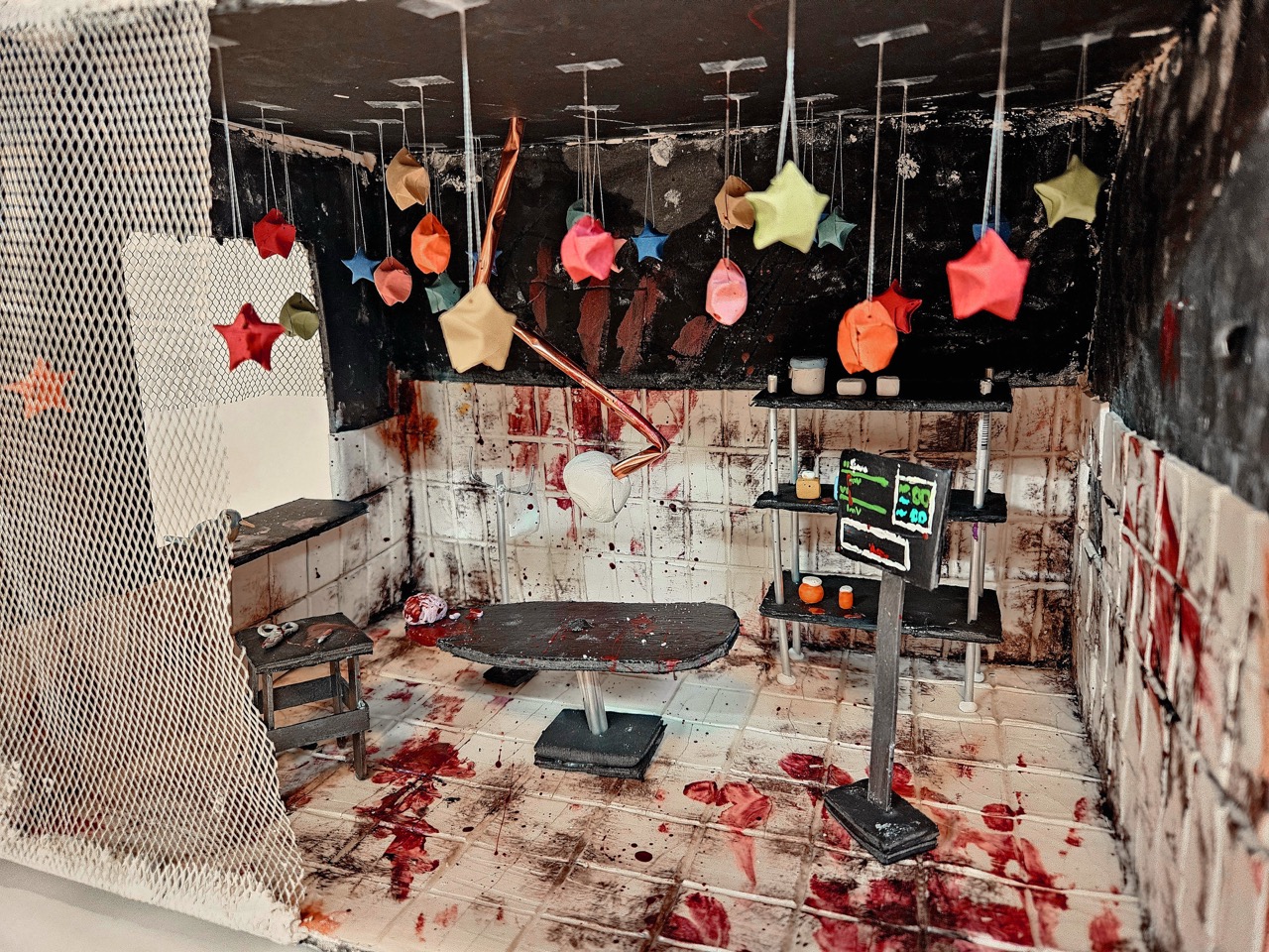 The structure is a black cardboard/foam material held with paper clay, which caused some warping. Air-dry clay tiles, wire and cardboard makes the room. Furniture, tools and the cuckoo bird are clay or cardboard. Acrylic paint adds color and “blood.” Paper stars reflect personal memory. Exterior uses net wire and clay.