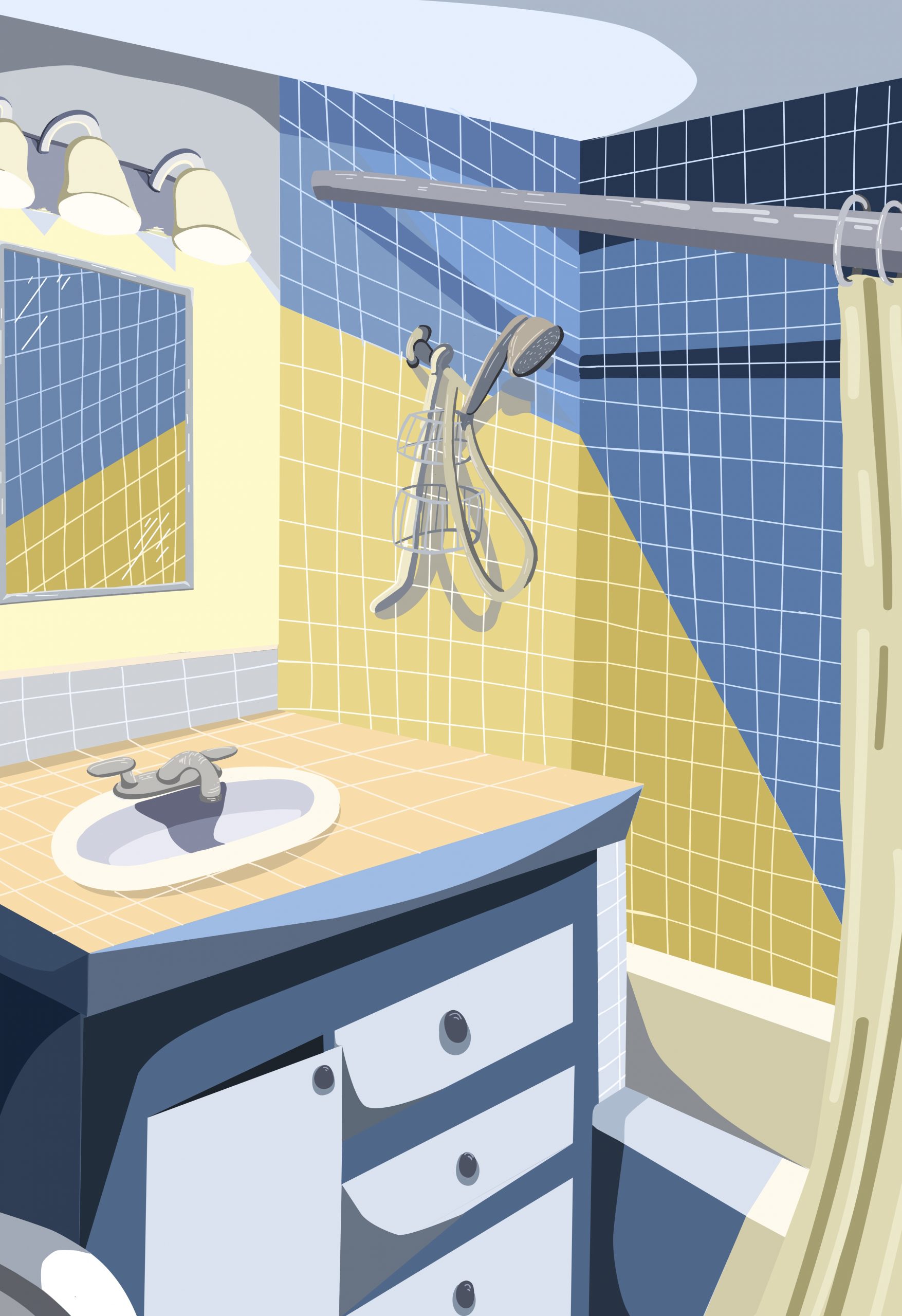 First: I chose to illustrate my bathroom, because I was inspired by the liens present in the counters, the tiles, and the bathtub. They created n interesting composition, and I was interested in how the perspective would be translated. I also wanted to create contrast in the lighting, by using a yellow for the highlights and a blue for the shadows