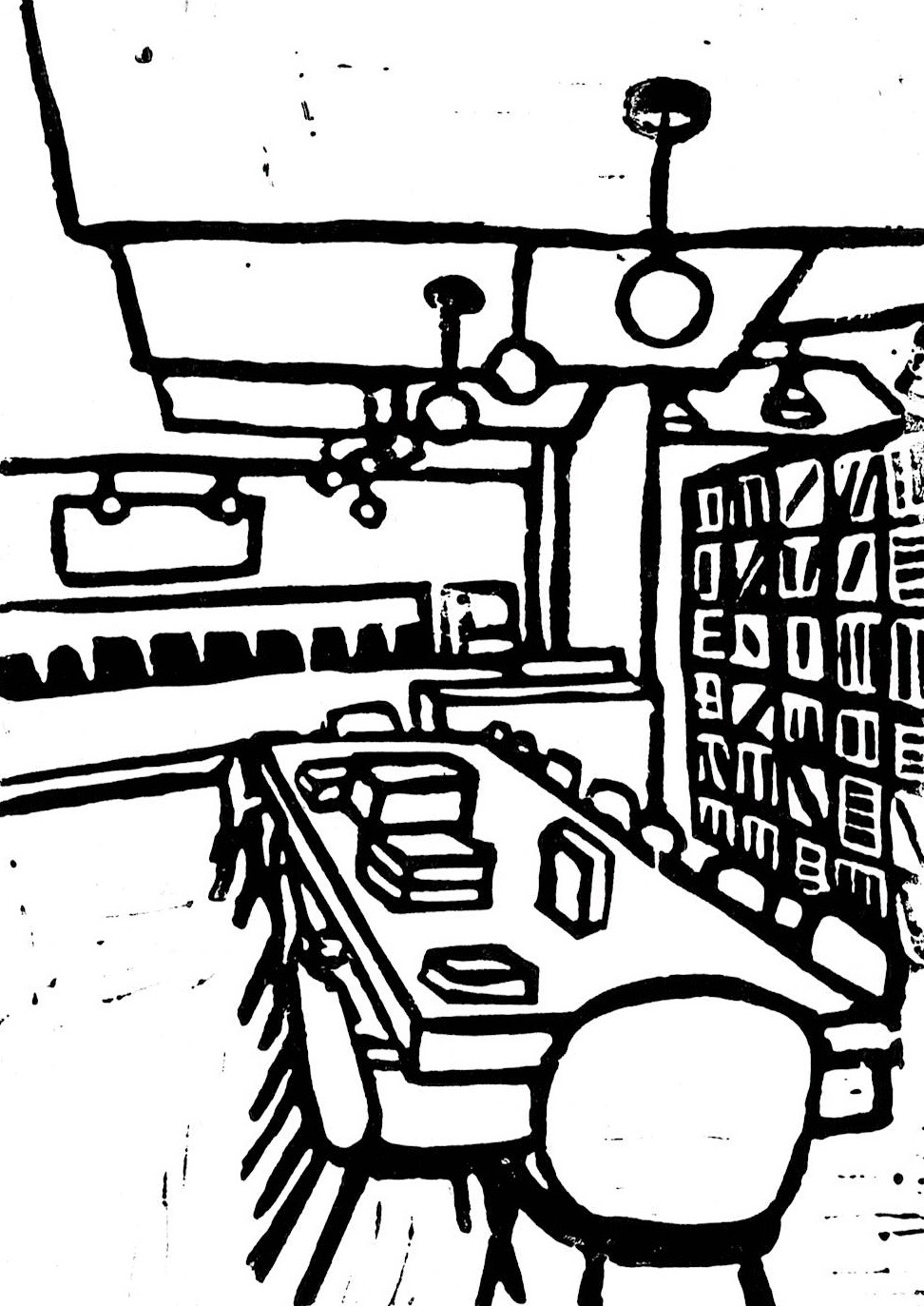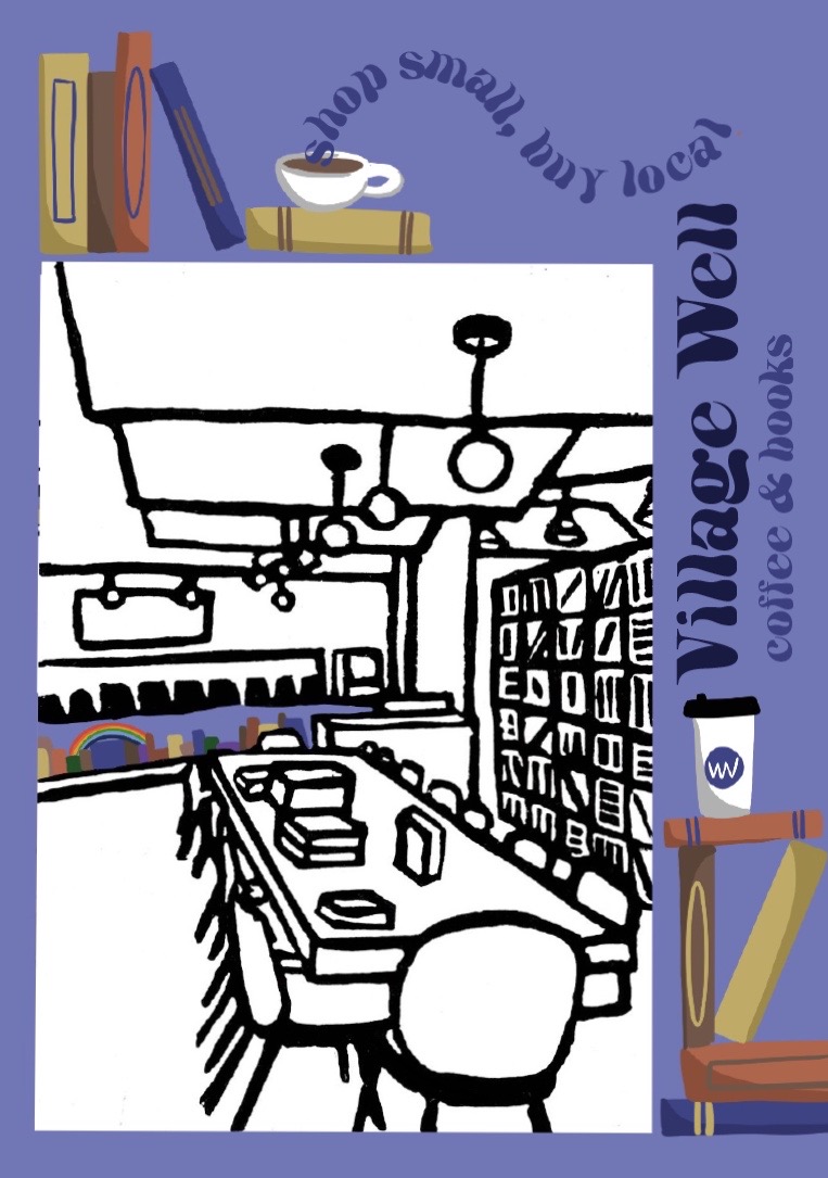 Second: I wanted to represent a local coffee and bookstore in my community that opened during the pandemic in order to encourage people to shop local. I first created a print that outlines the main features (the table, the lights, and the bookshelves), and then digitally added text and color, to emphasize the mural that represents the community, and the logo.