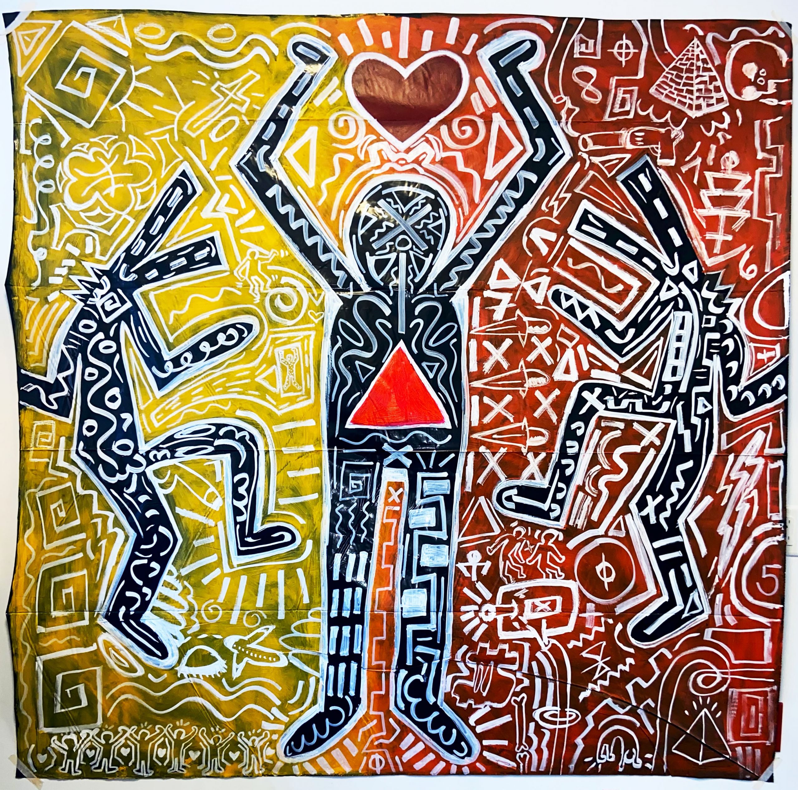 For this project, we were asked to research and understand our artist mentor and then create a piece as if we were them. When thinking about my creation, I wanted to pick up where I felt Keith Haring left off in life and include an homage to his earlier life. I originally wanted to show a sad and happy face to represent these two parts of his life, but I later revised that to a more subtle dog figure reflected on both sides. Keith stands in the middle reaching for a heart he can’t quite obtain, commenting on his journals when he wrote about never feeling loved. I also wanted to do in Keith’s style a mural but could not get a wall space. So instead, I referenced his Art In Transit series, where he painted on tarps. I found a black tarp material and used this. I cut it to 72×72 and painted it with acrylic and a paint pen for the linework. It has been fascinating researching Keith’s life and creating work based on this. He was an incredibly creative and kind person who gave back as much as possible and cared about children’s creativity growth. I found a deep connection to him, so stepping into his shoes and creating work in his style showed me even more about who he was and who I am. I also worked as he did, with music blasting.