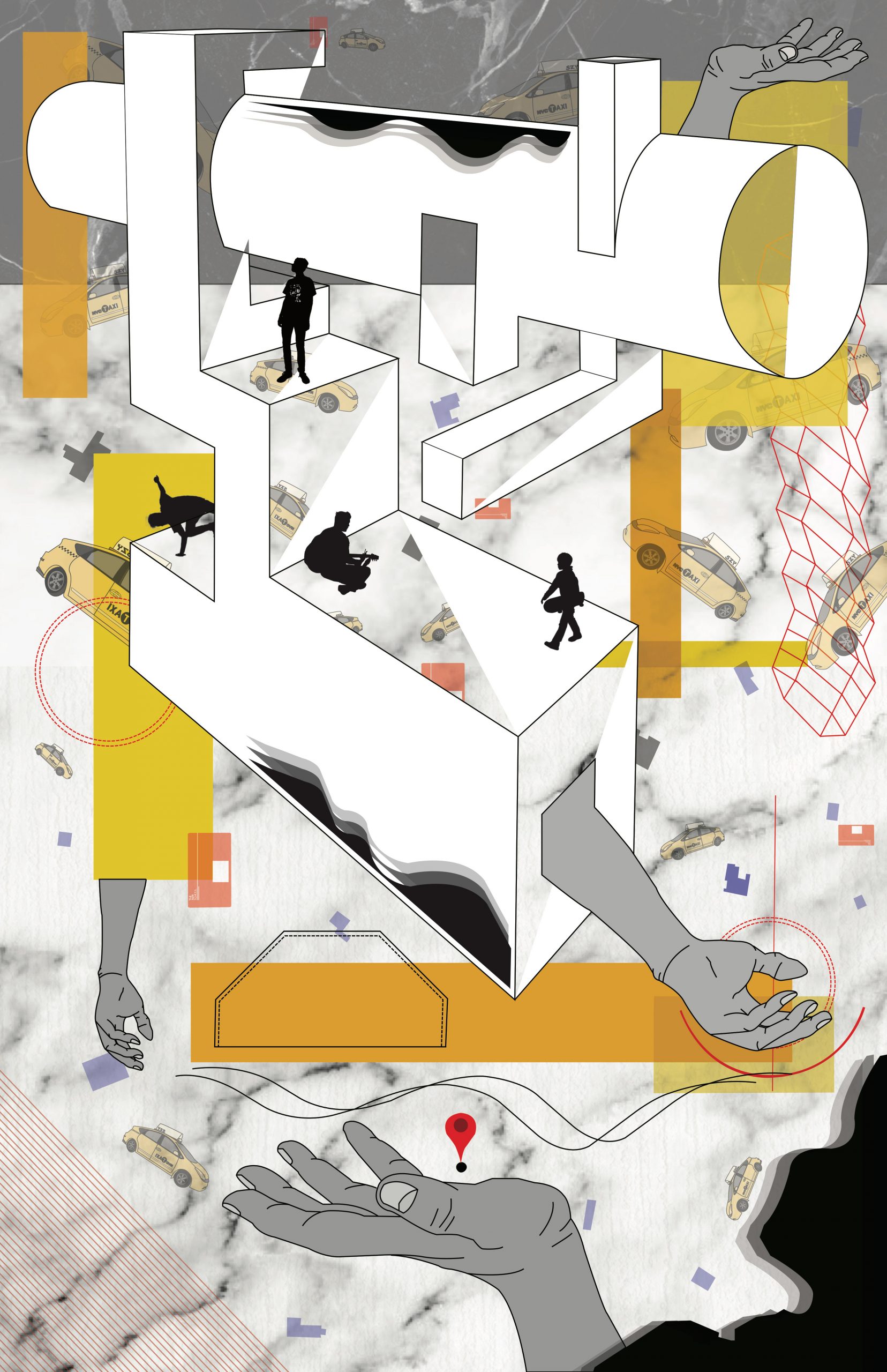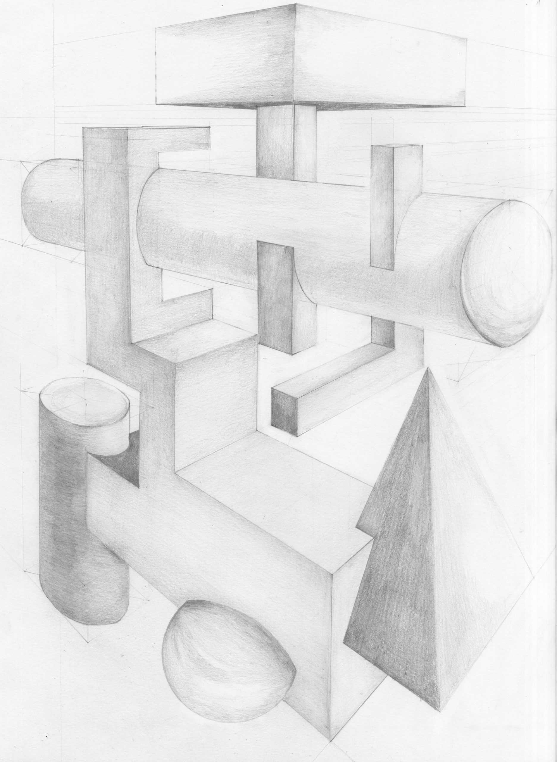 This 2 Point perspective drawing assignment allowed me to explore drawing styles and values and helped me better understand accuracy of proportions, importance of construction lines and vanishing points, detail of texture and accurate representations of lighting, shading and volume. I later took the form I created on paper and inserted the structure into a surreal world created using Adobe Illustrator.