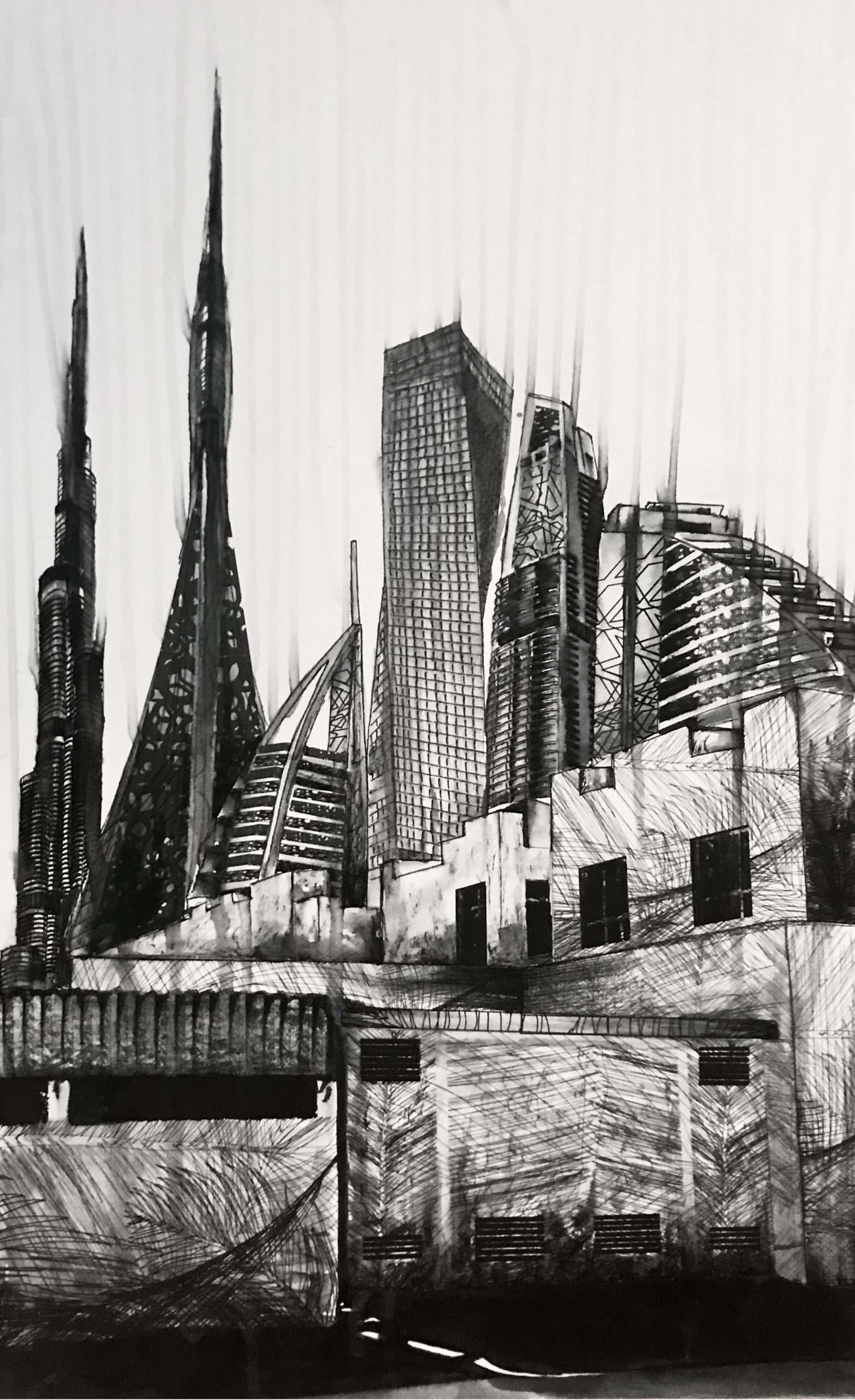 This Piece depicts the Past Present and hopeful longing of Dubai. At the bottom you can see huts and traditional building methods of Dubai. In the growing horizon you can see the skyscrapers that now hold the image of this pristine city. In their midst is the Burj Dubai which is said to be taller than the Burj Khalifa and was to be completed this year for the EXPO 2020. Using the marks of a palm frond and the EXPO symbol to create the digital aspect of this piece I merged the key symbols of Dubai’s past and hopeful future.