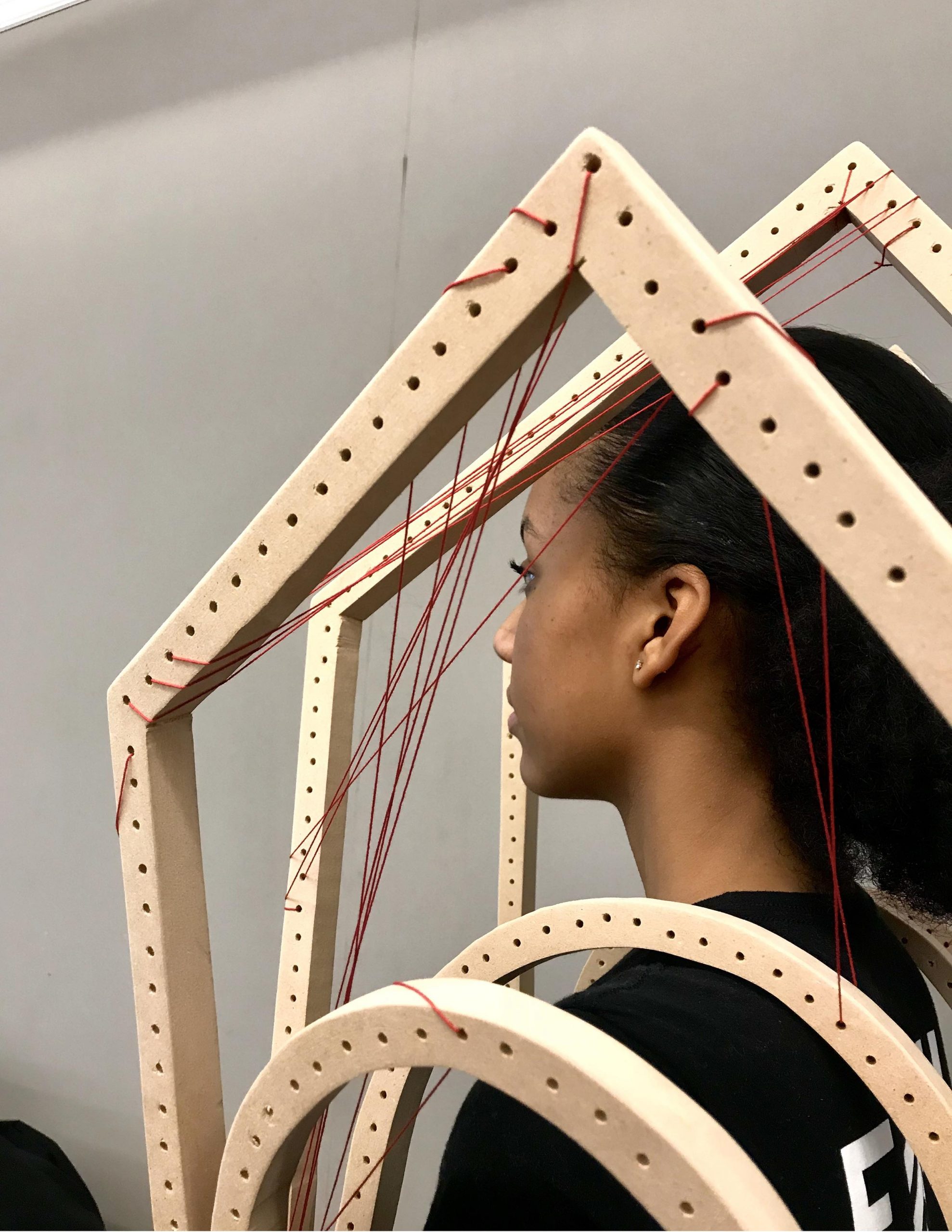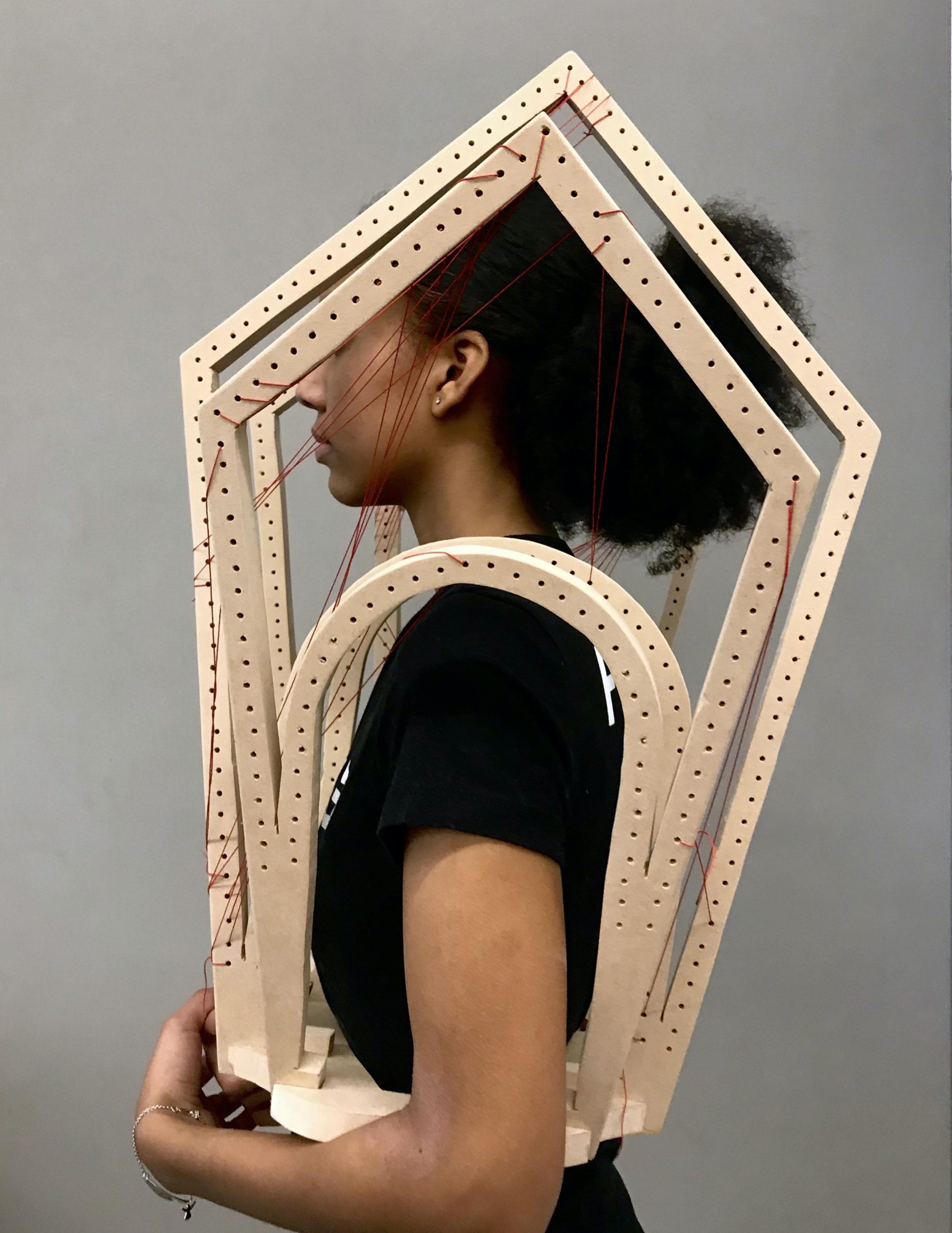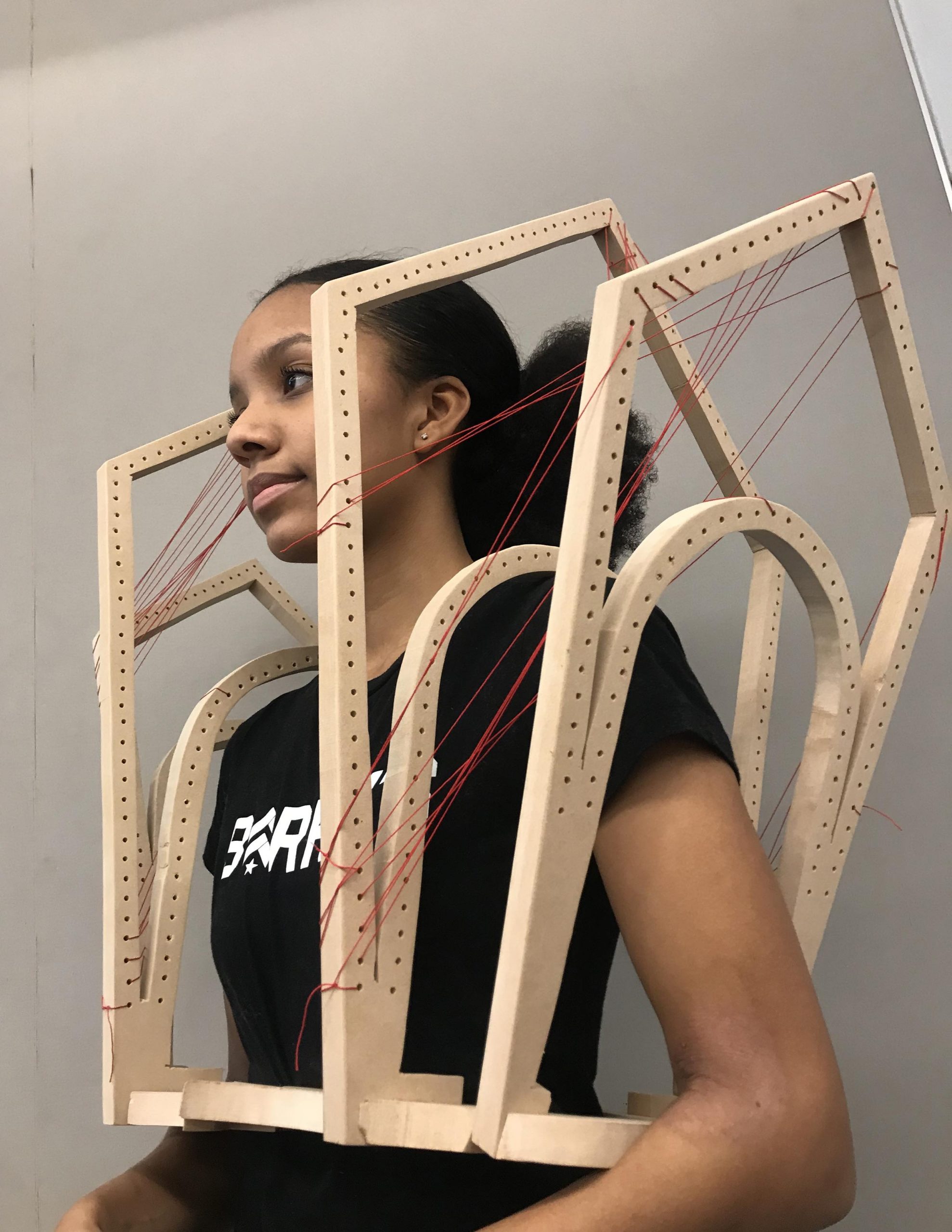 Wooden shoulder structure depicting a transforming material transition in contemporary fashion. An alternative approach to majestic clothing, this piece brings about a material aspect to the traditional armour of pride.