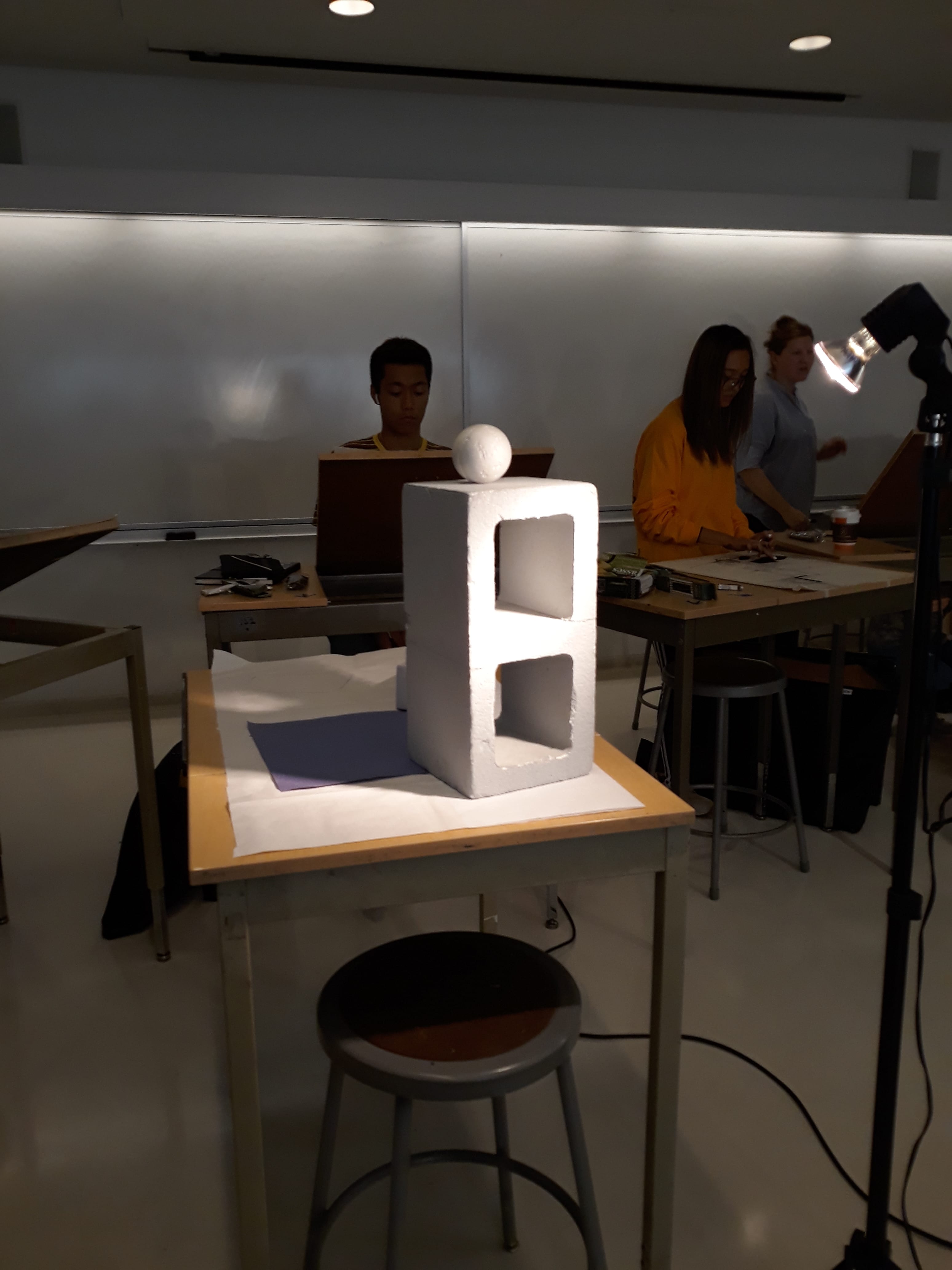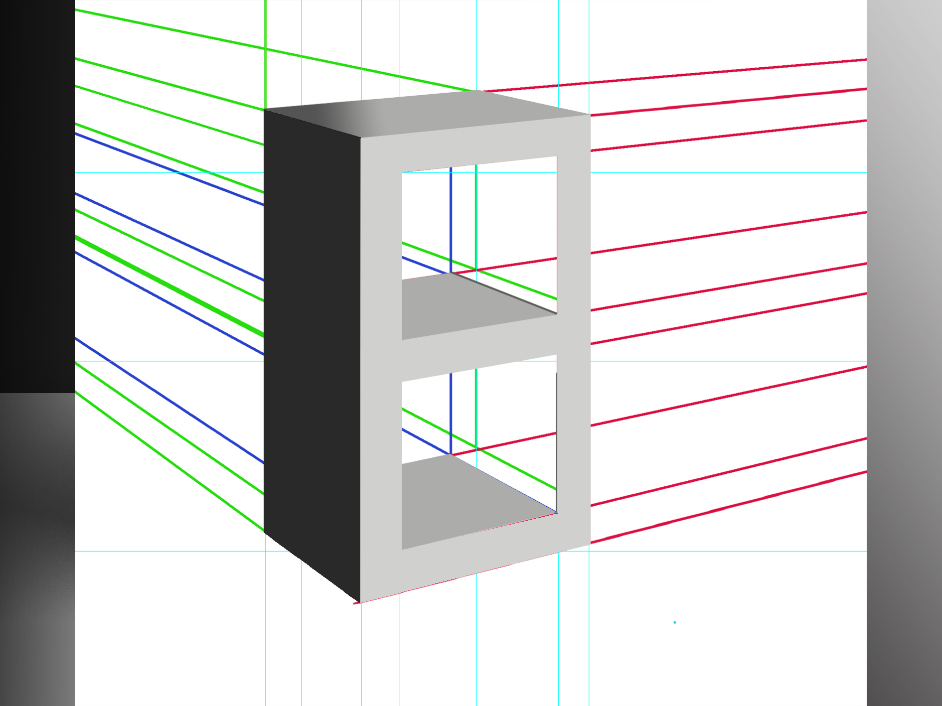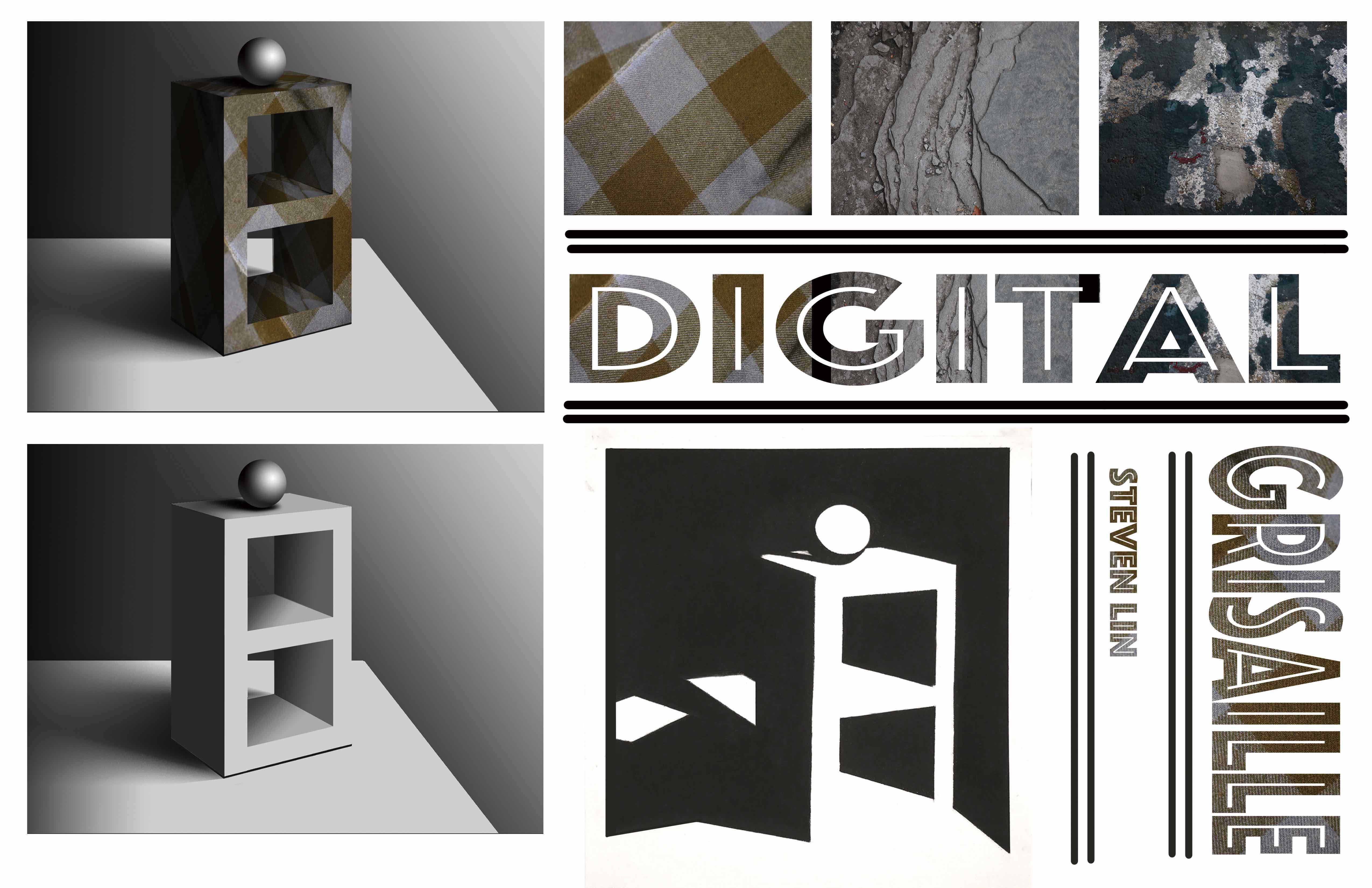 Prompt: Using Photoshop, create a transparent construction to define all of the shapes in your composition. Find all vanishing points, converging lines and horizon line for at least the Cinder Block. If you decide to include more shapes feel free to but only if you have successfully fulfilled the one cinder block. Starting with a JPEG of Part 1 or a screenshot, apply the various selection tools learned in the class to create one digital grisaille version with comprehension of light logic/direction. Separate each object and its transparent construction on its own separate layer for easy navigation. Consider what is on top of that when you are layering. Layering is very literal in the layers panel. Following the Activity Point with the camera, select at least three photos and applying Photoshop tools and blending modes manipulate your cinder block to give it surface texture.