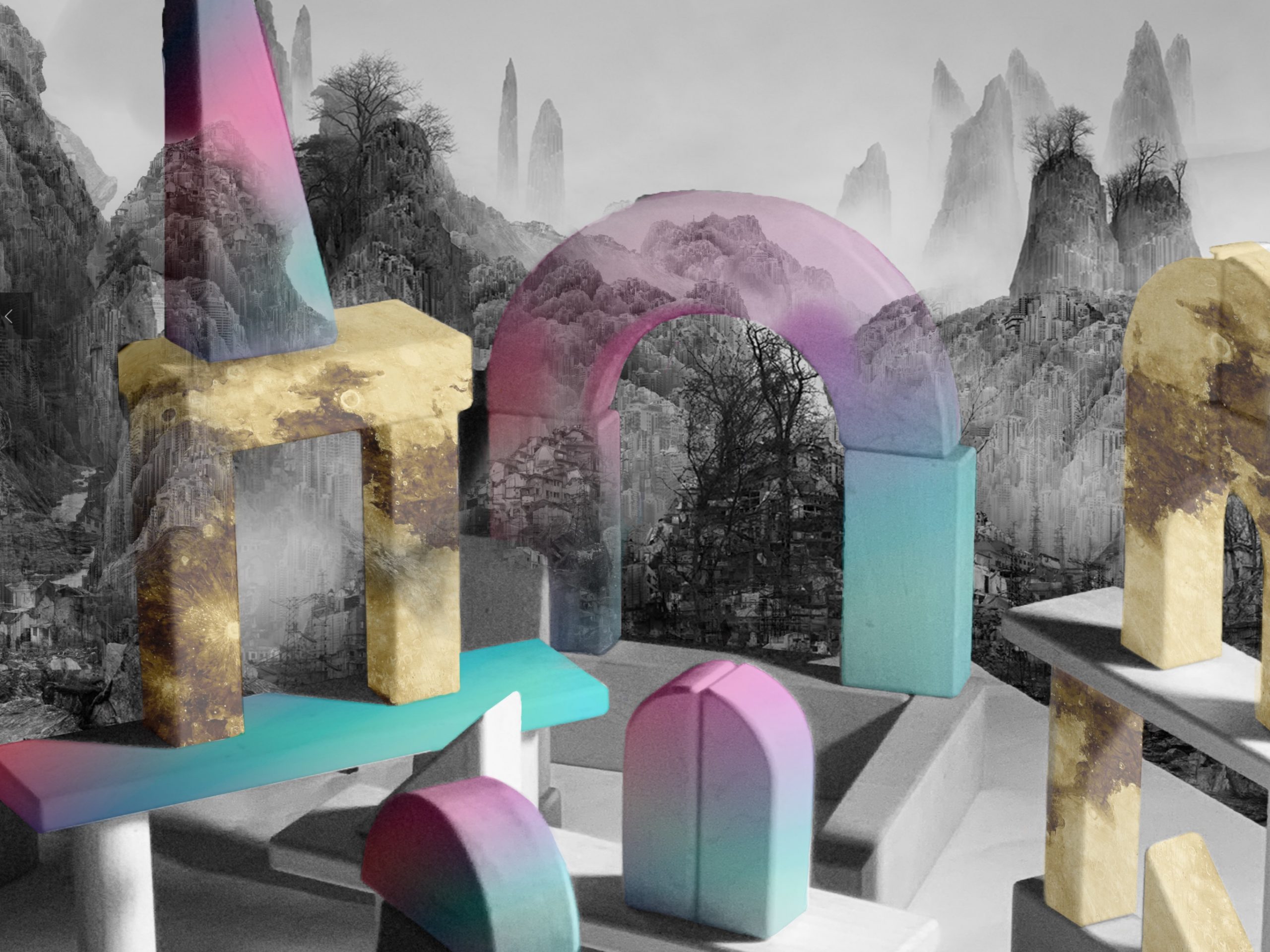 Prompt: Transformed photographs of building blocks that were taken in class to a themed photograph using Photoshop techniques and formed into a collage.
