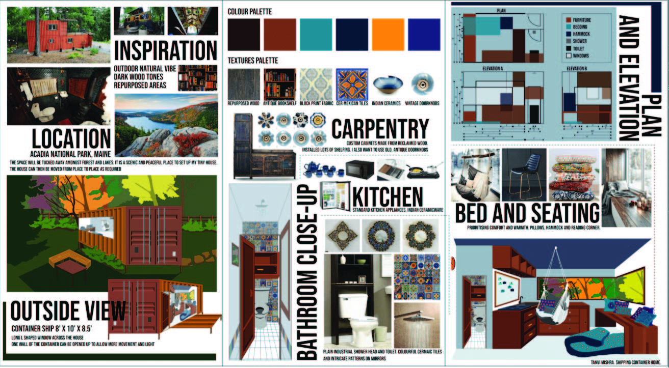 Our project was to create a tiny house for ourselves. I chose to make a house in a shipping container. I started by making a plan and elevation. Then we learned model making skills and implemented them in our models. My presentation board shows my vision for the assignment.