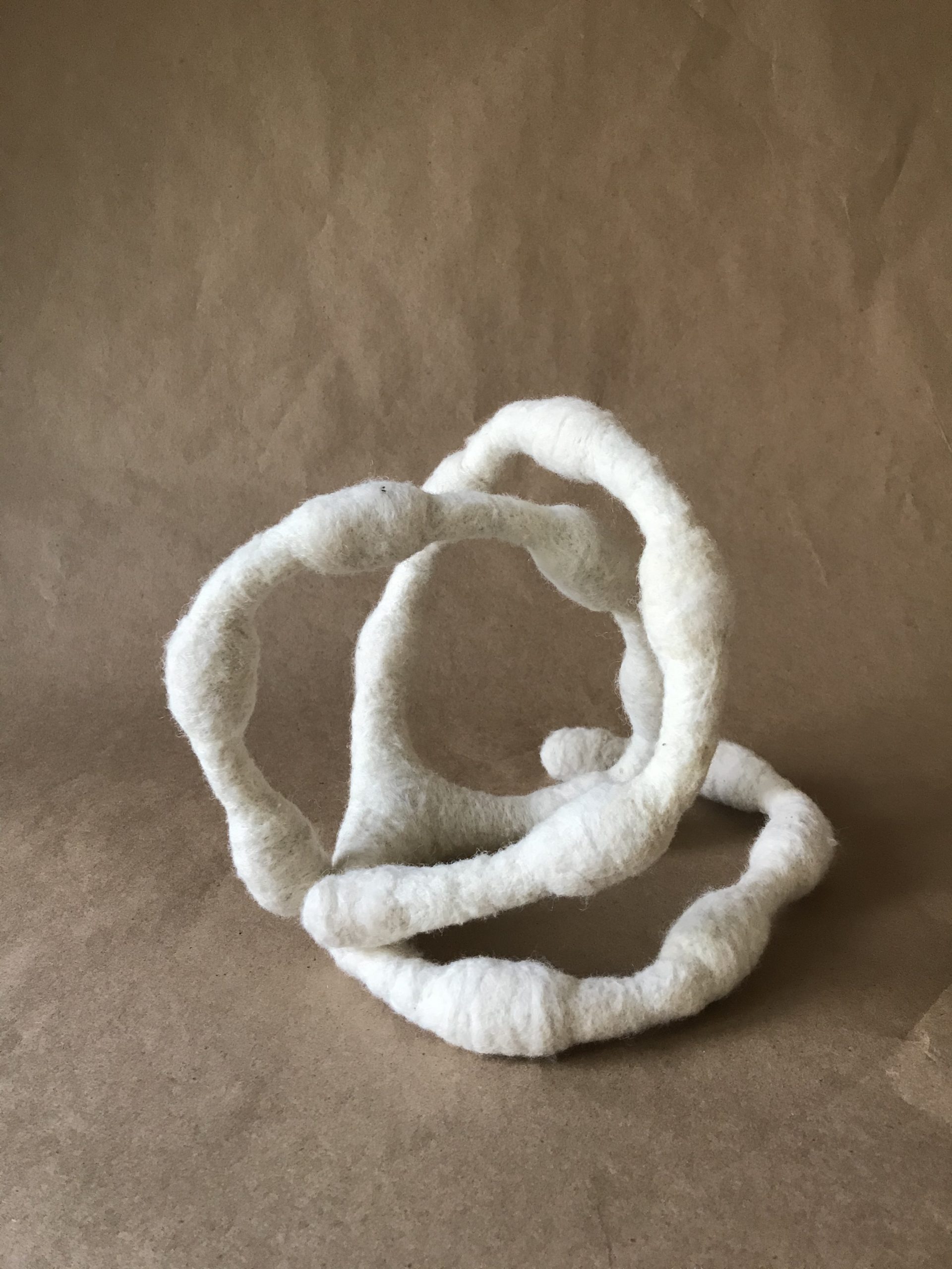 The Balancing Act is a soft sculpture based on the workings of the inner ear, particularly the part of our inner ear that tells us where we are in space and keeps us balanced. It is made from felted wool roving and has an interior structure made from 18 gauge wire and metal springs. I chose to use wool as my material because its softness is reminiscent of the fleshy inner ear, and it invites touch and play.