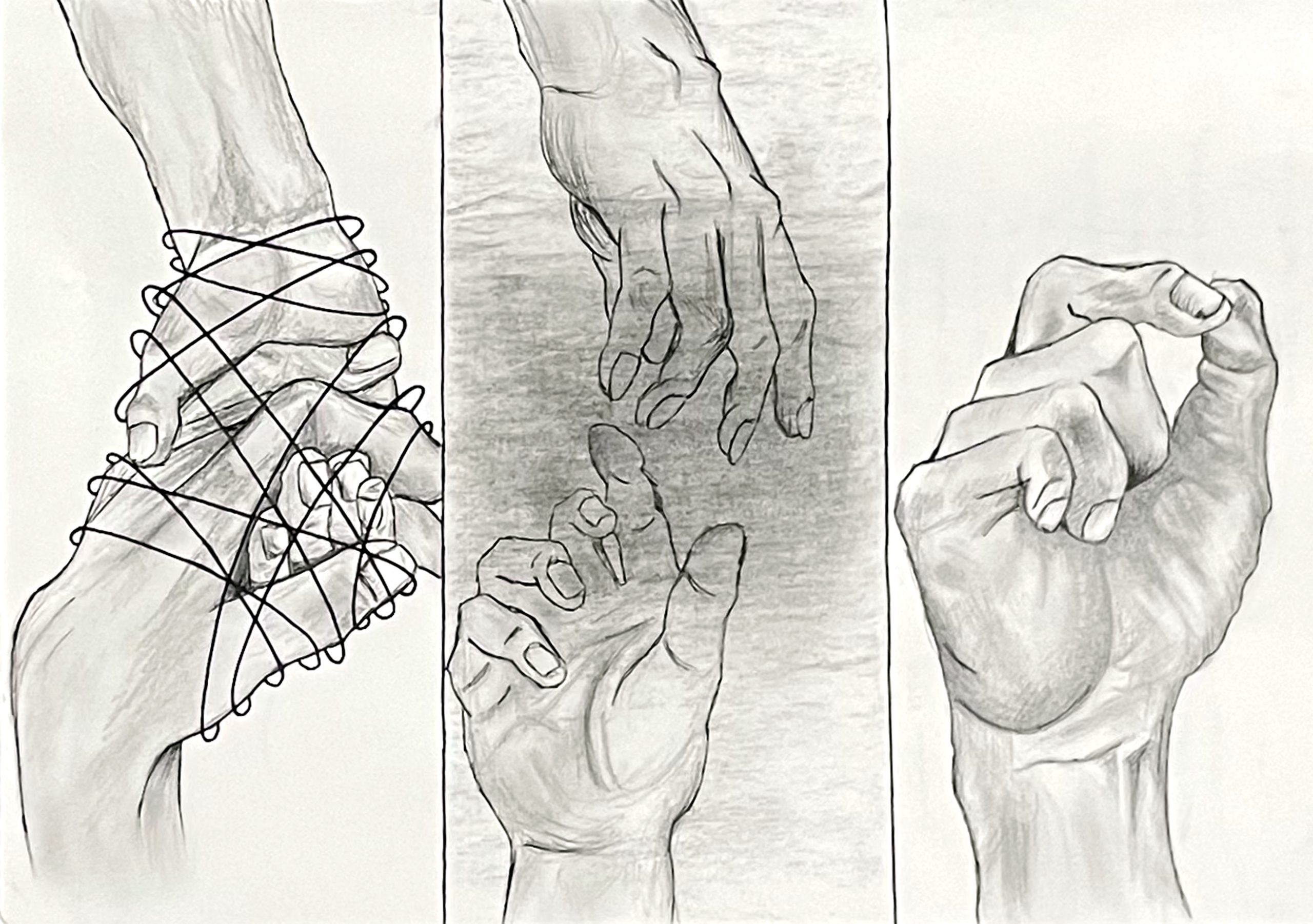 My “I Know How, Now” piece portrays a very important positive shift in my life. It represents self-growth and self-love in a different form than usual. In my rst panel, I show how attached I was to a certain person, although it was hurting me and knew that this person wasn’t in my life anymore. However, I chose to hold on to the pain because it was the only thing I had left and although it was hurting me mentally I was constantly choosing the pain. My second panel illustrates how slowly- slowly with a chaotic mind I started to let go because although I didn’t want to and liked the pain, I realized that I got to do what’s best for my future self and nally prioritize myself. Last but not least, my third panel is my hand standing alone, needing no one to be okay, learning how to be independent, and embracing self-worth and self- love. I got to be my own person. This project is very emotional to me as it shows the journey that made me who I am today.