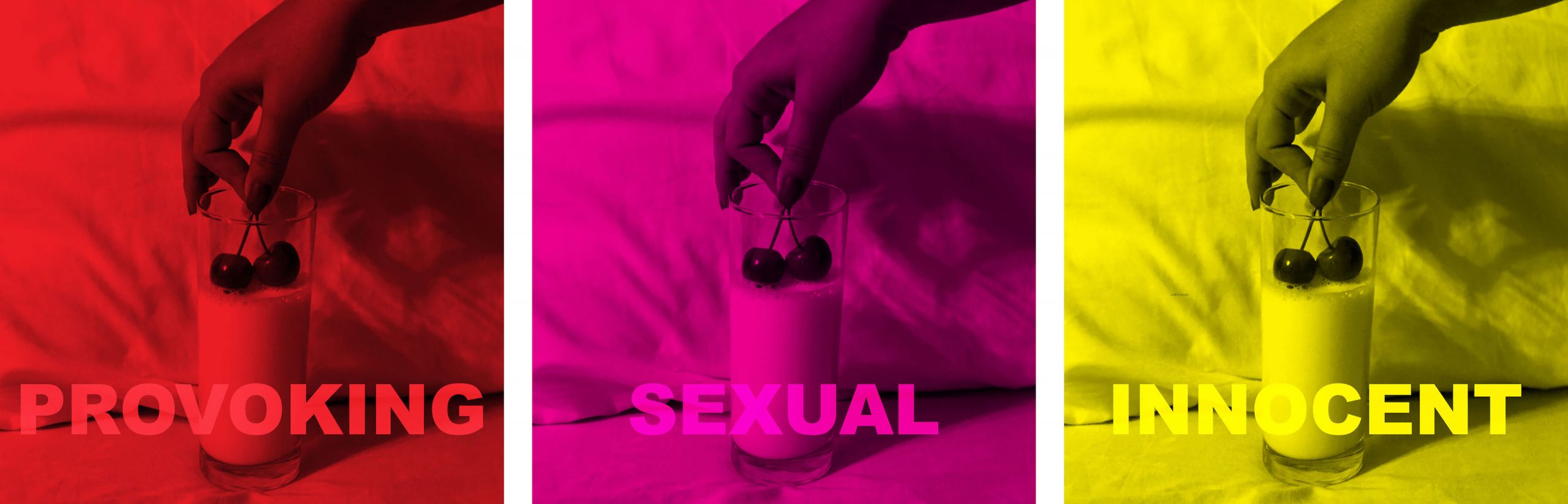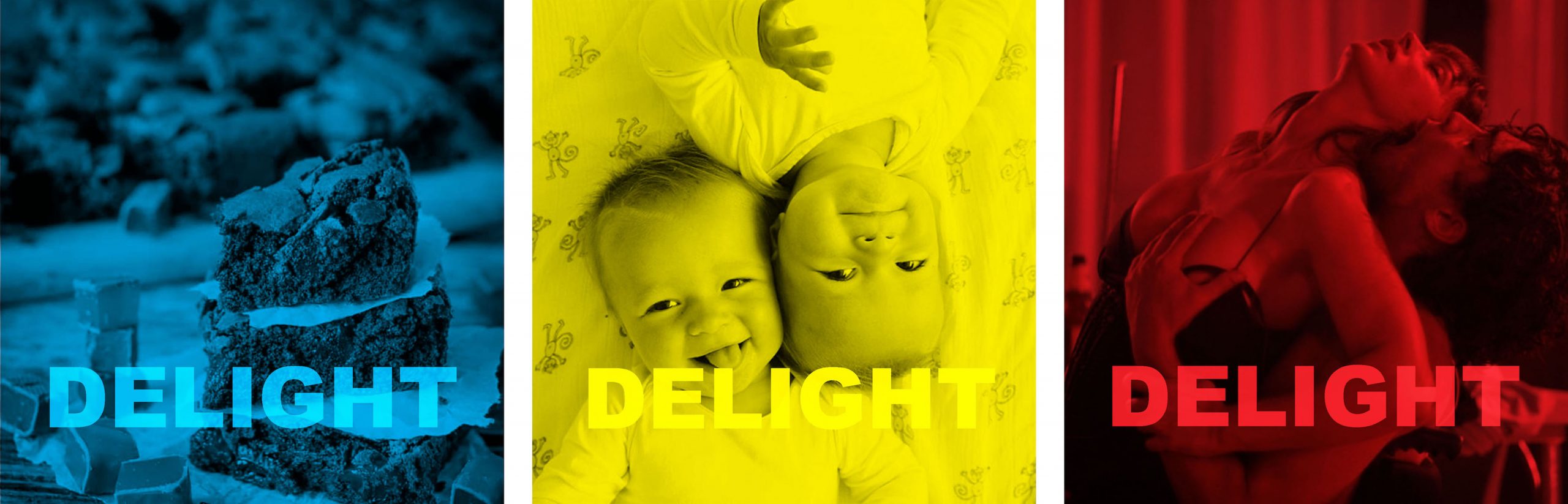 For the first part of this piece, I chose the word “delight” and chose three images completely different from one another that represents something that brings us delight. I really wanted to show the contrast between the different kinds of delight through the image itself and the color I chose to cover it. For the second part of the project I chose an image taken by a friend of mine that goes to Parsons Paris and used the words “sexual”, “provoking” and “innocent”. I also chose the colors to cover the pictures with, according to the meaning of the word and what I personally think it could represent if the word chosen was a color.