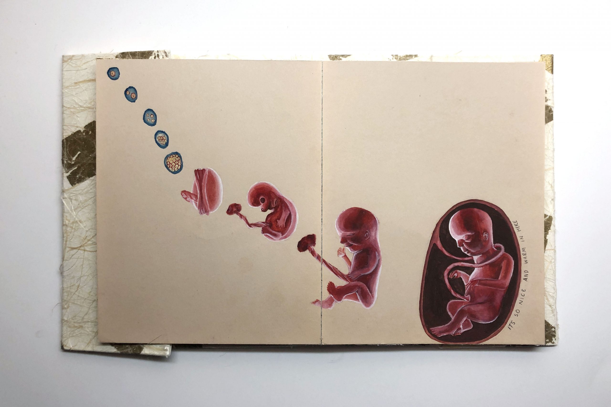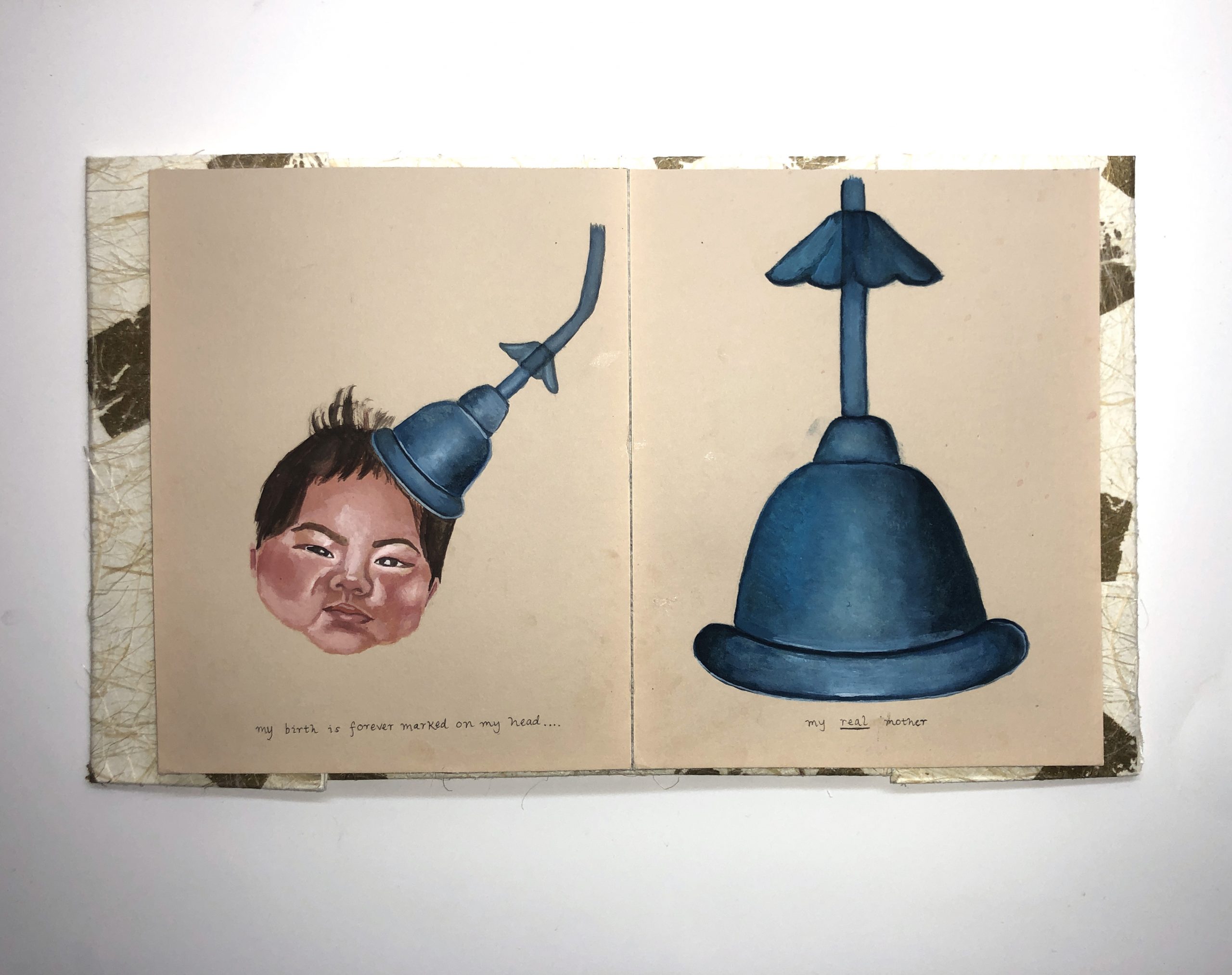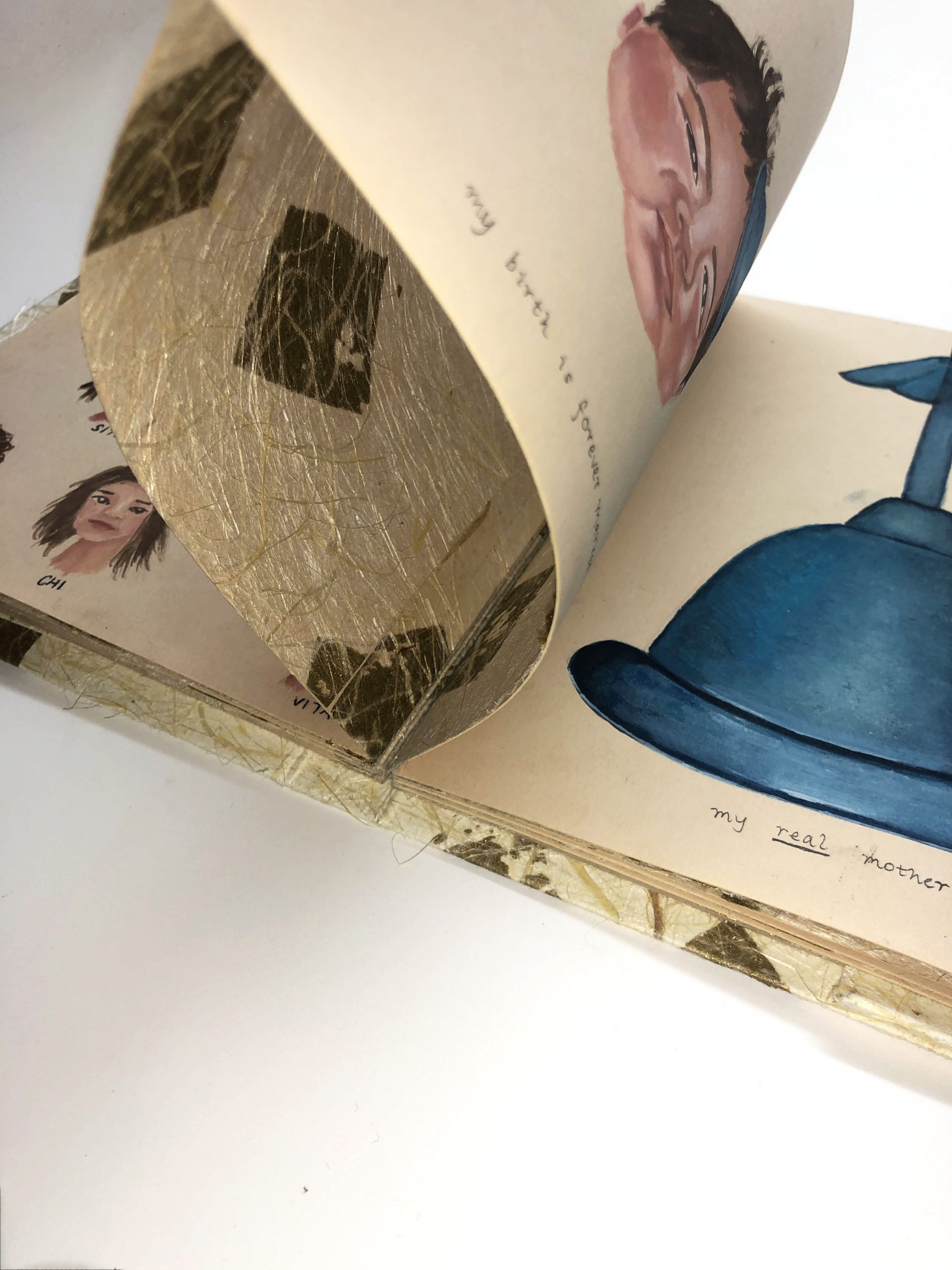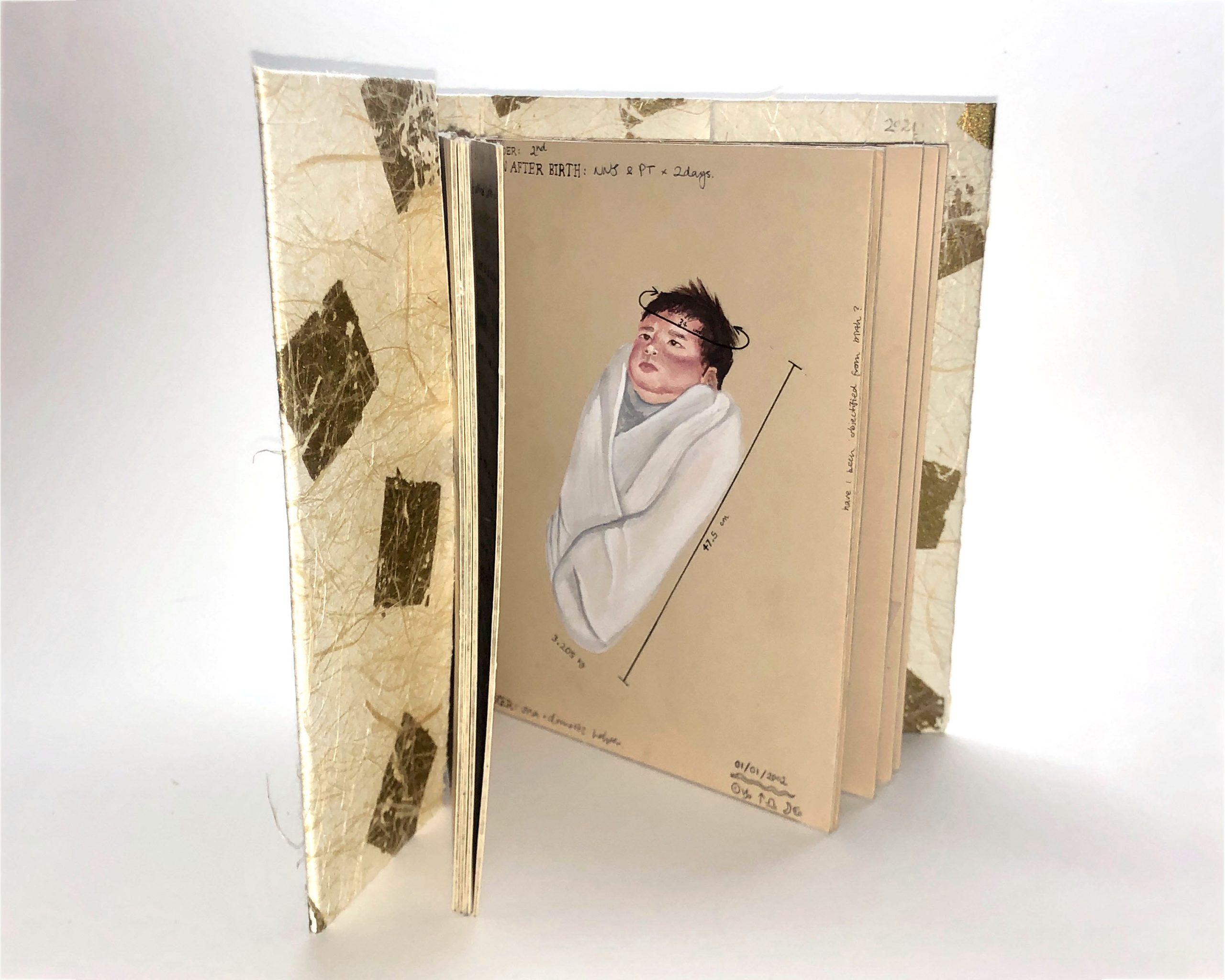 This project acted as the final bridge project for my integrative seminar 1 class. The assignment was to create an artist’s book revolving around an artist we had researched for the previous bridge project and to link it to our final essays in our studio class. The book draws on my experience and acts as an amalgamation of all the work we did on investigating memory, both scientifically and thematically, in my studio and seminar 1 class. I had researched Mary Kelly’s Post-Partum Document (PPD) which is often regarded as the first piece of artwork that explored the motherchild relationship through the perspective of a woman, subverting the male gaze. I approached the assignment by creating a response book inspired by the themes and topics explored in the work, as well as incorporate my own elements of illustrations and humor. My aim was to ask the artist and explore some of the questions which developed from further research upon writing my seminar essay. As the ‘post-parted’ I wanted to explore the mother-child relationship from the child’s perspective. I used similar techniques to Kelly, such as interviewing my mother and using collected items to create my book. Many of the visuals in the book are drawn from a health record booklet, which has followed me since birth, and some childhood photos. The final project is an accordion book consisting of 18 pages with a french fold cover.