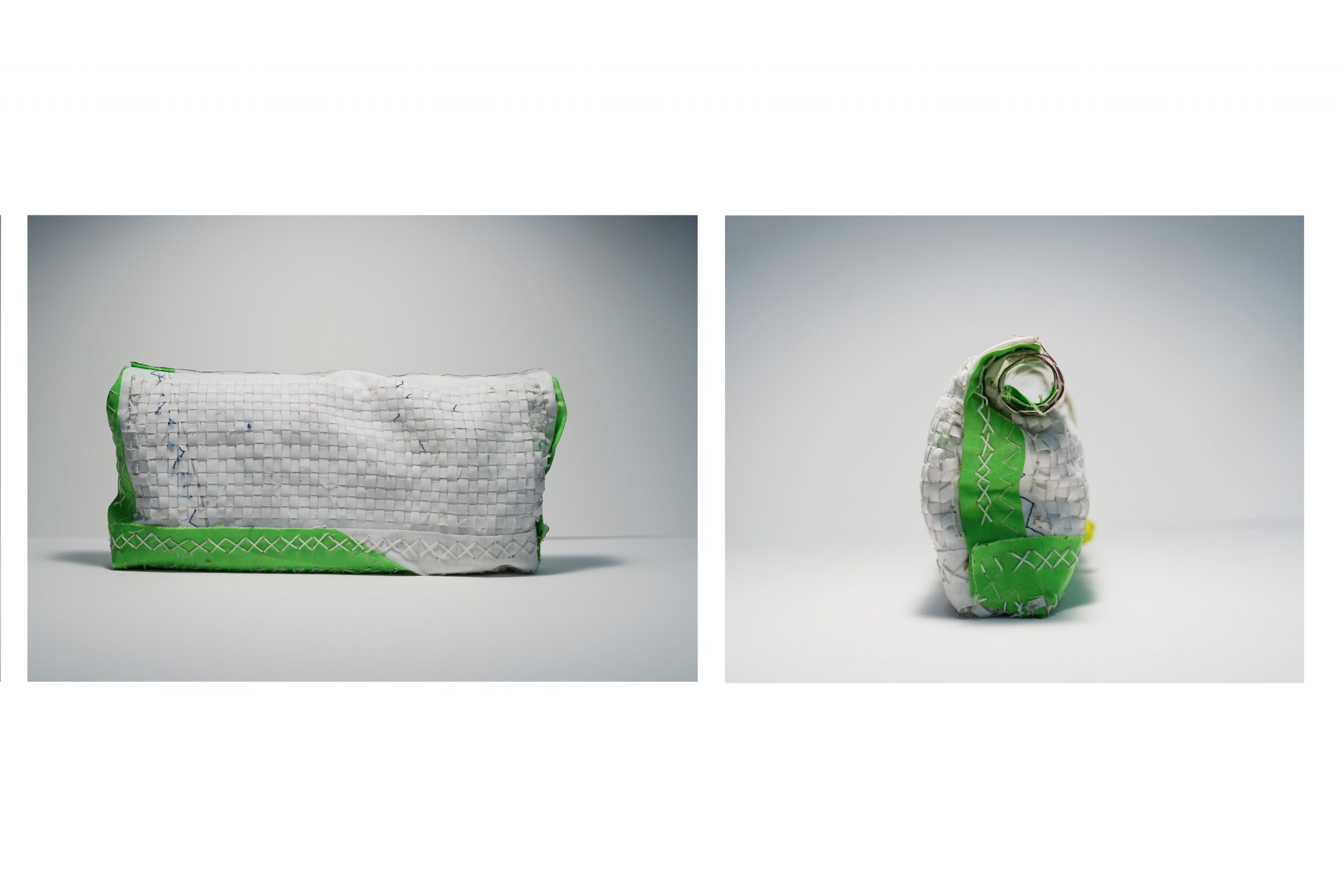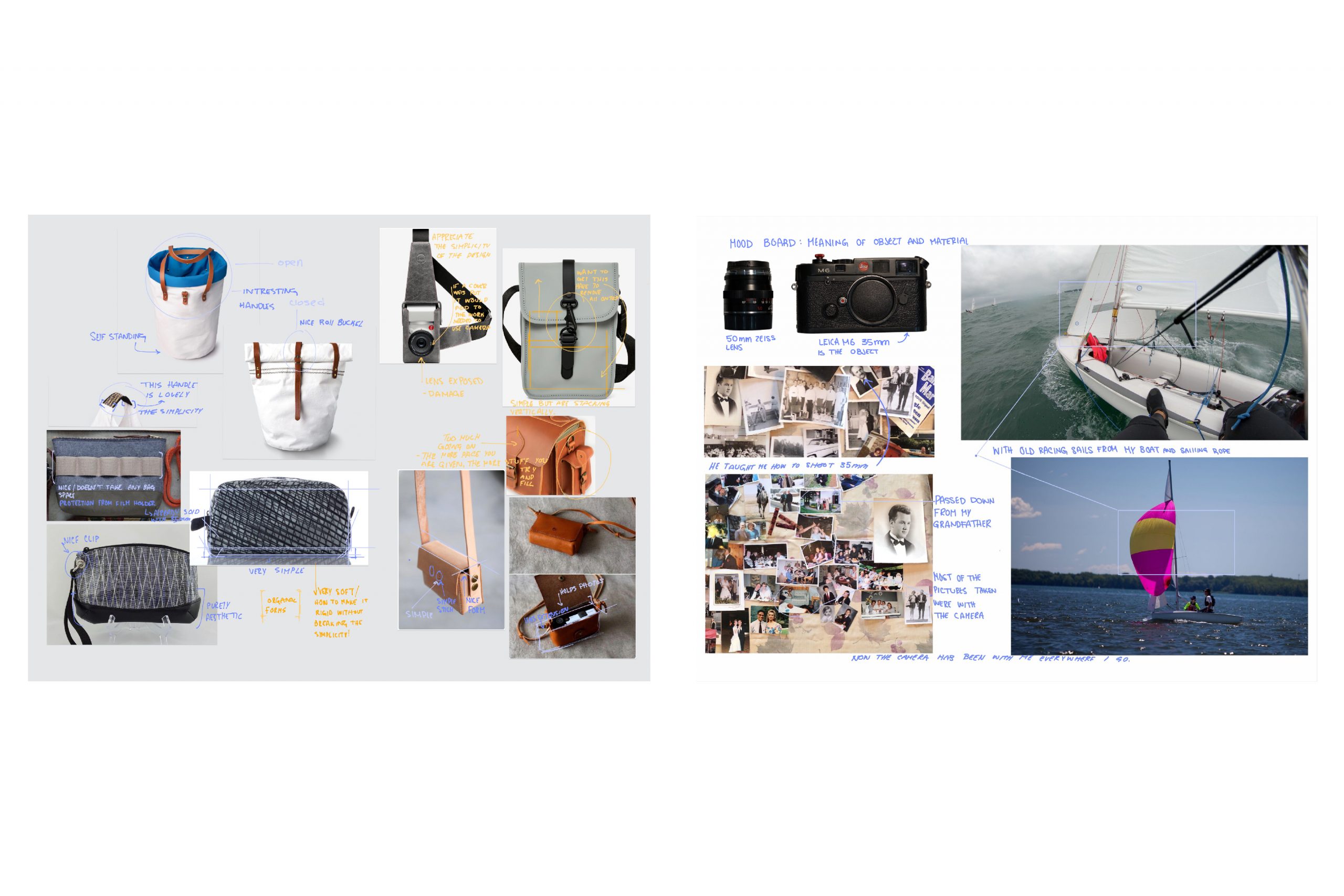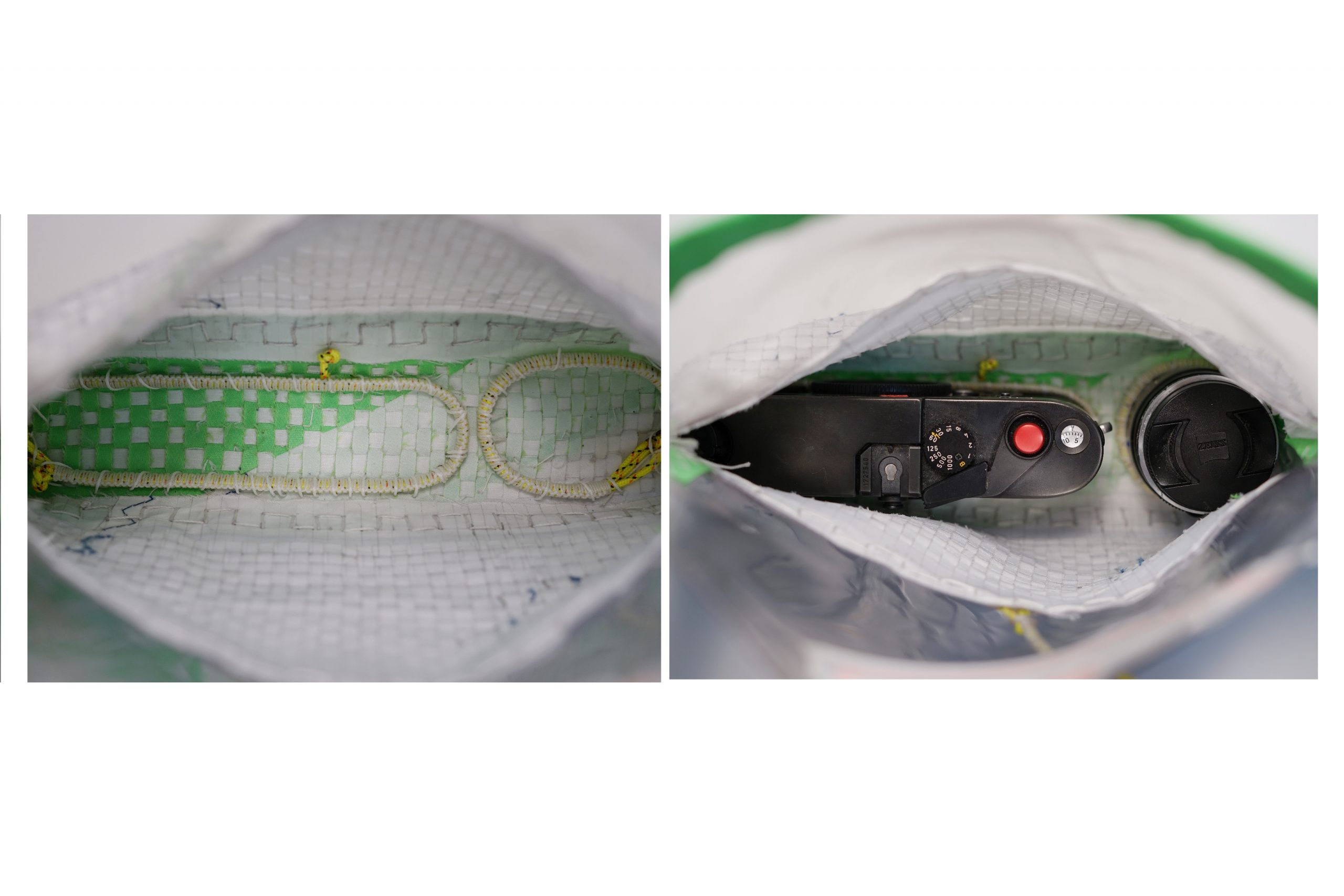 A container meant to protect and hold the camera during transportation. The linear material is an old race sail (a synthetic fibre (nylon), specifically carbon fibre). Whipping Twine was used as a thread for the project and sailing rope with a 2mm diameter. The Leica M6 was passed down from my grandfather, and the camera was used in the majority of his life. He also taught me how to shoot with a range finder (Leica M6). He brought it around the world, and I am now also bringing it with me as I travel. It is interesting to think about how he looked through the same eyepiece and experienced his life through the camera. Now, I look through the same eyepiece and experience my life. It is interesting to think about how this single-camera connects these two different dimensions of time. The camera has also helped me express my creative message and shot most of the shots for my portfolio for university. The sails that were used as material were recycled sails from the time I was a completive sailor in Canada. These sails have been with me through training for races and have also lead me to win some as well. The sails were gifted to me from my club, as a going-away present pushing me to pursue my design future at Parsons. The container that was created now embodies two objects, and the memories that are attached to these objects. As they each interact with one another, their memories somehow combine. Using weaving as the technique of creating the bag allows for the sail to become a liner material. Also, using Whipping Twine and manipulating the linear material will enable me to use my knowledge of sailing and apply it to the bag.