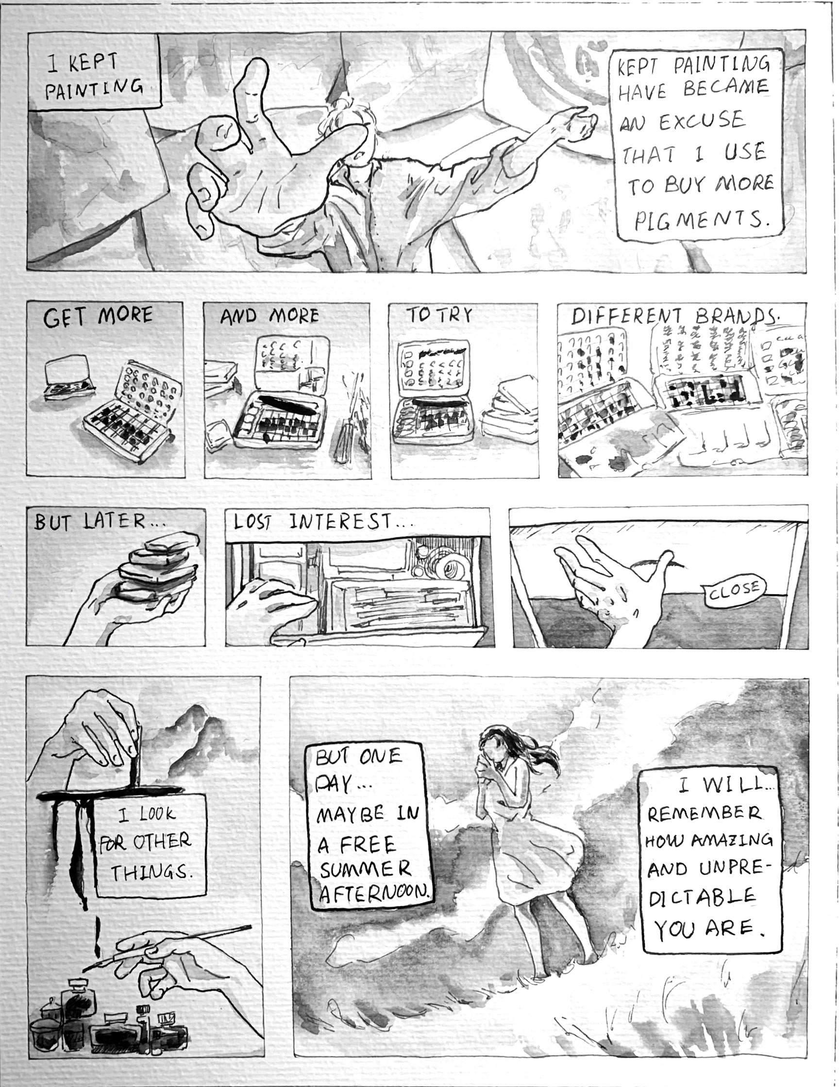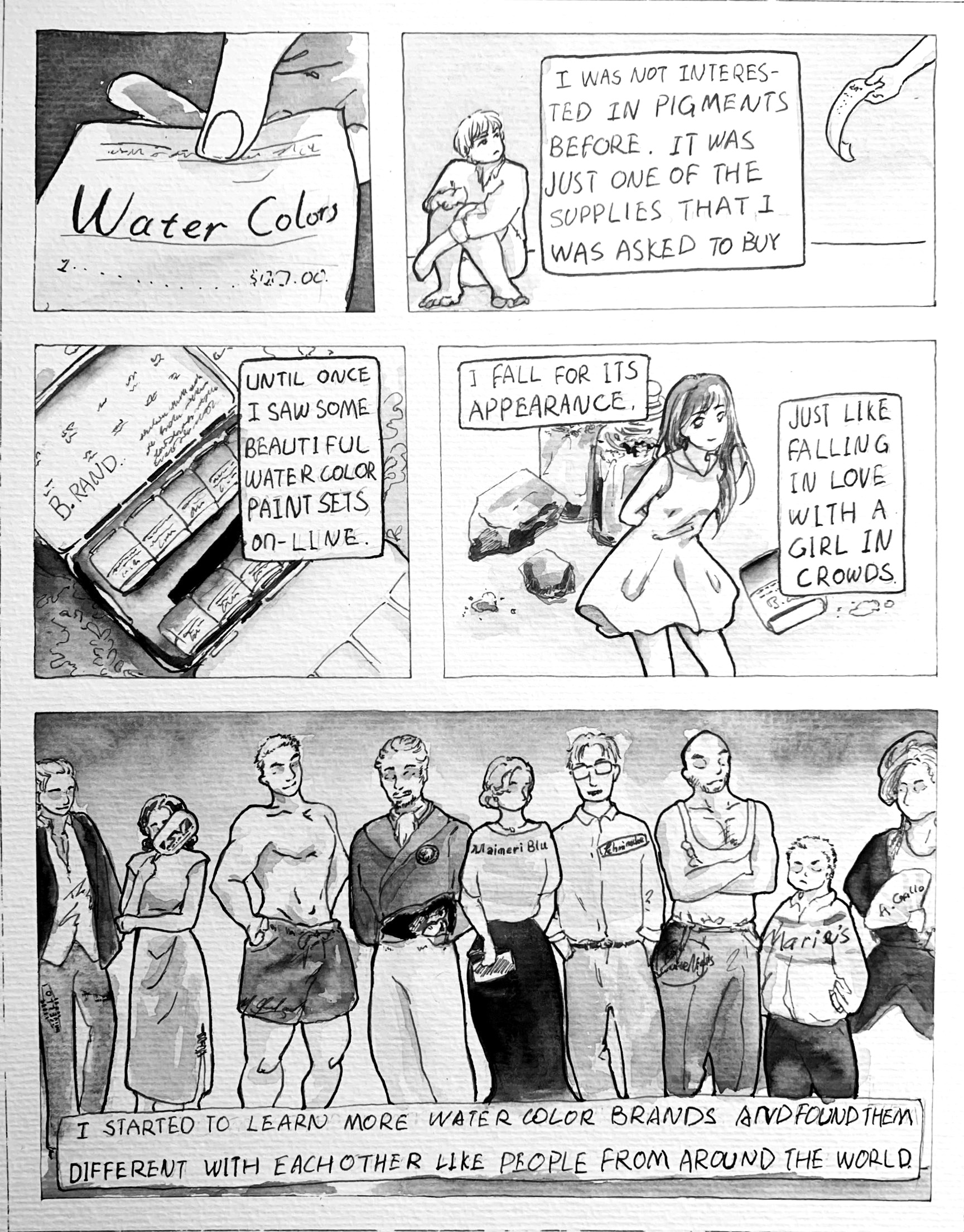 This is a comic that I want to talk about my experience with watercolors. I have recently found they could be produced in a very pretty way, putting into metal boxes. I enjoy the process of knowing brands, and their differences while using. I could see them as different person.