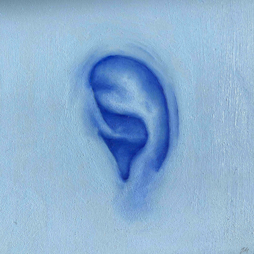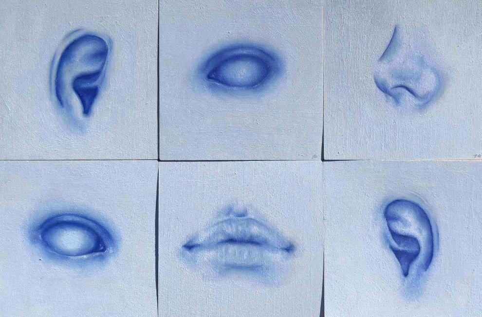 I wanted to look into how a portrait can be viewed, whether this is by the physical manipulation of the image or through the separation of aspects of the face. I wanted to take the features on the face, separate them and arrange them in a way that is random, the pieces can individually be considered a portrait along with the collection of pieces together be seen as an alternate portrait. I used a blue tone for each of the pieces to remove a sense of identity and emotion from the work. I selected three different people, and for eyes and ears I used the same image flipped horizontally only adjusting the lighting slightly to give the impression that is an alternate feature. They eyes lack the iris which in a traditional portrait can be seen to give the piece a sense of emotion. The ears, mouth and nose have unjoint lines, which can be connected through perceptual completion and are joined with the background as if they are melted together. All together the final pieces showcase a deconstructed portrait bringing together the basic features of a face with the intent of creating a portrait like image. It has the fundamental pieces of a traditional portrait however through the colour and deconstruction of each piece, it lacks the conventional view of a portrait.