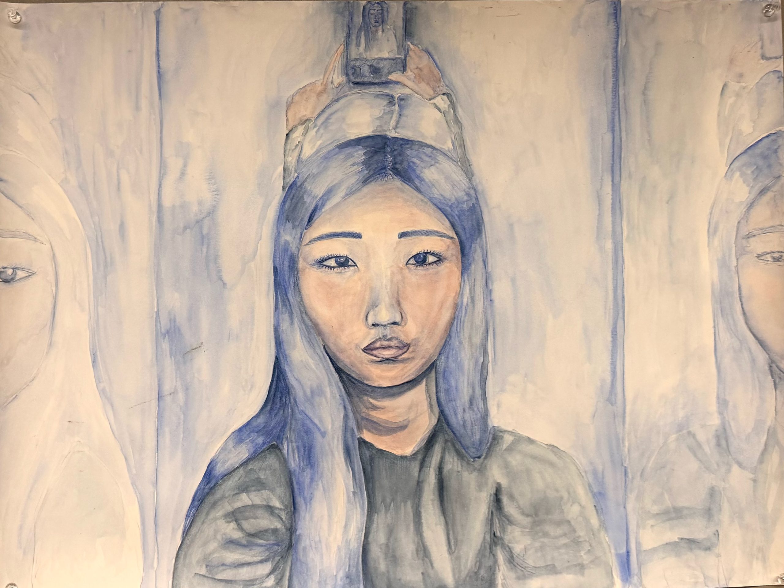 I was inspired by the Met studies I did, especially the Self-Portrait with a Model by Iba Ndiaye. The portrait is almost monotone with muted green and blue, evoking the feeling of sadness and blurriness. Thus, for my self portrait, the color blue is the main part of my palette.