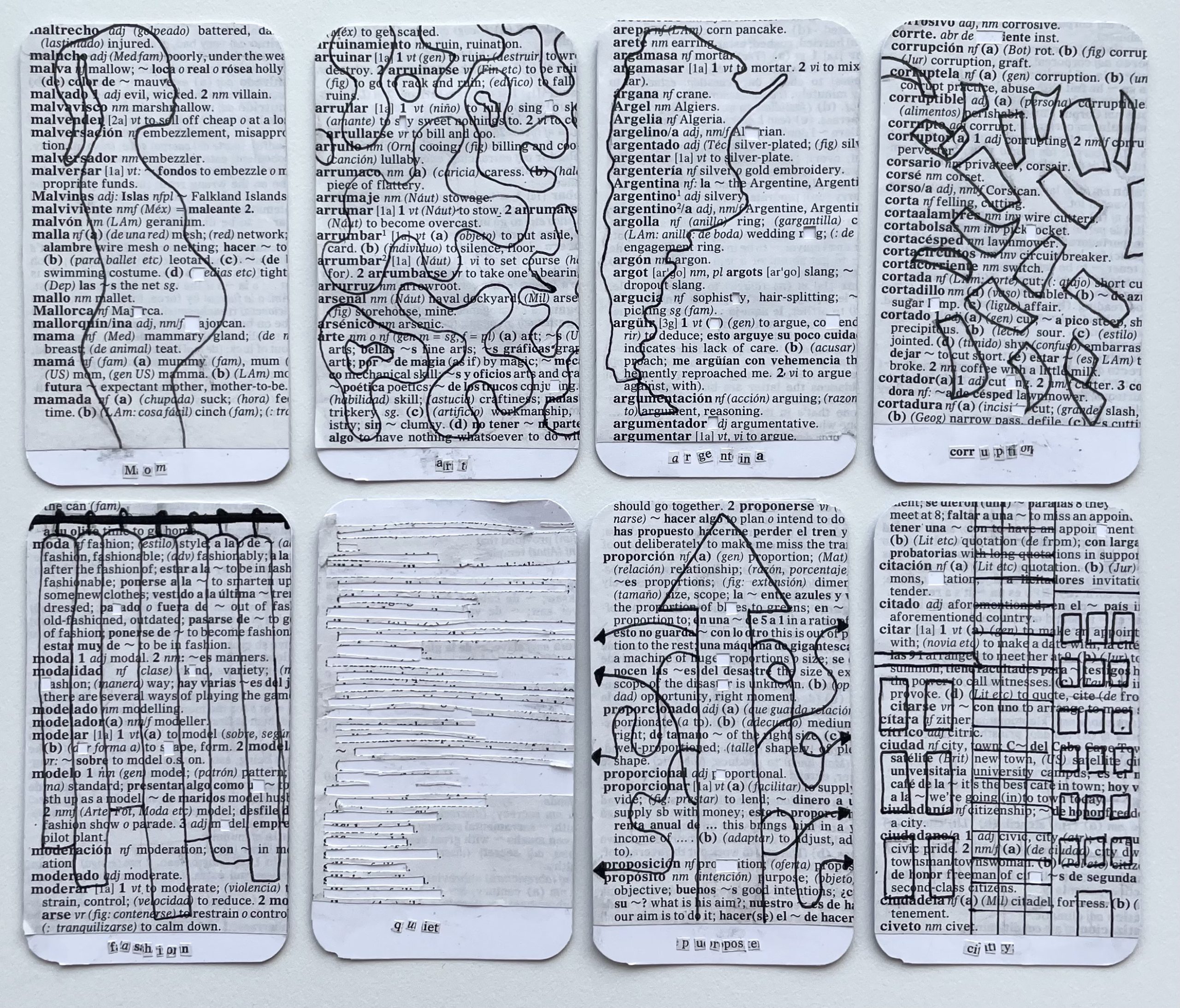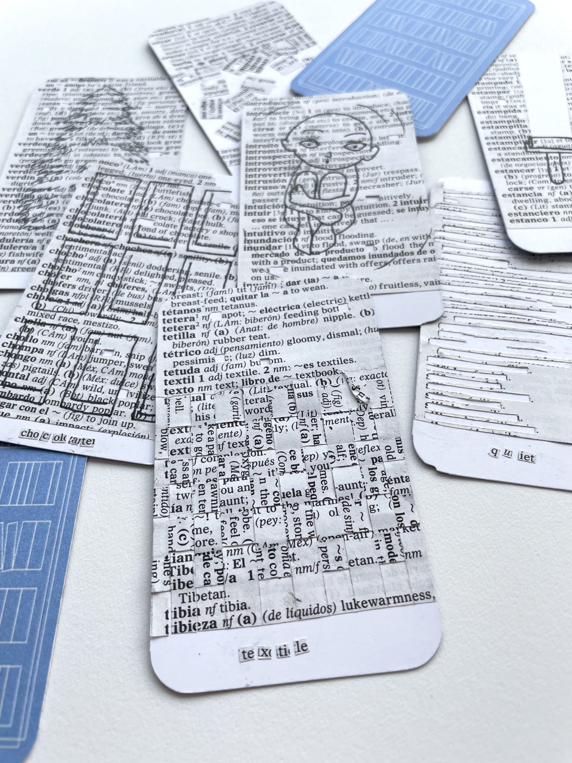 For the ‘Found Fortune’ deck of cards, I was inspired by found poetry, which is a type of poetry created by taking words and phrases from prewritten pages and giving them new meanings. This type of writing joins words, art, and creativity. I chose to use a Spanish-English dictionary as it represents the back and forth translation between both languages that my brain experiences every day. Each card is made from the page of the dictionary which contains the card’s word in Spanish. I cut and illustrated each card by hand and created the back digitally.