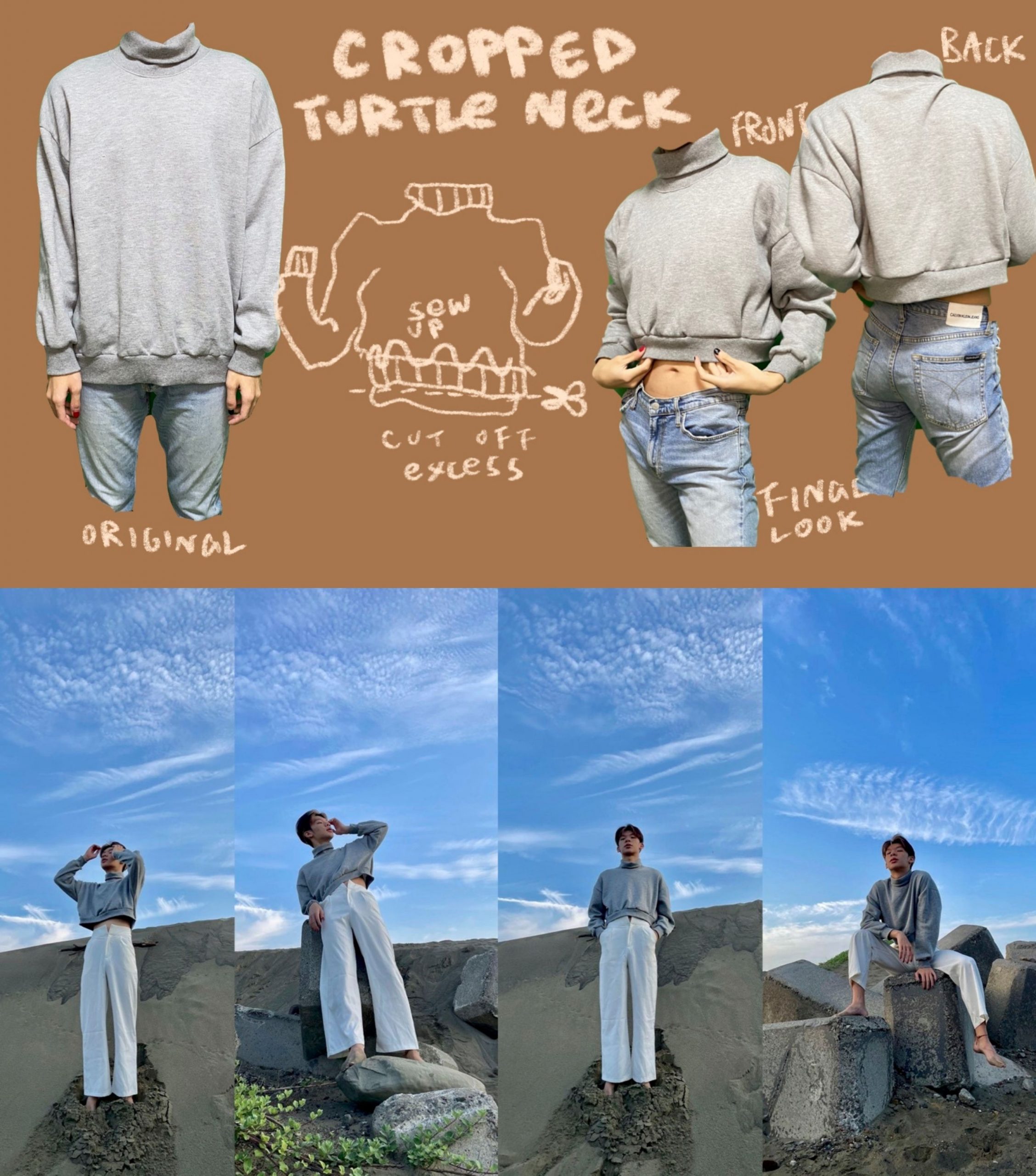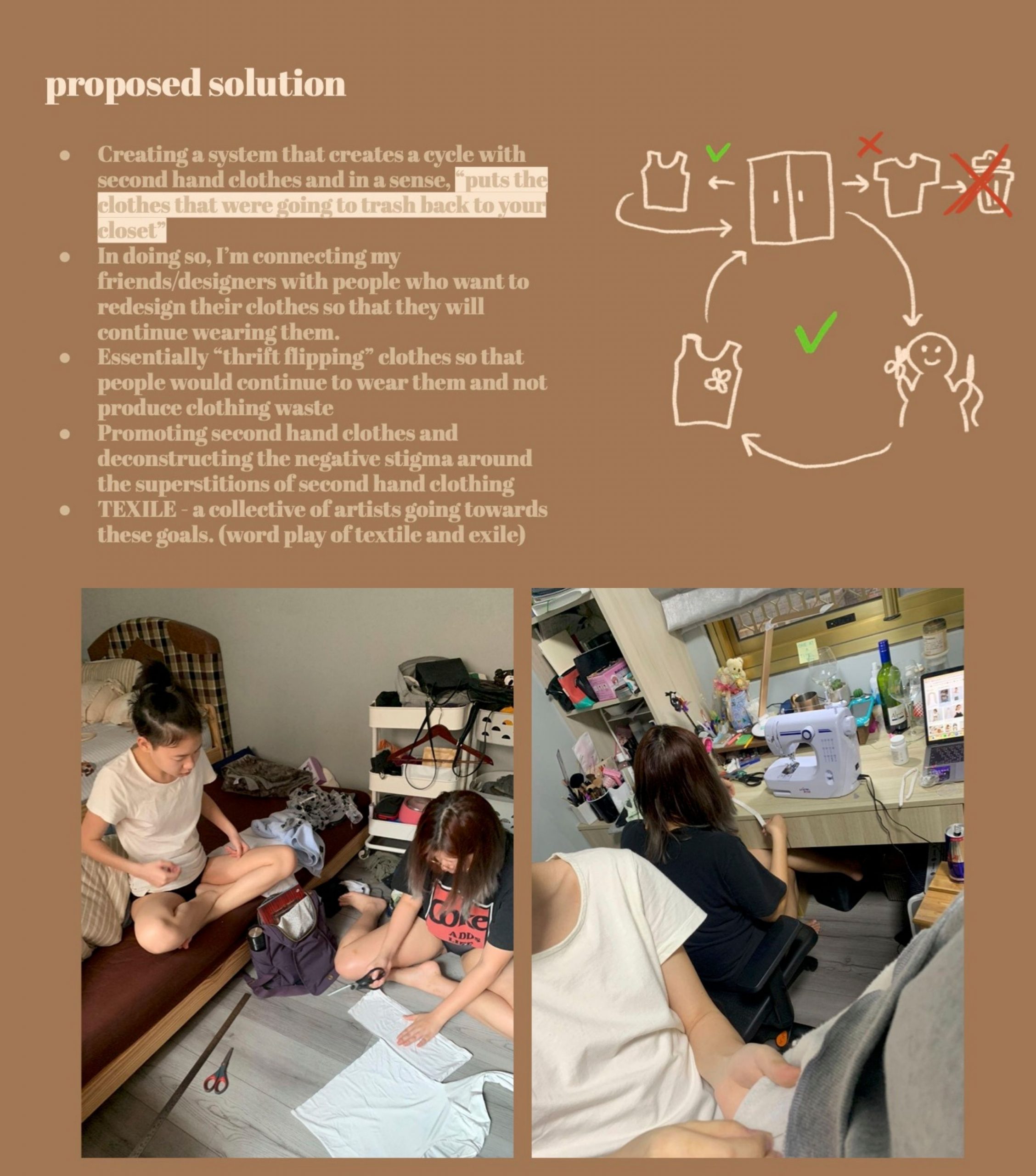 Inspired by the GroundCycle system by Vivian Lin, and repair cafes, I decided to create a thrift system in Taiwan, where thrift stores and second-hand clothing are stigmatized. The purpose of project TEXILE is to take the clothes that are going to end up in the trash, back to the closet in order to reduce fabric waste. To do so, a group of designers will come together like a repair cafe and redesign clothes so that they are “cuter” and more seasonal so that people would wear them for a longer time. By altering old, oversized garments and reforming plain designs, we could minimize the amount of clothes being thrown out, and normalize wearing thrifted outfits.