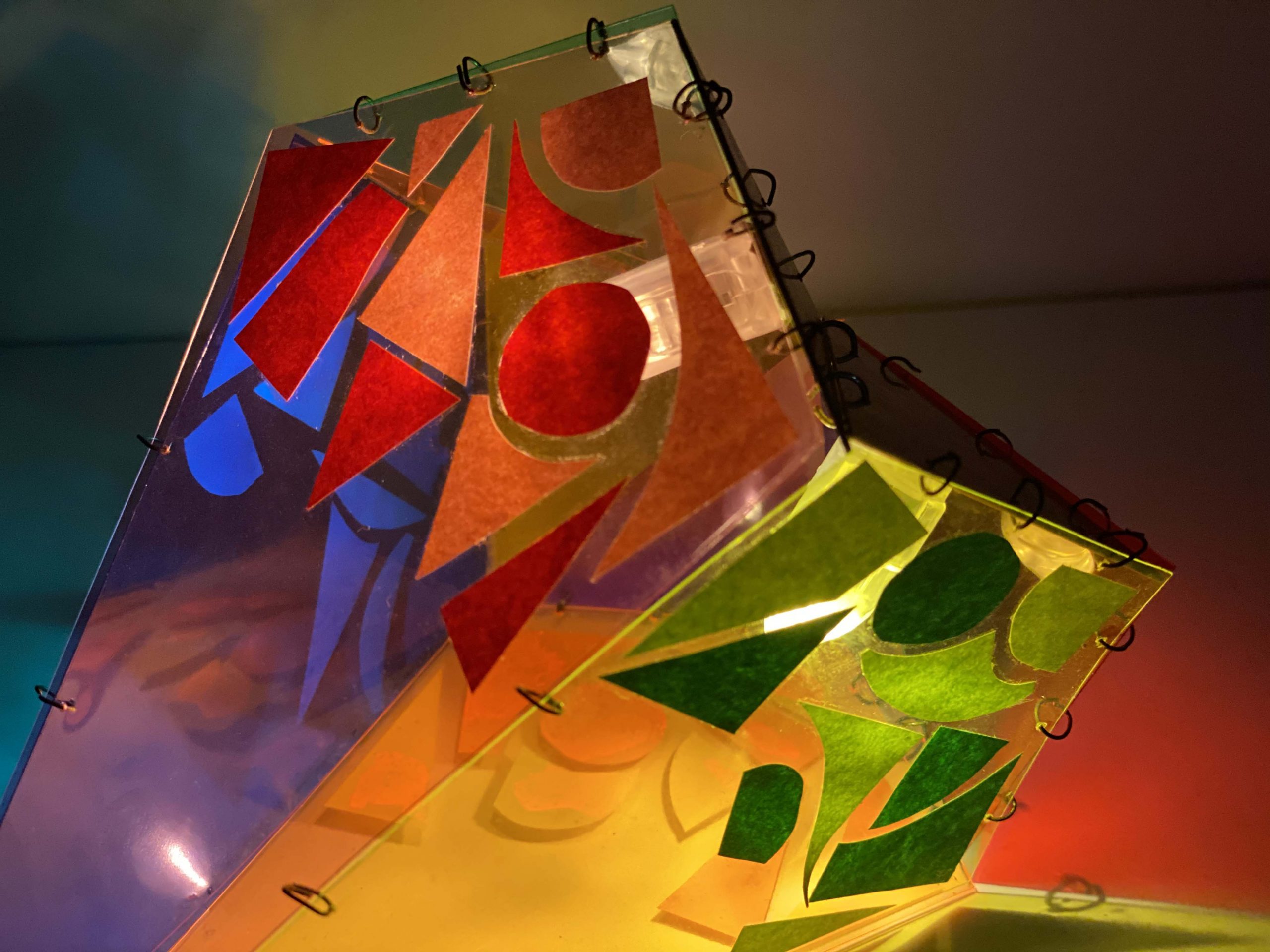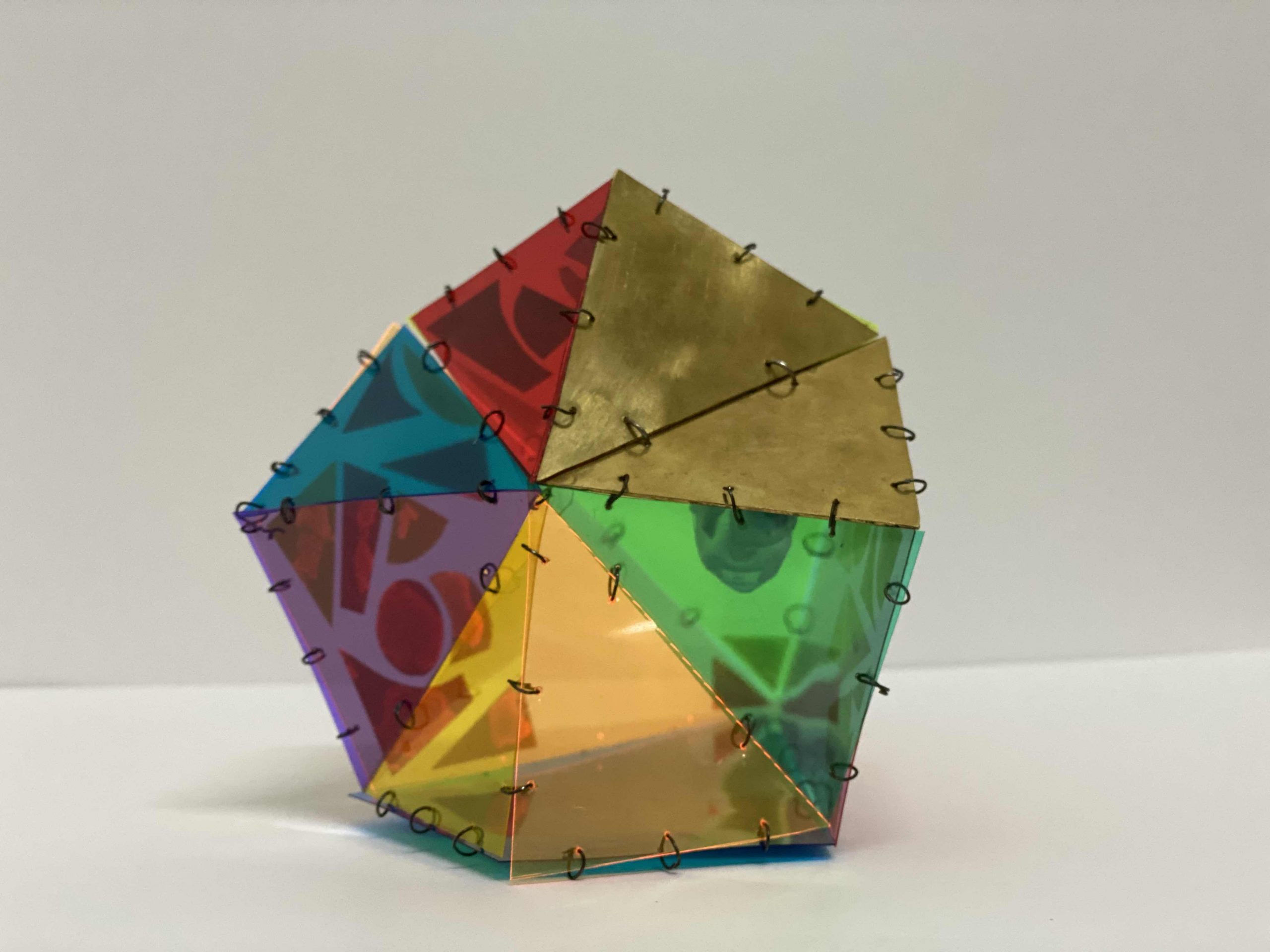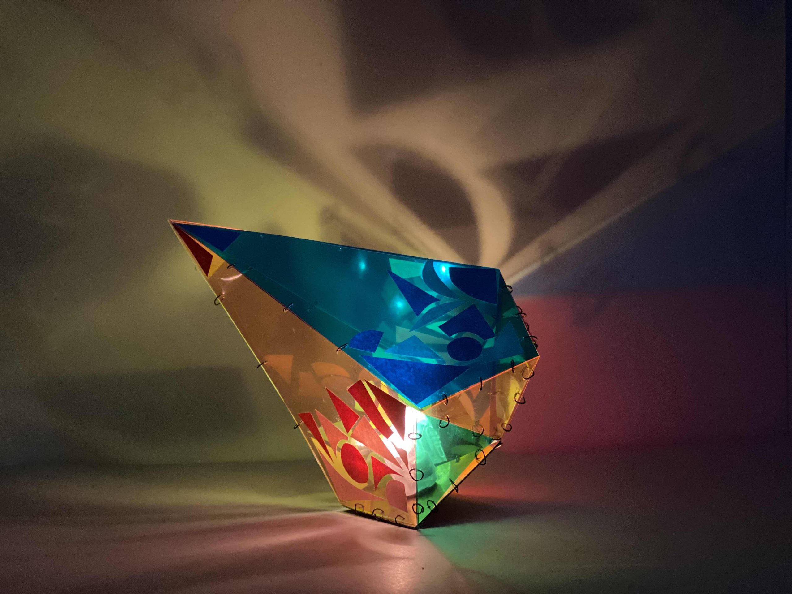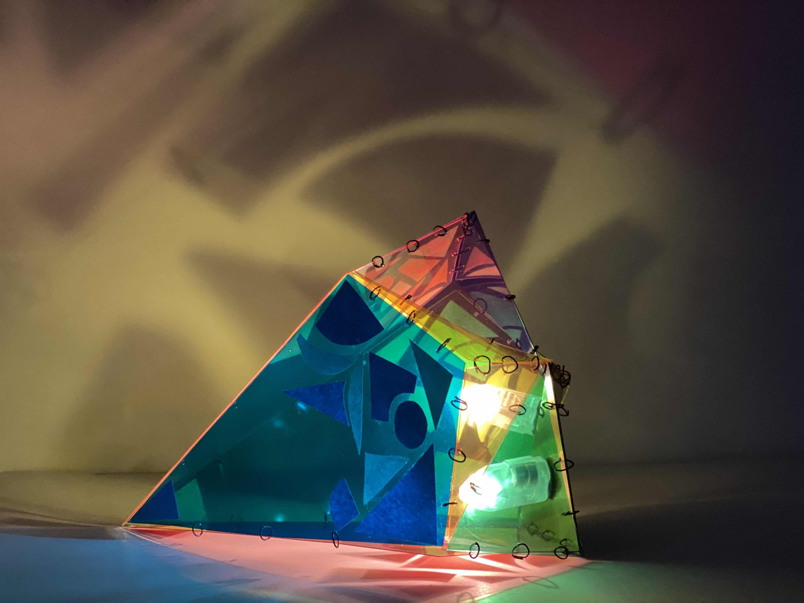 This piece is an exercises for us to design and construct a polyhedral form that does not belong to regular polyhedral forms.The rst thing in my head when I hear the word “polyhedral” is crystal. They are shining and fabulous under the light. I also inspired by the stained glass which shows different colors when the light come through it. The materials I used for this project are brass, plastic sheets and iron wires. Dreams are colorful and full of strange things. I think The colored plastic polyhedral creates amazing effect in the dark when light comes through it, just like our dreams at night, colorful and brings us imagination. The brass part at the bottom is used to make the whole sculpture stable and also creates a kind of retro style.