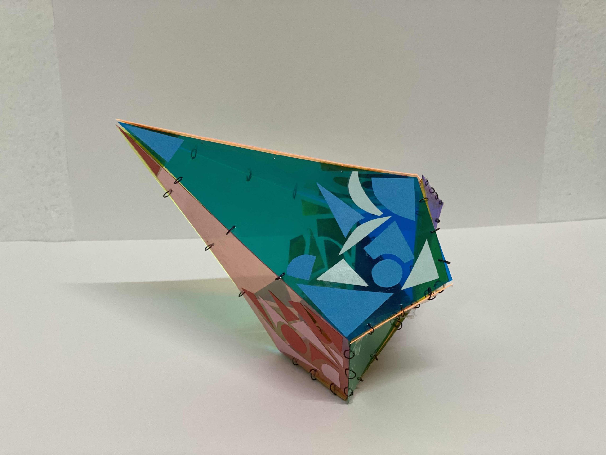 Prompt: In this project, we are asked to design and construct a polyhedral form using two durable planar materials. Whether the structure is closed or open, there should be something inside the polyhedral form.