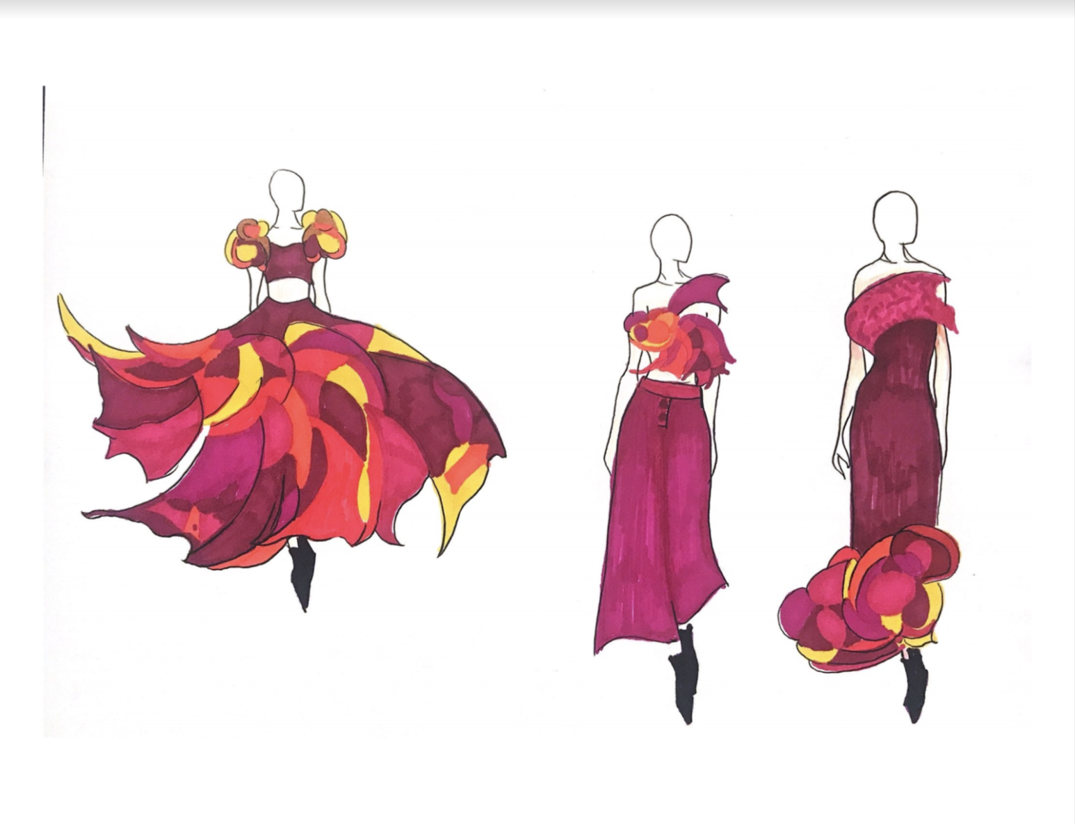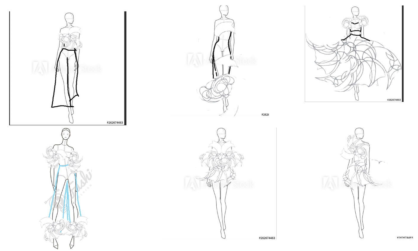 I kept the original color palette I did and decided to created three looks with one set of color from that palette and another three looks with other set of color. After the color decision is done, I cut out the shape I created from that nature object, then I scanned it and put on photoshop. I re-arrange and play with that shape in photoshop to see how can those shapes made into garments. After several looks I did, I chose six looks that I am most satisfied with, then I draw them down in my Bristol pad and color it with marker and gauche paints. All the colors and the shapes I used to created my collection are all from the nature study project I did.