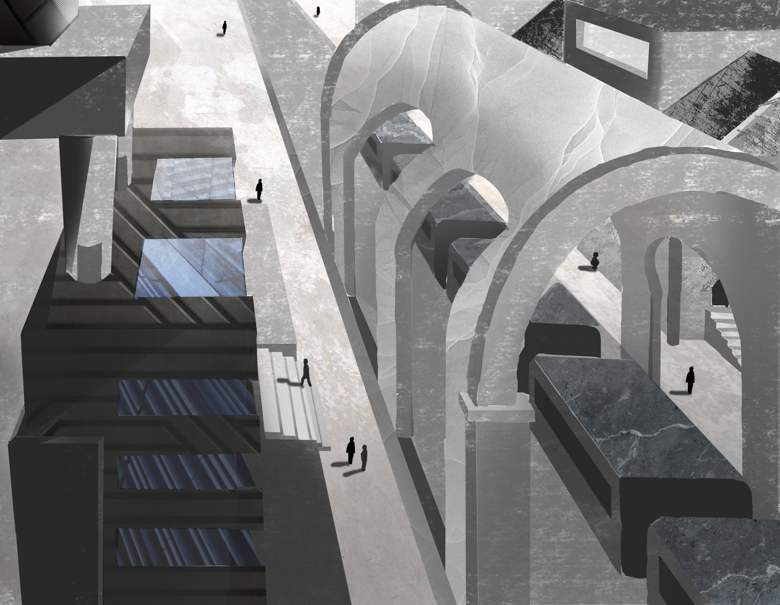 This project was based on an analysis we did in class regarding the different types of perspectives we learned. We then chose one that we liked and added our own style along with an analysis of an actual building structure. The goal was to create an artwork that reflects our understanding of perspective. I went through many stages of sketching until I came up with a landscape that I liked. Then I took it into Illustrator and applied different textures to bring out my linework.