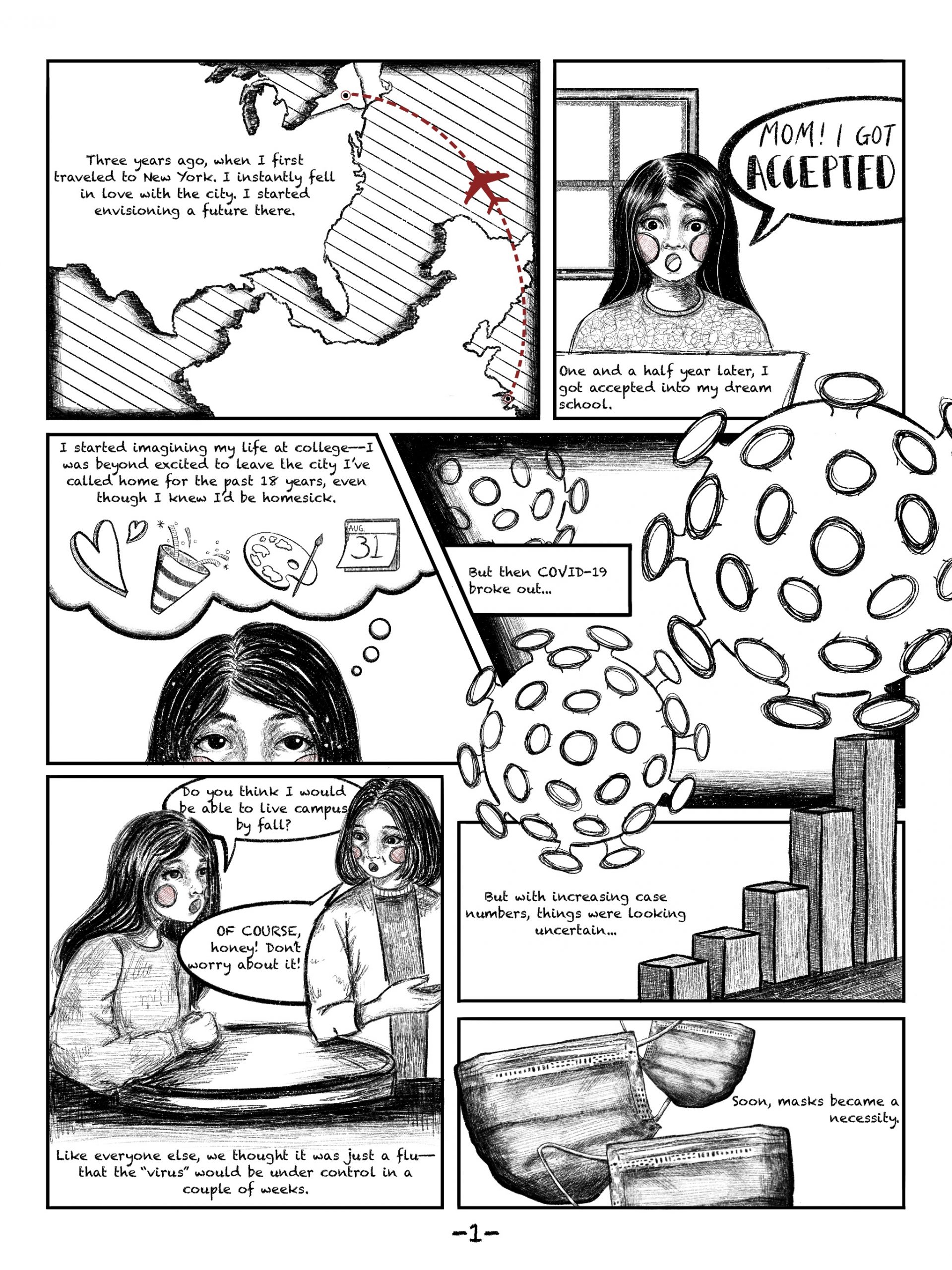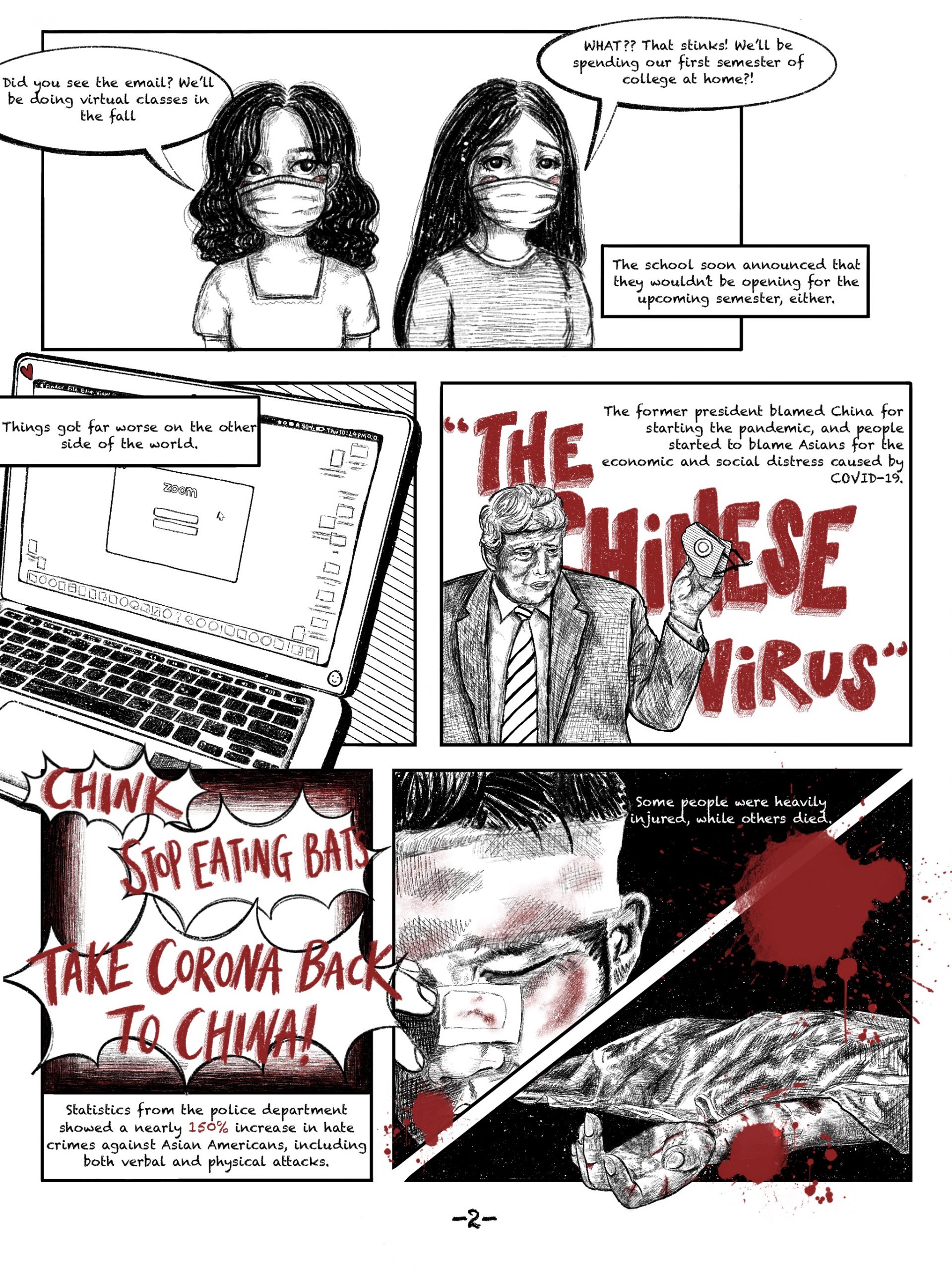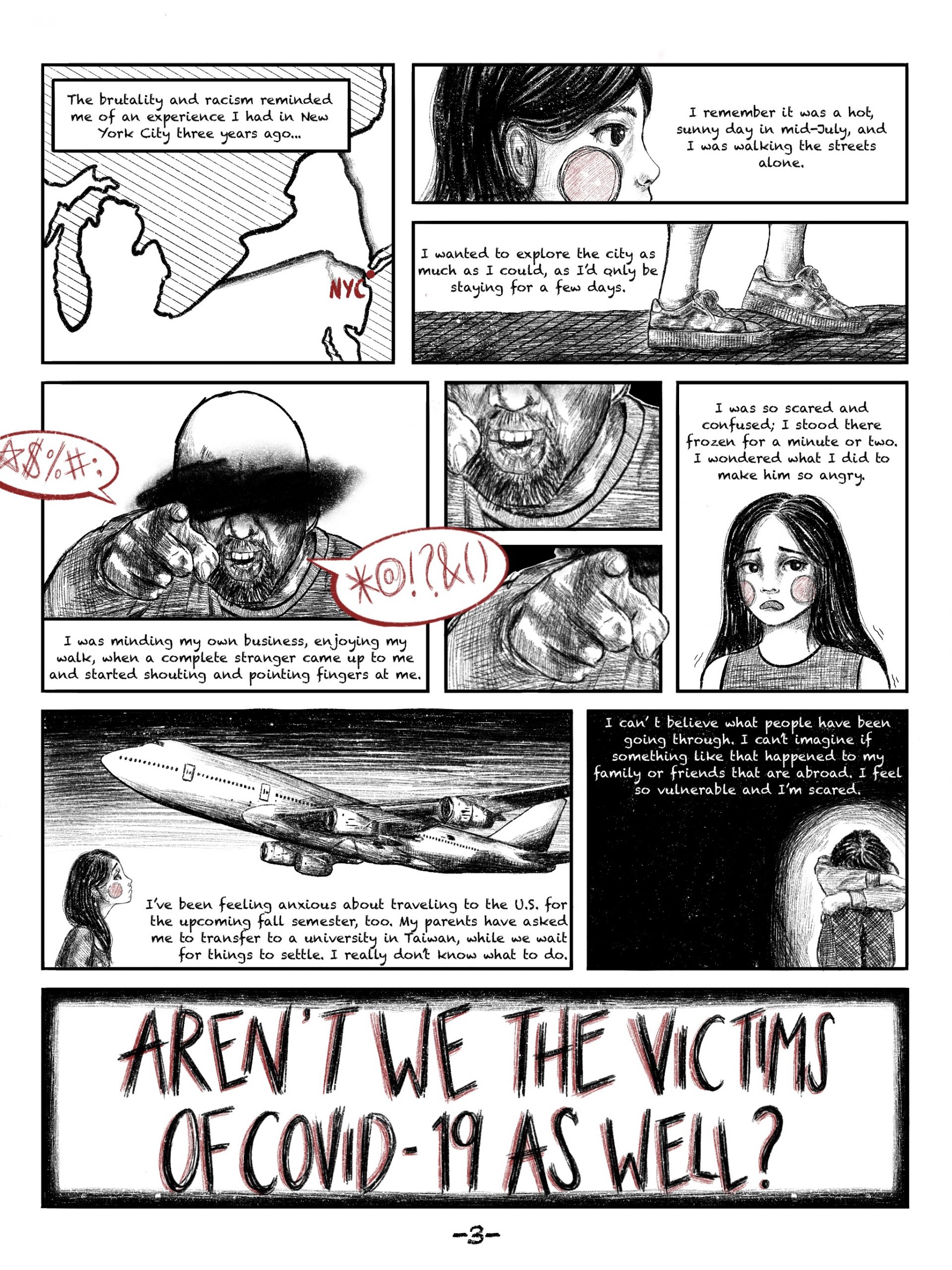 The amount of anti-Asian hate crimes has been rising ever since the start of COVID-19. Through the comic, I wanted to raise awareness among the public and share my point of view as an Asian student that’s about to travel abroad seeking education.