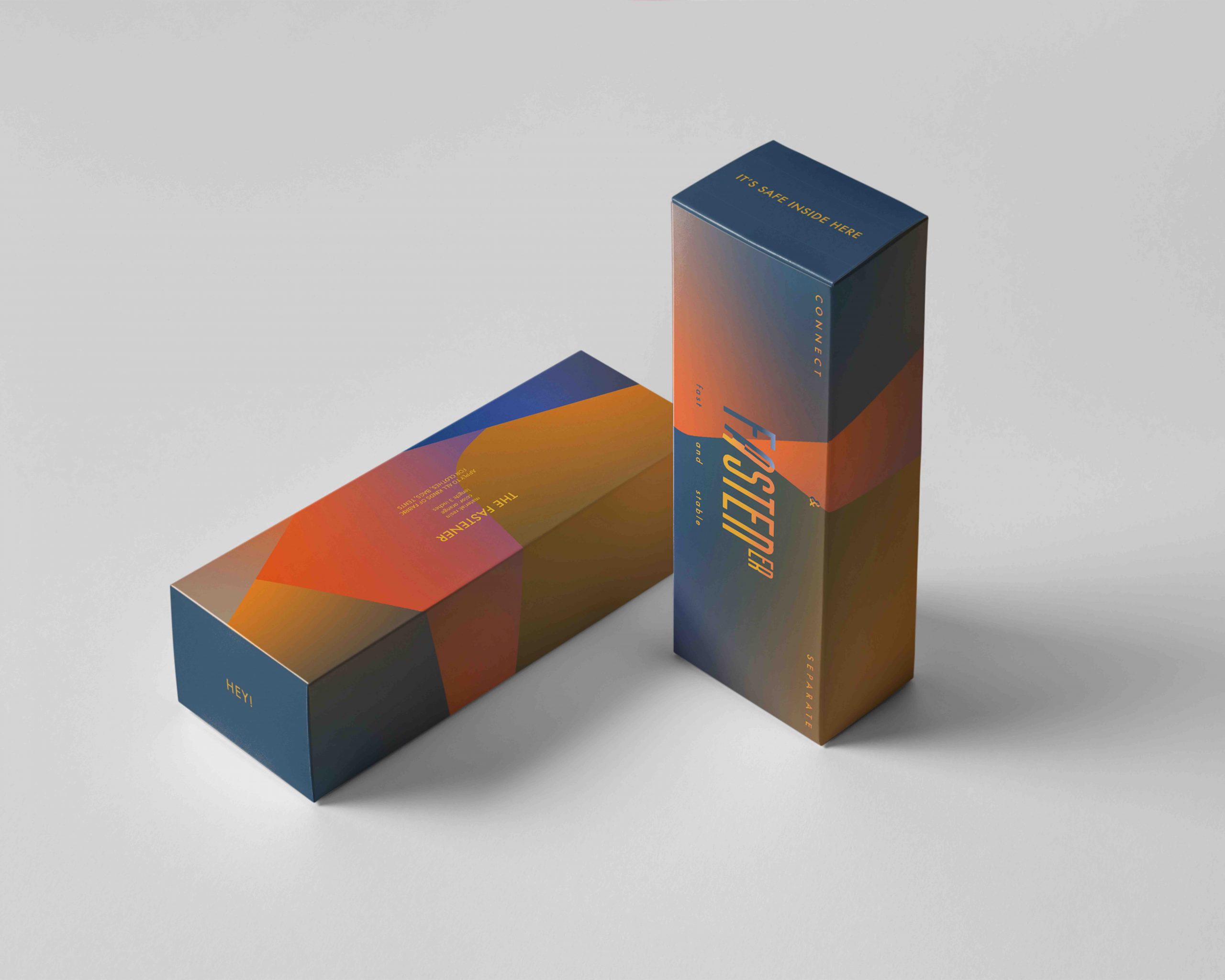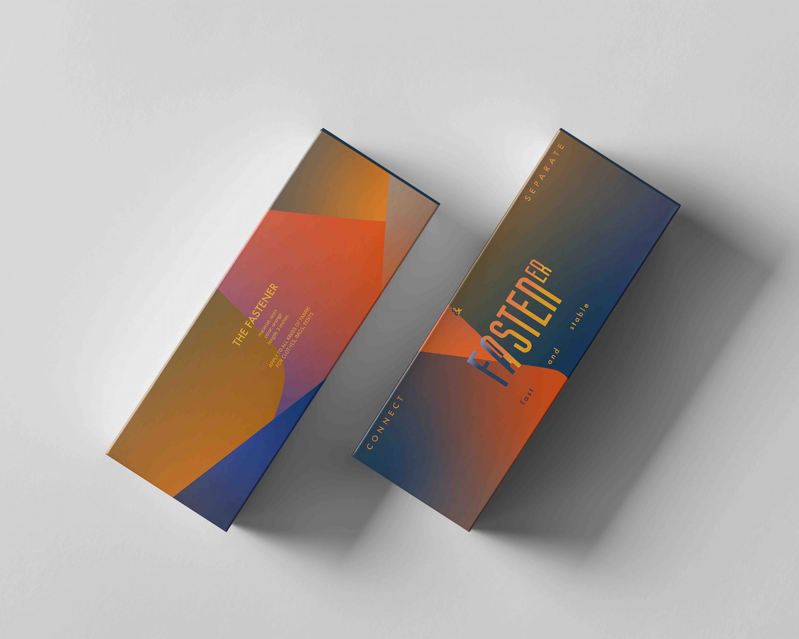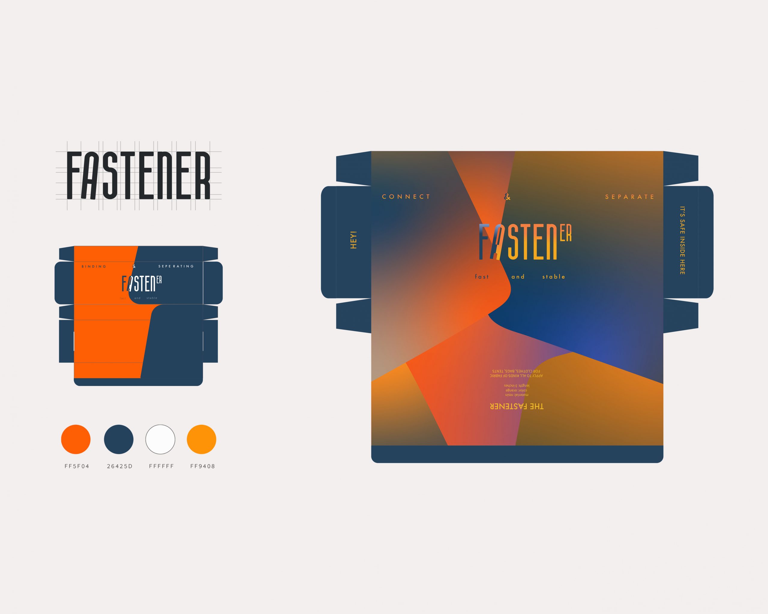 I named the packaging as Fastener to refer to what is inside the packaging. Orange and dark blue are the main colors for this packaging, in which can effectively provide senses of softness and rigidity simultaneously.