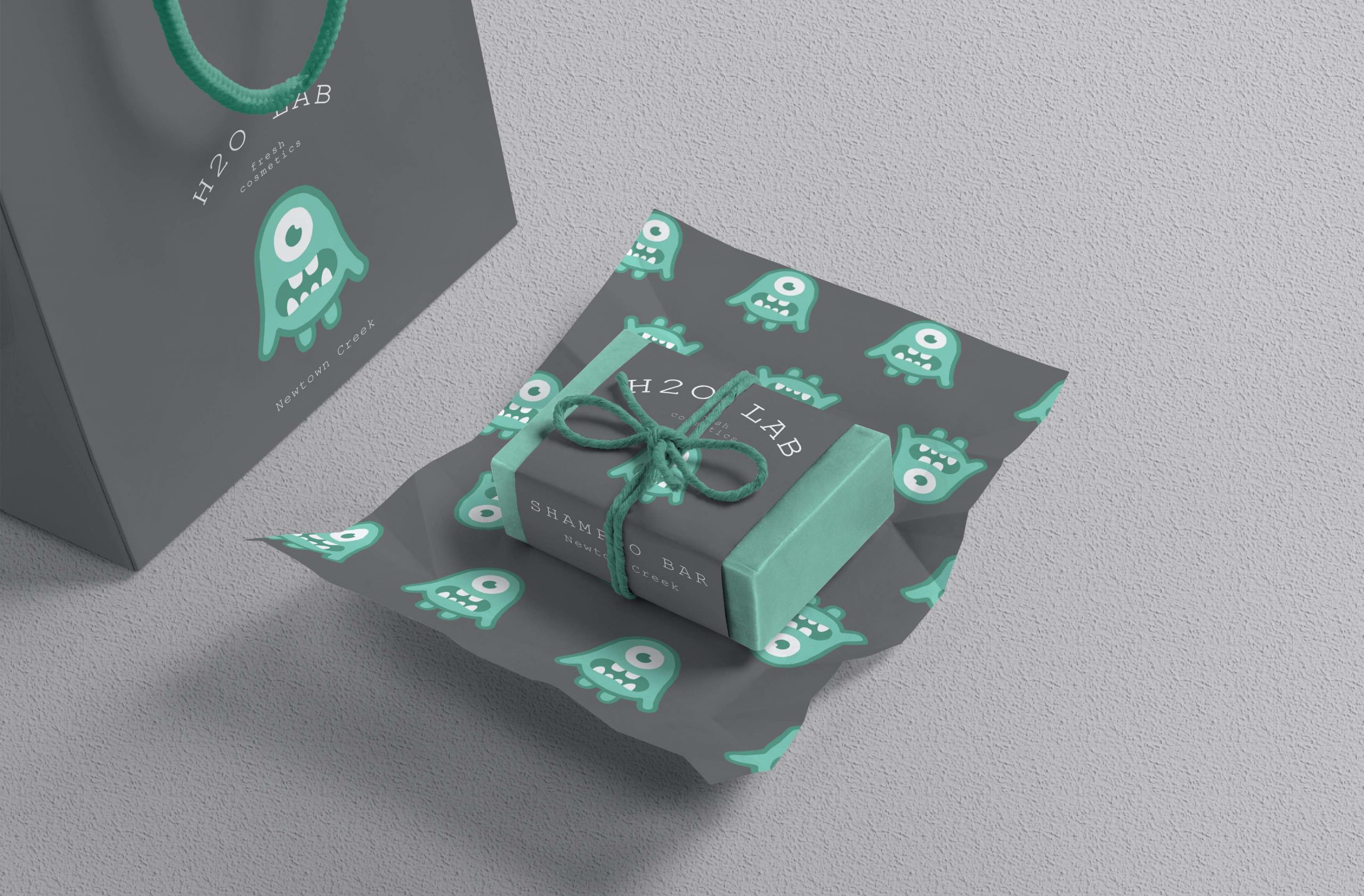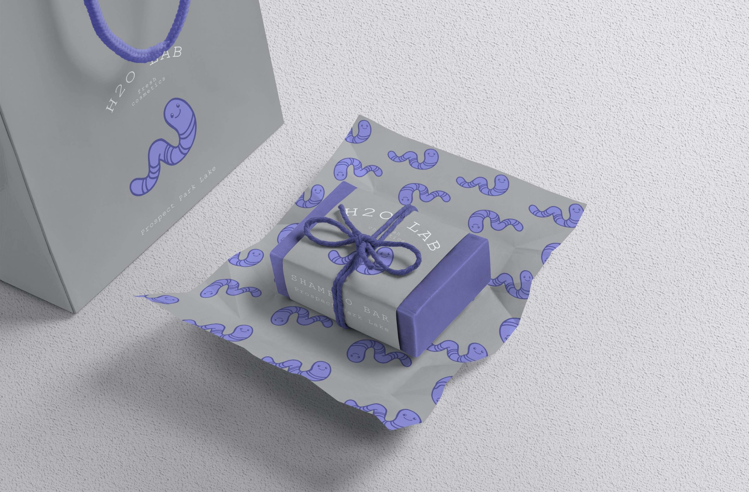 I created a cartoon character with each color to represent the water system of that location or source. For bottled water, I created a turquoise gummy bear to indicate the cleanness. For Prospect Park lake, I created a blue earthworm to show the natural environment. For Gowanus Canal and Newton Creek, I created a purple ghost and a green monster to imply the heavy pollution of these two sources. Thus, the products and packagings are more novel and intriguing for customers and can make them rethink the problem of water pollution. Moreover, All the packagings will be made of recycled paper and biodegradable materials. On the other side of the wrapping paper, there will be introduction about this collection, explaining how the colors came from and how they reflected the pollution levels of NYC water sources.