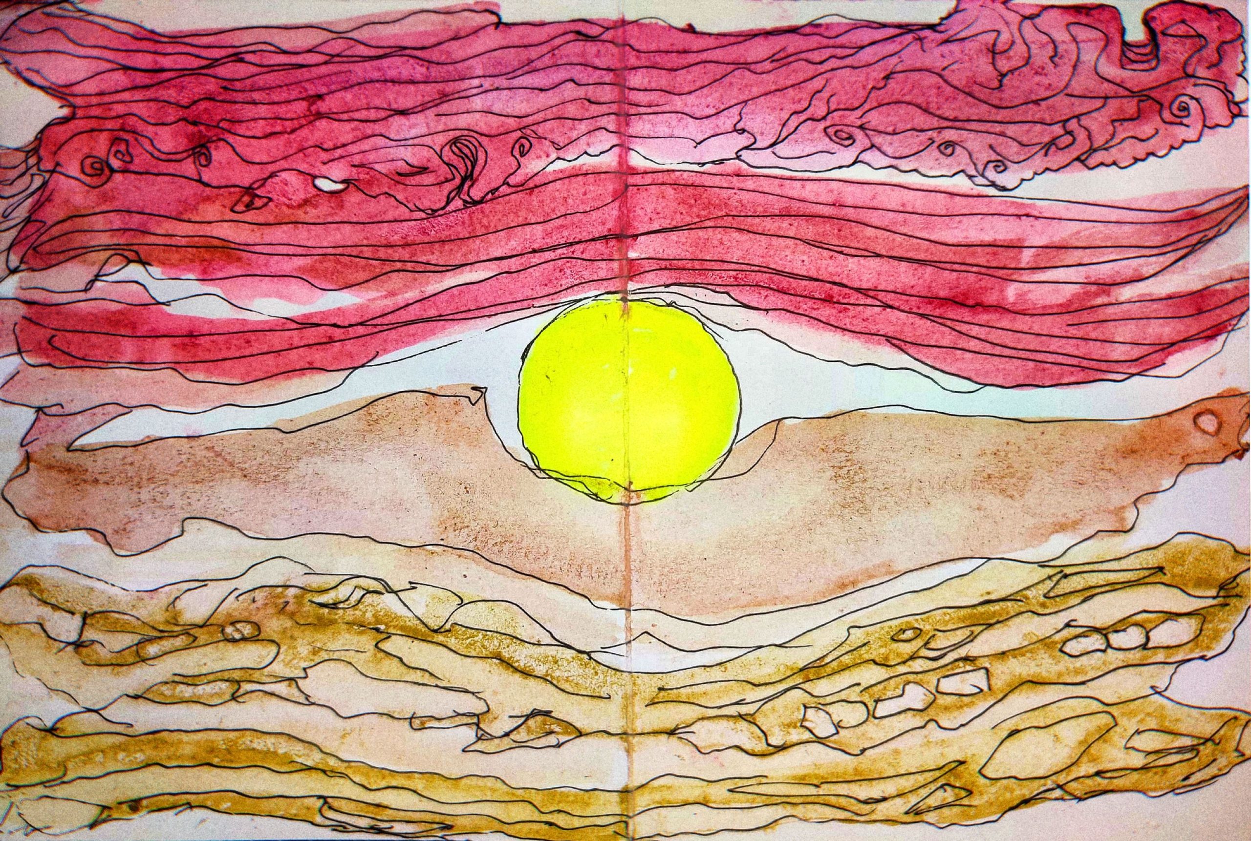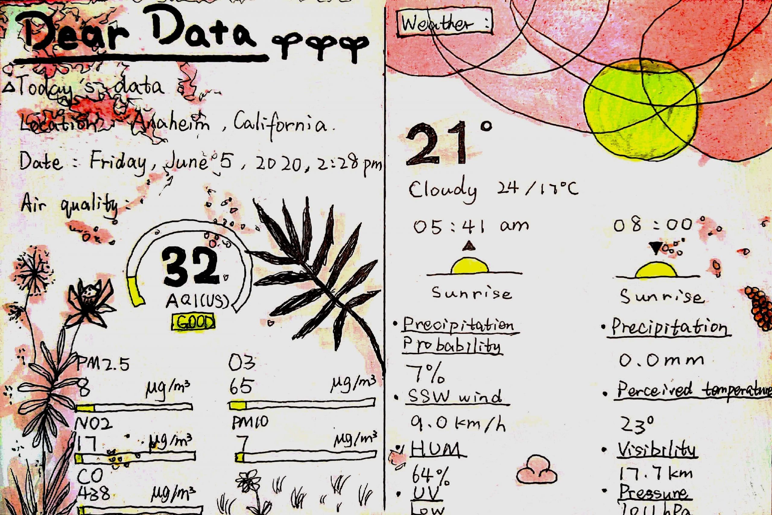 In my postcard, I paid attention on the climate change, such as temperature, air quality or SSW wind. Then record all the data from one location on the front of my postcard. For the back I did a drawing of a view of sunset with natural watercolor pigments that I made from flower and plants.