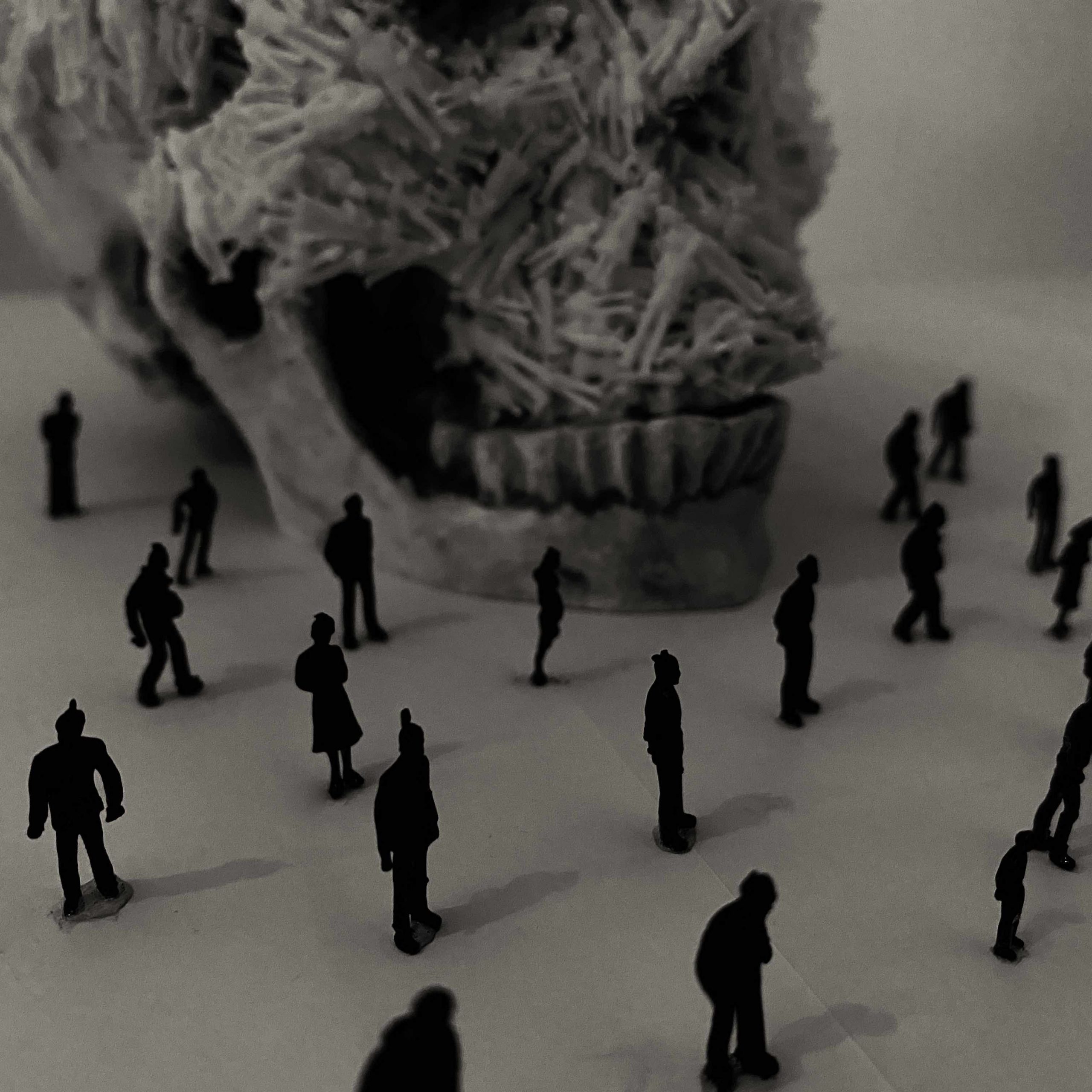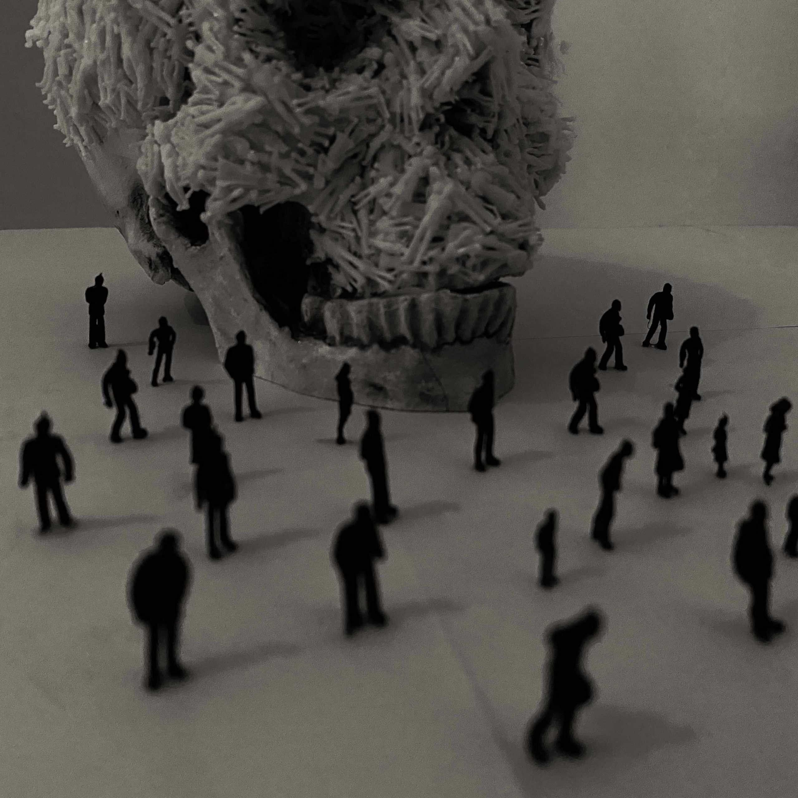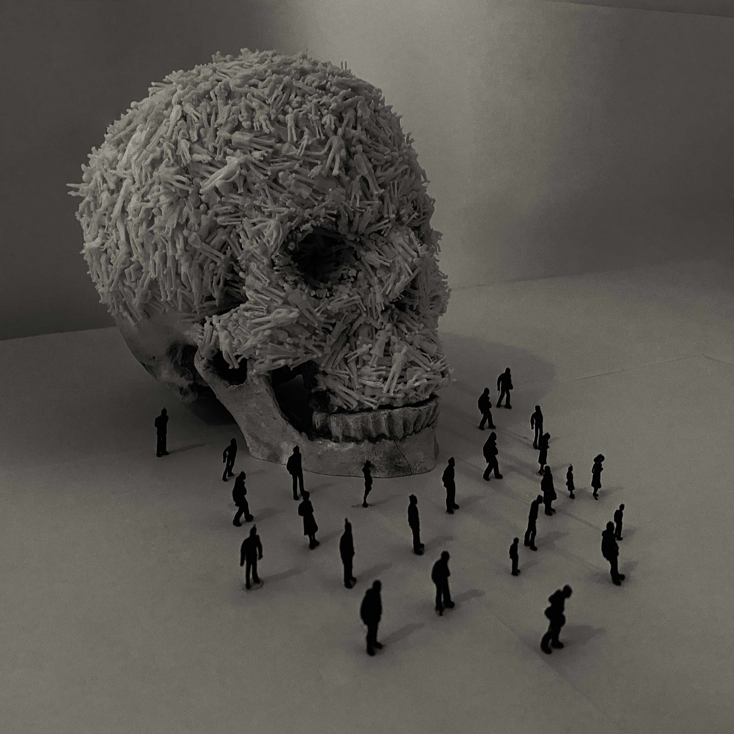 Human skulls are the most straightforward way for people to sense the somberness and the brutality of the violence that have been done throughout the progress of civilization. I decided to use small white unpainted architectural 1:100 scale model figures to cover the skull, implying that a society’s prosperity is built on tons of dead bodies.