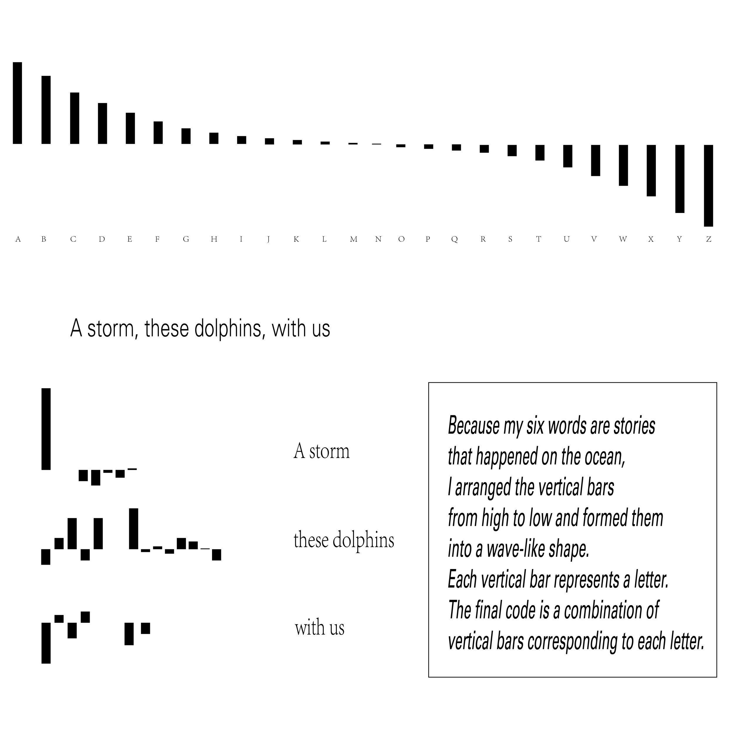 Because my six words are stories that happened on the ocean, I arranged the vertical bars from high to low and formed them into a wave-like shape. Each vertical bar represents a letter. The final code is a combination of vertical bars corresponding to each letter. The final poster used the stacking of words to create a sense of disorder. But when we decipher the code, we can clearly read the meaning of the text. At the same time, I think this design can give the viewer a sense of electronics.
