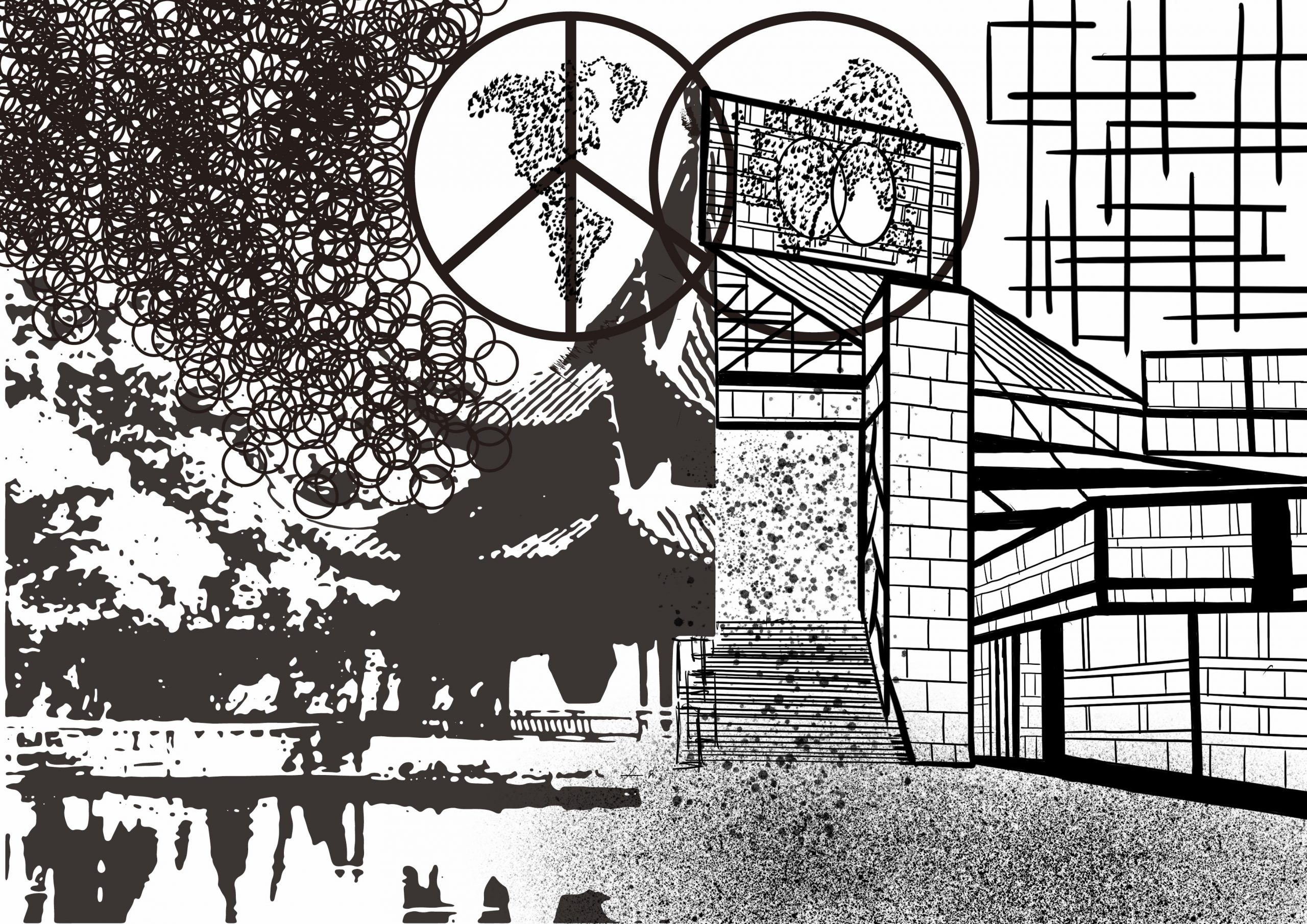 In the left half of the picture, I used Adobe Illustrator to draw an electronic version of the 500- year-old traditional Garden building – Humble Administrator’s Garden in Suzhou. The ink and wash silhouette painting has a more distinctive texture. At the same time, the repetitive circle pattern on the top is inspired by the window silhouette design of garden architecture, which is a relatively special window pattern design. Repeated circles form different structures inside, creating new patterns that are elegant but also contain unity. The right half of the picture is presented by hand drawing. I used Pigma Archival Ink Pen to depict some features of the building. The building selected on the right is my high school, which represents the place where all my dreams started. It also expresses that every day of my life here is my beautiful memory and my longing for the future. This modern geometric building was designed by the design team of the world-famous architect, Leoh Ming Pei. The building itself is a fusion of the curvilinear design elements of the eastern elegant garden style and the strong geometric lines of the western architectural design. Like the glass pyramid redesigned by the architect himself for the Louvre in France, it represents the past and the future. I use the geometric squares and lines drawn by ink pen to show the integration between the buildings. At the same time, splashing ink is used on the bottom background to show a Chinese style beauty and enrich the overall picture. The peace symbols and the world map at the top of the screen also represent a utopian vision of a peaceful life for people to unite world in the future.