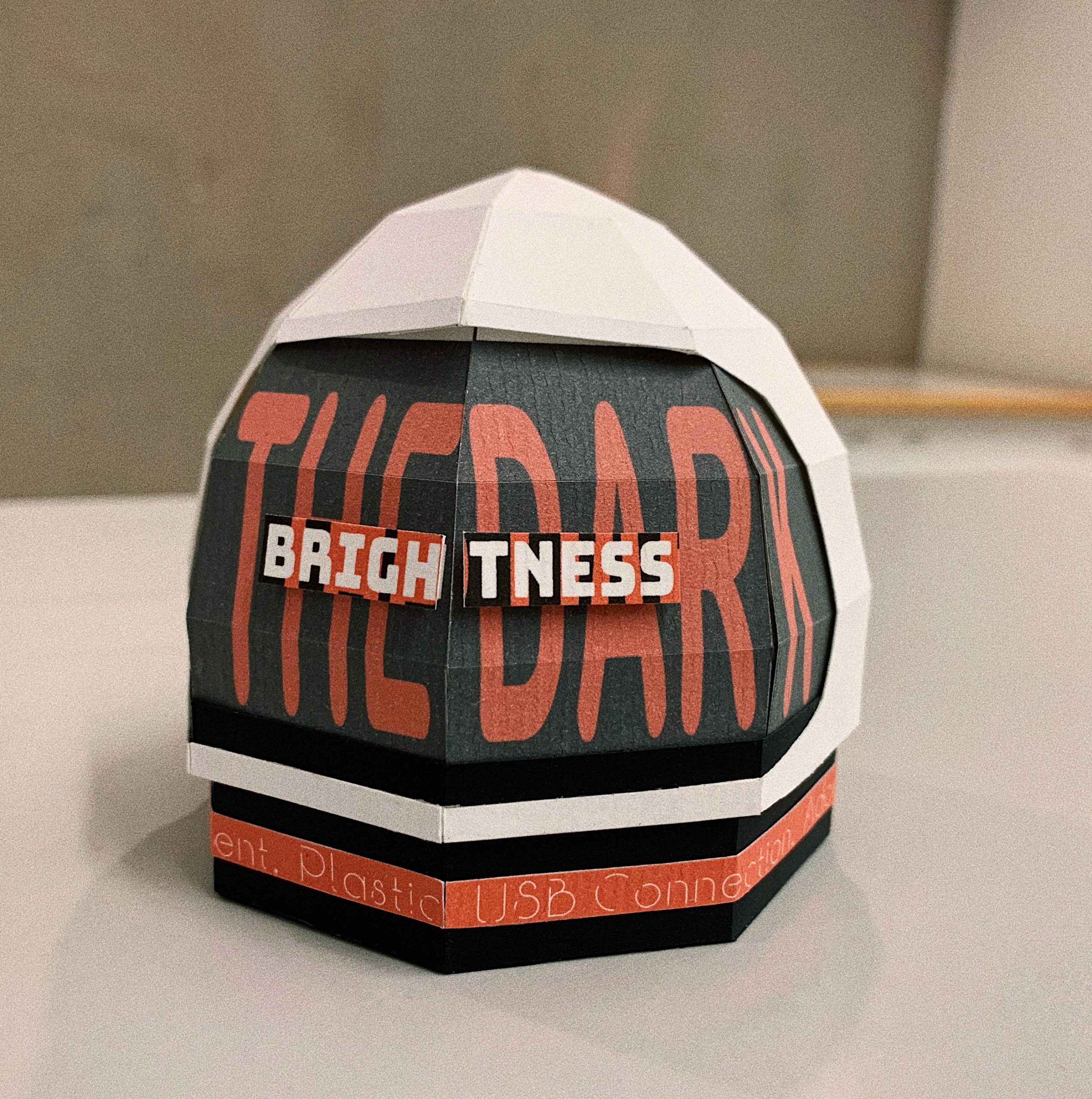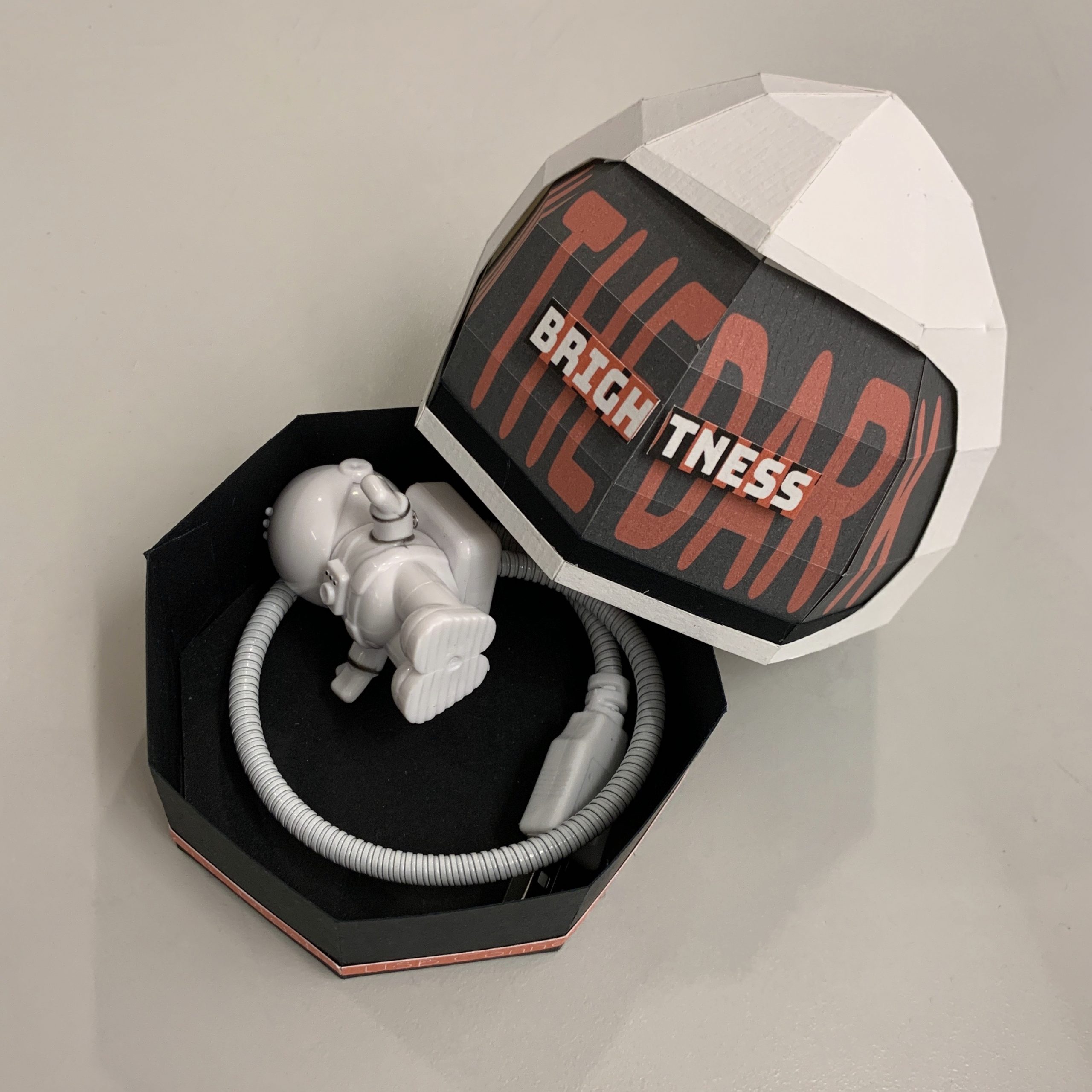This project I’m designing the packaging for an object that I think is a good design. My chosen object is a small USB light in the shape of an astronaut. It is small and convenient. It can be plugged into a personal laptop and used as a night light when someone is working in the dark and occasionally needs to read a document or anything in addition to the computer screen. I adopted the helmet shape of the astronaut and incorporated colors from space posters in the 1950s which is the period of space and technological advancements. I divided the semi-sphere into eight separate pieces in order to construct the shape using rigid cardboard paper, and I added the black parts as a second layer underneath to make it more dimensional. The descriptors are incorporated into the orange stripe around the box. The main purpose of this object is emphasized through the extended text “brightness” in the center of the helmet.