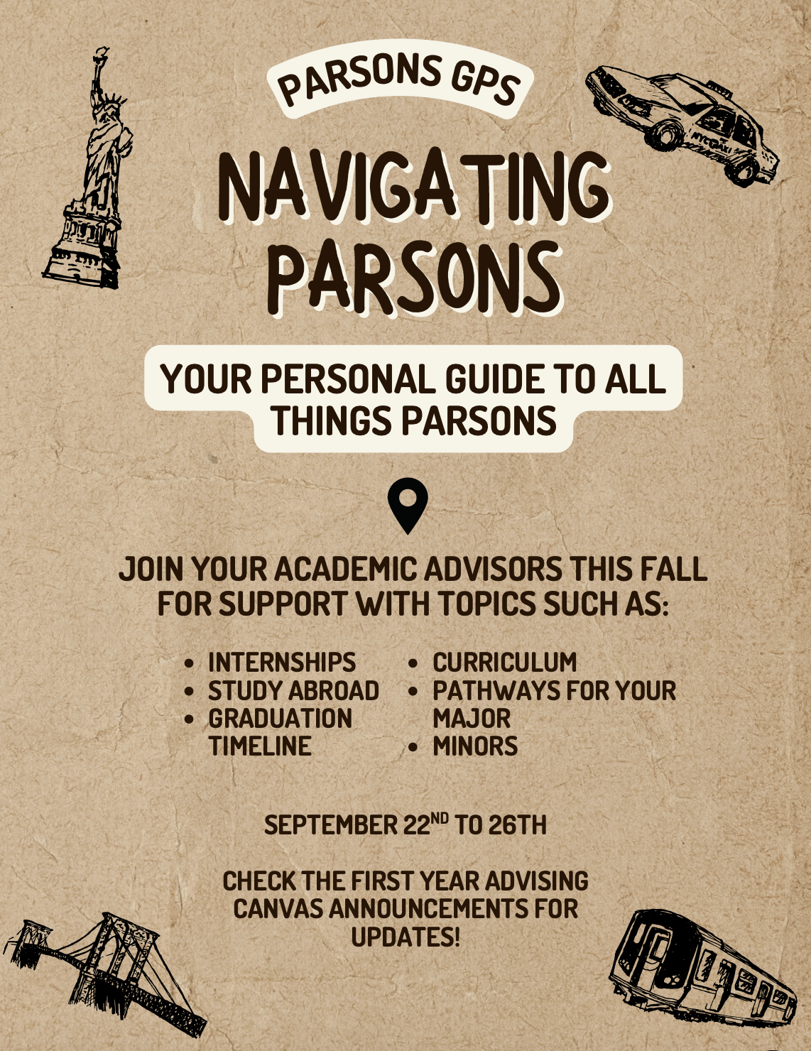 Join us for ‘Parsons GPS: Navigating Parsons’ from September 22nd-26th! Navigating Parsons is a series of interactive virtual workshops where you will receive major-specific information regarding when to study abroad, intern, declare a minor, what classes you’ll be taking the next 4 years and more! There will be an opportunity to connect with other students in your major and chat with your Academic Advisor in breakout rooms in the second half of the meeting!