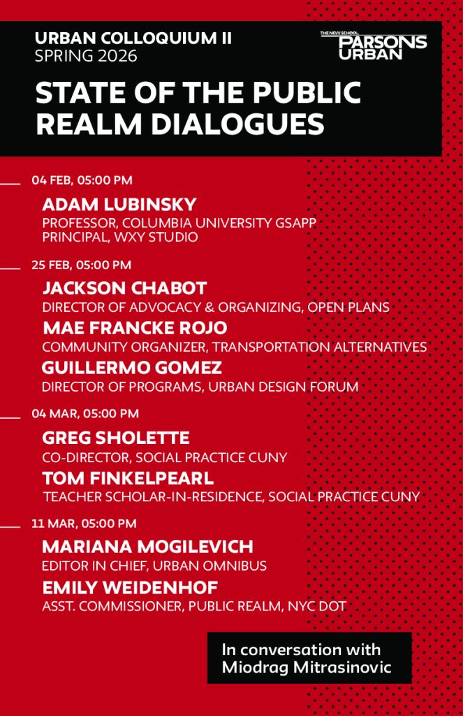 The MS Design and Urban Ecologies Urban Colloquium II Spring 2006 Series, State of the Public Realm, coordinated by Miodrag Mitrašinović, convenes students, practitioners, and civic leaders to critically examine the shifting conditions of public space in contemporary cities. The series explores how political, social, ecological, and economic forces shape the production, governance, and experience of the public realm. Through lectures and discussions, it foregrounds questions of access, justice, participation, and collective life, positioning the public realm as a vital site for democratic practice and urban transformation.