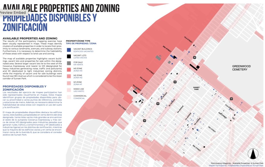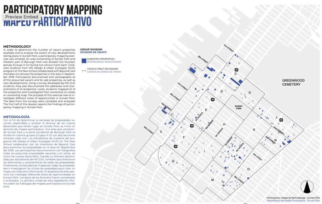 Besides housing, this project also focused on the role of women in urban practices transforming communities. Students considered the leadership role of Beyond Care members in the community and worked closely with them throughout the semester. The outcome of this project included a participatory vacancy survey that assisted to identify potential properties to turn into cooperative housing and the design of a number of scenarios for the development of a housing cooperative in Sunset Park considering local plans, zoning, and available programs and funding opportunities for the implementation of such proposals.